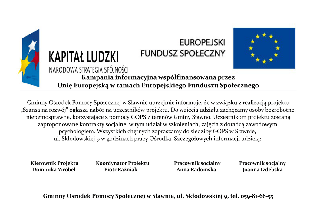 Kampania informacyjna współfinansowana przez Unię Europejską w ramach Europejskiego Funduszu Społecznego Gminny Ośrodek Pomocy Społecznej w Sławnie uprzejmie informuje, że w związku z realizacją projektu „Szansa na rozwój” ogłasza nabór na uczestników projektu. Do wzięcia udziału zachęcamy osoby bezrobotne, niepełnosprawne, korzystające z pomocy GOPS z terenów Gminy Sławno. Uczestnikom projektu zostaną zaproponowane kontrakty socjalne, w tym udział w szkoleniach, zajęcia z doradcą zawodowym, psychologiem. Wszystkich chętnych zapraszamy do siedziby GOPS w Sławnie, ul. Skłodowskiej 9 w godzinach pracy Ośrodka. Szczegółowych informacji udzielą: Kierownik Projektu Dominika Wróbel Koordynator Projektu Piotr Raźniak Pracownik socjalny Anna Radomska Pracownik socjalny Joanna Izdebska Gminny Ośrodek Pomocy Społecznej w Sławnie, ul. Skłodowskiej 9, tel. 059-81-66-55