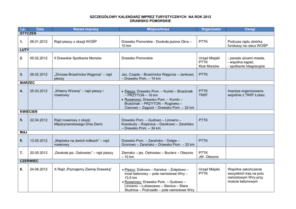 SZCZEGÓŁOWY KALENDARZ IMPREZ TURYSTYCZNYCH NA ROK 2012 DRAWSKO POMORSKIE Lp. Data STYCZEŃ Nazwa imprezy Miejsce/trasa Organizator Uwagi 08.01.2012 Rajd pieszy z okazji WOŚP Drawsko Pomorskie - Dookoła jeziora Okra – 10 km PTTK Podczas rajdu zbiórka funduszy na rzecz WOŚP 2. 05.02.2012 II Drawskie Spotkania Morsów Drawsko Pomorskie Urząd Miejski PTTK Klub Morsów - parada ulicami miasta, - wspólna kąpiel, - spotkanie integracyjne 3. 26.02.2012 „Zimowa Brzeźnicka Węgorza” – rajd pieszy Jez. Czaple – Brzeźnicka Węgorza – Jankowo – Drawsko Pom. – 10 km PTTK „Witamy Wiosnę” – rajd pieszy i rowerowy Pieszy: Drawsko Pom. – Kumki – Brzeźniak – PRZYTOŃ – 16 km Rowerowy: Drawsko Pom. – Kumki – Brzeźniak – PRZYTOŃ – Rogówko – Cianowo – Zagozd – Drawsko Pom. – 32 km PTTK TKKF 22.04.2012 Rajd rowerowy z okazji Międzynarodowego Dnia Ziemi Drawsko Pom. – Gudowo – Linowno – Kosobudy – Rzęśnica – Darskowo – Zarańsko – Drawsko Pom. – 34 km PTTK 6. 13.05.2012 „Majówka na dwóch kółkach” – rajd rowerowy Drawsko Pom. – Zarańsko – Dołgie – Gronowo – Zarańsko – Drawsko Pom. – 32 km PTTK 7. 20.05.2012 „Dookoła jez. Ostrowiec” – rajd pieszy Ziemsko – jez. Ostrowiec – Bucierz – Oleszno – 10 km PTTK JW. Oleszno X Rajd „Poznajemy Ziemię Drawską” Pieszy: Dzikowo – Karwice – Żołędowo – most betonowy – pole namiotowe Wiry – 13,5 km Rowerowy: Drawsko Pom. – Gudowo – Linowno – Lubieszewo – Sienica – Stara Studnica – Poźrzadło – pole namiotowe Wiry Urząd Miejski PTTK 1. LUTY MARZEC 4. 25.03.2012 Impreza organizowana wspólnie z TKKF Łobez. KWIECIEŃ 5. MAJ CZERWIEC 8. 24.06.2012 Wspólne zakończenie wszystkich tras na polu namiotowym Wiry przy moście betonowym – Konotop – Drawsko Pom. – 55 km Spływ kajakowy: Jez. Lubie – most betonowy – pole namiotowe Wiry – 12 km LIPIEC 9. 08.07.2012 „Rowerowy Poligon” – rajd rowerowy Drawsko Pom. – Oleszno – Zły Łęg – droga południowa - Bucierz – Oleszno – Drawsko Pom. – 50 km PTTK JW. Oleszno 10. 22.07.2012 Rajd pieszy Szlakiem Jezior Drawskich Rzęśnica – Kosobudy – Linowno – Gudowo – Drawsko Pom. – 16,5 km PTTK „Bagno Karsibór” – rajd rowerowy Drawsko Pom. – Rydzewo – Łabędzie – Karsibór – jez. Klęckie – Borne – Zarańsko – Drawsko Pom. – 52 km PTTK X Rajd Rodzinny Pieszy: Drawsko Pom. – Gudowo – Jędrkowe Zakole – Drawsko Pom. – 14 km Rowerowy: Drawsko Pom. – Kumki – Brzeźniak – Wiewiecko – Ginawa – Woliczno – Mielenko – Drawsko Pom. – 41 km Spływ kajakowy: rzeka Drawa na odcinku od Dalewa do Jędrkowego Zakola – 13 km Urząd Miejski Gminna Komisja Rozwiązywania Problemów Alkoholowych PTTK Wspólne zakończenie wszystkich tras na polu namiotowym Jędrkowe Zakole. „Iński Park Krajobrazowy” - rajd pieszy i rowerowy Pieszy: okolice Ińska – 10 km Rowerowy: Drawsko – Kumki – Brzeźniak – Storkowo – Ińsko – Studnica – Ziemsko – Oleszno – Drawsko Pom. – 55 km PTTK, Stow. na rzecz Rozwoju Ińska Impreza organizowana wspólnie ze Stowarzyszeniem na rzecz rozwoju Ińska. „Podglądamy bobry” – rajd pieszy z okazji Święta Niepodległości Drawsko Pom. – Zarańsko – Dalewo – Drawsko Pom. – 12 km PTTK „Drawskie żwirownie” – pieszy rajd mikołajkowy Drawsko Pom. – Młynowo – żwirownia Mielenko – rzeka Drawa – Drawsko Pom. – 12 km PTTK SIERPIEŃ 11. 19.08.2012 WRZESIEŃ 12. 09.09.2012 PAŹDZIERNIK 13. 14.10.2012 LISTOPAD 14. 11.11.2012 GRUDZIEŃ 15. 09.12.2012