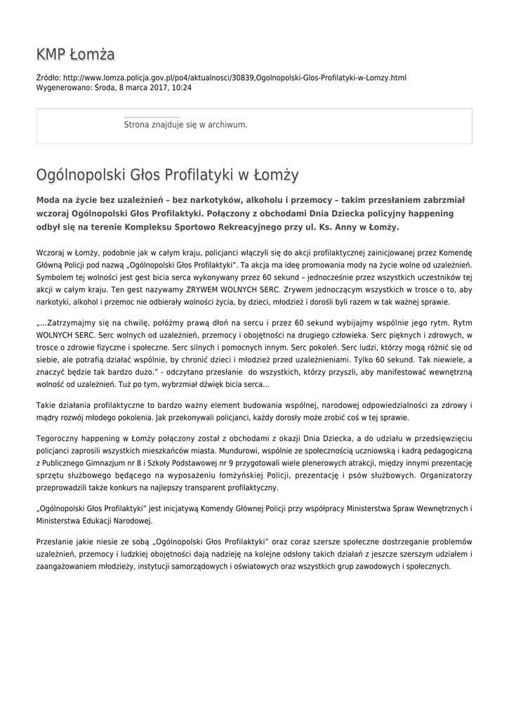 KMP Łomża Źródło: http://www.lomza.policja.gov.pl/po4/aktualnosci/30839,Ogolnopolski-Glos-Profilatyki-w-Lomzy.html Wygenerowano: Środa, 8 marca 2017, 10:24 Strona znajduje się w archiwum. Ogólnopolski Głos Profilatyki w Łomży Moda na życie bez uzależnień – bez narkotyków, alkoholu i przemocy – takim przesłaniem zabrzmiał wczoraj Ogólnopolski Głos Profilaktyki. Połączony z obchodami Dnia Dziecka policyjny happening odbył się na terenie Kompleksu Sportowo Rekreacyjnego przy ul. Ks. Anny w Łomży. Wczoraj w Łomży, podobnie jak w całym kraju, policjanci włączyli się do akcji profilaktycznej zainicjowanej przez Komendę Główną Policji pod nazwą „Ogólnopolski Głos Profilaktyki”. Ta akcja ma ideę promowania mody na życie wolne od uzależnień. Symbolem tej wolności jest gest bicia serca wykonywany przez 60 sekund – jednocześnie przez wszystkich uczestników tej akcji w całym kraju. Ten gest nazywamy ZRYWEM WOLNYCH SERC. Zrywem jednoczącym wszystkich w trosce o to, aby narkotyki, alkohol i przemoc nie odbierały wolności życia, by dzieci, młodzież i dorośli byli razem w tak ważnej sprawie. „…Zatrzymajmy się na chwilę, połóżmy prawą dłoń na sercu i przez 60 sekund wybijajmy wspólnie jego rytm. Rytm WOLNYCH SERC. Serc wolnych od uzależnień, przemocy i obojętności na drugiego człowieka. Serc pięknych i zdrowych, w trosce o zdrowie fizyczne i społeczne. Serc silnych i pomocnych innym. Serc pokoleń. Serc ludzi, którzy mogą różnić się od siebie, ale potrafią działać wspólnie, by chronić dzieci i młodzież przed uzależnieniami. Tylko 60 sekund. Tak niewiele, a znaczyć będzie tak bardzo dużo.” - odczytano przesłanie do wszystkich, którzy przyszli, aby manifestować wewnętrzną wolność od uzależnień. Tuż po tym, wybrzmiał dźwięk bicia serca... Takie działania profilaktyczne to bardzo ważny element budowania wspólnej, narodowej odpowiedzialności za zdrowy i mądry rozwój młodego pokolenia. Jak przekonywali policjanci, każdy dorosły może zrobić coś w tej sprawie. Tegoroczny happening w Łomży połączony został z obchodami z okazji Dnia Dziecka, a do udziału w przedsięwzięciu policjanci zaprosili wszystkich mieszkańców miasta. Mundurowi, wspólnie ze społecznością uczniowską i kadrą pedagogiczną z Publicznego Gimnazjum nr 8 i Szkoły Podstawowej nr 9 przygotowali wiele plenerowych atrakcji, między innymi prezentację sprzętu służbowego będącego na wyposażeniu łomżyńskiej Policji, prezentację i psów służbowych. Organizatorzy przeprowadzili także konkurs na najlepszy transparent profilaktyczny. „Ogólnopolski Głos Profilaktyki” jest inicjatywą Komendy Głównej Policji przy współpracy Ministerstwa Spraw Wewnętrznych i Ministerstwa Edukacji Narodowej. Przesłanie jakie niesie ze sobą „Ogólnopolski Głos Profilaktyki” oraz coraz szersze społeczne dostrzeganie problemów uzależnień, przemocy i ludzkiej obojętności dają nadzieję na kolejne odsłony takich działań z jeszcze szerszym udziałem i zaangażowaniem młodzieży, instytucji samorządowych i oświatowych oraz wszystkich grup zawodowych i społecznych. Zainstaluj wtyczkę Flash, aby zobaczyć odtwarzacz. PaT pobierz film - 25.5 MB Ocena: 5/5 (2) Tweetnij