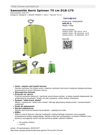 http://www.samspol.pl Samsonite Aeris Spinner 75 cm D18-175 kod produktu: D18-175 kategoria: Kategorie > BAGAŻ TWARDY > Aeris > Spinner 75 cm Producent: SAMSONITE 899,00 zł Waga: 4.8kg Opcje produktu: wybierz kolor:: 09 czarny szt.5 wybierz kolor:: 00 czerwony szt.5 wybierz kolor:: 31 Niebieski szt.5 Kod QR: Centr. zamek szyf.zamki boczne Zamek szyfrowy na środku wraz z dwoma zamkami bocznymi zwiększa bezpieczeństwo przewożonych przez Państwa rzeczy. Wewnętrzna kieszeń Przycisk na rączce Przycisk pozwala otworzyć i zamknąć aluminiową rączkę i w łatwy sposób dopasować do preferowanej wysokości. Kiedy nie jest używana, może zostać schowana. System "wide-track wheel" Wózki z systemem "wide-track wheel" oferują optymalną elastyczność, manewrowość i stabilność. Paski do pakowania Rączka pojedyncza Rączka jest przymocowana do produktu - pojedyncza tuba Kółka Kółka w wersji Spinner oferują możliwość maksymalnego manewru oraz wygodę prowadzenia wózka bagażowego. Wózek może być prowadzony na dwóch kółkach przy pomocy wyciąganej rączki lub też poziomo dzięki czterem kółkom. do wyboru kolory: czarny strona: 1/2 wydrukowano: 08-03-2017 http://www.samspol.pl/samsonite-aeris-spinner-75-cm-d18-175.html zielony czerwony pomarańczowy turkusowy żółty różowy niebieski Samsonite 18336 (D18-175) Aeris Spin. 75 strona: 2/2 wydrukowano: 08-03-2017 http://www.samspol.pl/samsonite-aeris-spinner-75-cm-d18-175.html