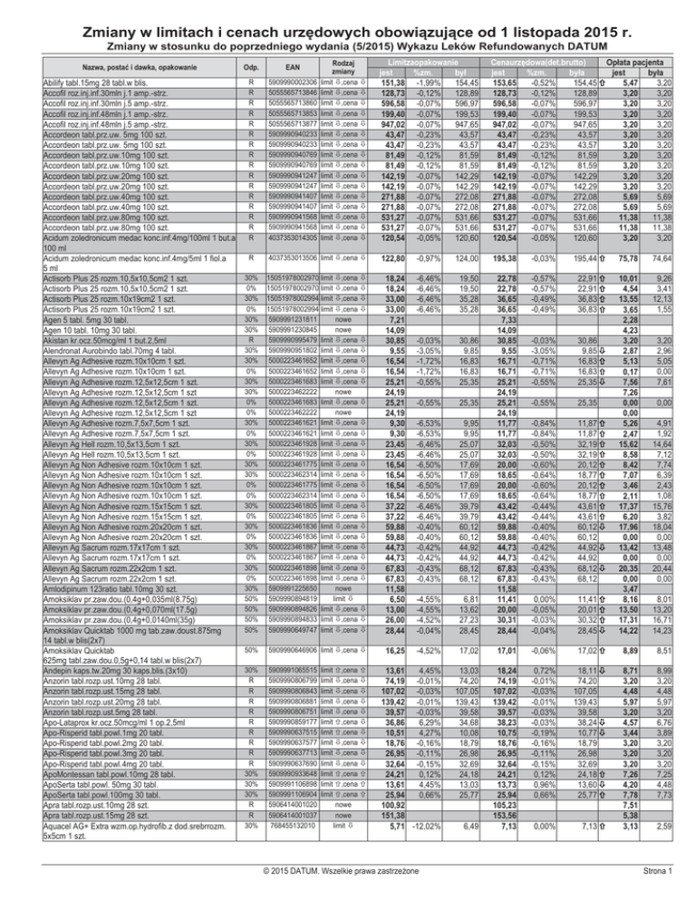 Zmiany w limitach i cenach urzędowych obowiązujące od 1 listopada 2015 r. Zmiany w stosunku do poprzedniego wydania (5/2015) Wykazu Leków Refundowanych DATUM Limitzaopakowanie jest %zm. był 151,38 -1,99% 154,45 128,73 -0,12% 128,89 596,58 -0,07% 596,97 199,40 -0,07% 199,53 947,02 -0,07% 947,65 43,47 -0,23% 43,57 43,47 -0,23% 43,57 81,49 -0,12% 81,59 81,49 -0,12% 81,59 142,19 -0,07% 142,29 142,19 -0,07% 142,29 271,88 -0,07% 272,08 271,88 -0,07% 272,08 531,27 -0,07% 531,66 531,27 -0,07% 531,66 120,54 -0,05% 120,60 Cenaurzędowa(det.brutto) Opłata pacjenta jest %zm. była jest była 153,65 -0,52% 154,45 × 3,20 5,47 128,73 -0,12% 128,89 3,20 3,20 596,58 -0,07% 596,97 3,20 3,20 199,40 -0,07% 199,53 3,20 3,20 947,02 -0,07% 947,65 3,20 3,20 43,47 -0,23% 43,57 3,20 3,20 43,47 -0,23% 43,57 3,20 3,20 81,49 -0,12% 81,59 3,20 3,20 81,49 -0,12% 81,59 3,20 3,20 142,19 -0,07% 142,29 3,20 3,20 142,19 -0,07% 142,29 3,20 3,20 271,88 -0,07% 272,08 5,69 5,69 271,88 -0,07% 272,08 5,69 5,69 531,27 -0,07% 531,66 11,38 11,38 531,27 -0,07% 531,66 11,38 11,38 120,54 -0,05% 120,60 3,20 3,20 4037353013506 limit Ø,cena Ø 122,80 -0,97% 124,00 195,38 -0,03% 195,44 × 75,78 74,64 30% 0% 30% 0% 30% 30% R 30% 30% 0% 30% 30% 0% 0% 30% 0% 30% 0% 30% 30% 0% 0% 30% 0% 30% 0% 30% 0% 30% 0% 30% 50% 50% 50% 50% 15051978002970 limit Ø,cena Ø 15051978002970 limit Ø,cena Ø 15051978002994 limit Ø,cena Ø 15051978002994 limit Ø,cena Ø 5909991231811 nowe 5909991230845 nowe 5909990995479 limit Ø,cena Ø 5909990951802 limit Ø,cena Ø 5000223461652 limit Ø,cena Ø 5000223461652 limit Ø,cena Ø 5000223461683 limit Ø,cena Ø 5000223462222 nowe 5000223461683 limit Ø,cena Ø 5000223462222 nowe 5000223461621 limit Ø,cena Ø 5000223461621 limit Ø,cena Ø 5000223461928 limit Ø,cena Ø 5000223461928 limit Ø,cena Ø 5000223461775 limit Ø,cena Ø 5000223462314 limit Ø,cena Ø 5000223461775 limit Ø,cena Ø 5000223462314 limit Ø,cena Ø 5000223461805 limit Ø,cena Ø 5000223461805 limit Ø,cena Ø 5000223461836 limit Ø,cena Ø 5000223461836 limit Ø,cena Ø 5000223461867 limit Ø,cena Ø 5000223461867 limit Ø,cena Ø 5000223461898 limit Ø,cena Ø 5000223461898 limit Ø,cena Ø 5909991225650 nowe 5909990894819 limit Ø 5909990894826 limit Ø,cena Ø 5909990894833 limit Ø,cena Ø 5909990649747 limit Ø,cena Ø 18,24 18,24 33,00 33,00 7,21 14,09 30,85 9,55 16,54 16,54 25,21 24,19 25,21 24,19 9,30 9,30 23,45 23,45 16,54 16,54 16,54 16,54 37,22 37,22 59,88 59,88 44,73 44,73 67,83 67,83 11,58 6,50 13,00 26,00 28,44 -6,46% -6,46% -6,46% -6,46% 19,50 19,50 35,28 35,28 -0,57% -0,57% -0,49% -0,49% 22,91 × 22,91 × 36,83 × 36,83 × 30,86 9,85 16,83 16,83 25,35 -0,03% -3,05% -0,71% -0,71% -0,55% 30,86 9,85 Ø 16,83 × 16,83 × 25,35 Ø -0,55% 25,35 -0,55% 25,35 -6,53% -6,53% -6,46% -6,46% -6,50% -6,50% -6,50% -6,50% -6,46% -6,46% -0,40% -0,40% -0,42% -0,42% -0,43% -0,43% 9,95 9,95 25,07 25,07 17,69 17,69 17,69 17,69 39,79 39,79 60,12 60,12 44,92 44,92 68,12 68,12 -0,84% -0,84% -0,50% -0,50% -0,60% -0,64% -0,60% -0,64% -0,44% -0,44% -0,40% -0,40% -0,42% -0,42% -0,43% -0,43% 11,87 × 11,87 × 32,19 × 32,19 × 20,12 × 18,77 × 20,12 × 18,77 × 43,61 × 43,61 × 60,12 Ø 60,12 44,92 Ø 44,92 68,12 Ø 68,12 -4,55% -4,55% -4,52% -0,04% 6,81 13,62 27,23 28,45 0,00% -0,05% -0,03% -0,04% 11,41 × 20,01 × 30,32 × 28,45 Ø 10,01 4,54 13,55 3,65 2,28 4,23 3,20 2,87 5,13 0,17 7,56 7,26 0,00 0,00 5,26 2,47 15,62 8,58 8,42 7,07 3,46 2,11 17,37 6,20 17,96 0,00 13,42 0,00 20,35 0,00 3,47 8,16 13,50 17,31 14,22 9,26 3,41 12,13 1,55 -0,03% -3,05% -1,72% -1,72% -0,55% 22,78 22,78 36,65 36,65 7,33 14,09 30,85 9,55 16,71 16,71 25,21 24,19 25,21 24,19 11,77 11,77 32,03 32,03 20,00 18,65 20,00 18,65 43,42 43,42 59,88 59,88 44,73 44,73 67,83 67,83 11,58 11,41 20,00 30,31 28,44 50% 5909990646906 limit Ø,cena Ø 16,25 -4,52% 17,02 17,01 -0,06% 17,02 × 8,89 8,51 30% R R R R R R R R R 30% 30% 30% R R 30% 5909991065515 5909990806799 5909990806843 5909990806881 5909990806751 5909990859177 5909990637515 5909990637577 5909990637713 5909990637690 5909990933648 5909991106898 5909991106904 5906414001020 5906414001037 768455132010 13,61 4,45% 74,19 -0,01% 107,02 -0,03% 139,42 -0,01% 39,57 -0,03% 36,86 6,29% 10,51 4,27% 18,76 -0,16% 26,95 -0,11% 32,64 -0,15% 24,21 0,12% 13,61 4,45% 25,94 0,66% 100,92 151,38 5,71 -12,02% 13,03 74,20 107,05 139,43 39,58 34,68 10,08 18,79 26,98 32,69 24,18 13,03 25,77 18,24 74,19 107,02 139,42 39,57 38,23 10,75 18,76 26,95 32,64 24,21 13,73 25,94 105,23 153,56 7,13 0,72% -0,01% -0,03% -0,01% -0,03% -0,03% -0,19% -0,16% -0,11% -0,15% 0,12% 0,96% 0,66% 18,11 Ø 74,20 107,05 139,43 39,58 38,24 Ø 10,77 Ø 18,79 26,98 32,69 24,18 × 13,60 Ø 25,77 × 8,99 3,20 4,48 5,97 3,20 6,76 3,89 3,20 3,20 3,20 7,25 4,48 7,73 0,00% 7,13 × 8,71 3,20 4,48 5,97 3,20 4,57 3,44 3,20 3,20 3,20 7,26 4,20 7,78 7,51 5,38 3,13 Nazwa, postać i dawka, opakowanie Odp. EAN Abilify tabl.15mg 28 tabl.w blis. Accofil roz.inj.inf.30mln j.1 amp.-strz. Accofil roz.inj.inf.30mln j.5 amp.-strz. Accofil roz.inj.inf.48mln j.1 amp.-strz. Accofil roz.inj.inf.48mln j.5 amp.-strz. Accordeon tabl.prz.uw. 5mg 100 szt. Accordeon tabl.prz.uw. 5mg 100 szt. Accordeon tabl.prz.uw.10mg 100 szt. Accordeon tabl.prz.uw.10mg 100 szt. Accordeon tabl.prz.uw.20mg 100 szt. Accordeon tabl.prz.uw.20mg 100 szt. Accordeon tabl.prz.uw.40mg 100 szt. Accordeon tabl.prz.uw.40mg 100 szt. Accordeon tabl.prz.uw.80mg 100 szt. Accordeon tabl.prz.uw.80mg 100 szt. Acidum zoledronicum medac konc.inf.4mg/100ml 1 but.a 100 ml Acidum zoledronicum medac konc.inf.4mg/5ml 1 fiol.a 5 ml Actisorb Plus 25 rozm.10,5x10,5cm2 1 szt. Actisorb Plus 25 rozm.10,5x10,5cm2 1 szt. Actisorb Plus 25 rozm.10x19cm2 1 szt. Actisorb Plus 25 rozm.10x19cm2 1 szt. Agen 5 tabl. 5mg 30 tabl. Agen 10 tabl. 10mg 30 tabl. Akistan kr.ocz.50mcg/ml 1 but.2,5ml Alendronat Aurobindo tabl.70mg 4 tabl. Allevyn Ag Adhesive rozm.10x10cm 1 szt. Allevyn Ag Adhesive rozm.10x10cm 1 szt. Allevyn Ag Adhesive rozm.12,5x12,5cm 1 szt. Allevyn Ag A