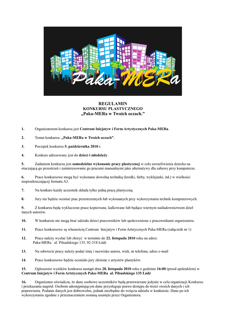 REGULAMIN KONKURSU PLASTYCZNEGO „Paka-MERa w Twoich oczach.” 1. Organizatorem konkursu jest Centrum Inicjatyw i Form Artystycznych Paka-MERa. 2. Temat konkursu: „Paka-MERa w Twoich oczach”. 3. Początek konkursu 5. października 2010 r. 4. Konkurs adresowany jest do dzieci i młodzieży. 5. Zadaniem konkursu jest samodzielne wykonanie pracy plastycznej w celu uwrażliwienia dziecka na otaczającą go przestrzeń i zainteresowanie go pracami manualnymi jako alternatywy dla zabawy przy komputerze. 6. Prace konkursowe mogą być wykonane dowolną techniką (kredki, farby, wyklejanki, itd.) w wielkości nieprzekraczającej formatu A3. 7. Na konkurs każdy uczestnik składa tylko jedną pracę plastyczną. 8. Jury nie będzie oceniać prac przestrzennych lub wykonanych przy wykorzystaniu technik komputerowych. 9. Z konkursu będą wykluczone prace kopiowane, kalkowane lub będące wiernym naśladownictwem dzieł innych autorów. 10. W konkursie nie mogą brać udziału dzieci pracowników lub spokrewnione z pracownikami organizatora. 11. Prace konkursowe są własnością Centrum Inicjatyw i Form Artstycznych Paka-MERa (załącznik nr 1) 12. Prace należy wysłać lub złożyć w terminie do 22. listopada 2010 roku na adres: Paka-MERa al. Piłsudskiego 135, 92-318 Łódź 13. Na odwrocie pracy należy podać imię i nazwisko autora, wiek, nr telefonu, adres e-mail 14. Prace konkursowe będzie oceniało jury złożone z artystów plastyków. 15. Ogłoszenie wyników konkursu nastąpi dnia 28. listopada 2010 roku o godzinie 16:00 (przed spektaklem) w Centrum Inicjatyw i Form Artstycznych Paka-MERa al. Piłsudskiego 135 Łódź 16. Organizator oświadcza, że dane osobowe uczestników będą przetwarzane jedynie w celu organizacji Konkursu i przekazania nagród. Osobom udostępniającym dane przysługuje prawo dostępu do treści swoich danych i ich poprawiania. Podanie danych jest dobrowolne, jednak niezbędne do wzięcia udziału w konkursie. Dane po ich wykorzystaniu zgodnie z przeznaczeniem zostaną usunięte przez Organizatora. 17. Dane osobowe będą przetwarzane zgodnie z z przepisami ustawy z dnia 29 sierpnia 1997 r. O ochronie danych osobowych (tekst jedn. Dz. U. Z 2002 r. nr 101 poz. 926 z późn. zm.). Administratorem Danych jest Centrum Inicjatyw i Form Artystycznych Paka-MERa. 18. Organizator nie zwraca prac konkursowych. 19. Centrum Inicjatyw i Form Artystycznych Paka-MERa zastrzega sobie prawo do wykorzystania nagrodzonych prac na stronie internetowej i w materiałach promocyjno-reklamowych. 20. Regulamin konkursu i Oświadczenie od rodziców dostępne jest na stronie internetowej www.paka-mera.pl. 21. Informacji na temat konkursu udzielają pracownicy Centrum Inicjatyw i Form Artstycznych Paka-MERa pod numerem telefonu (42) 279 74 29. 22. Zapytania odnośnie konkursu można kierować na adres e-mail: [email protected]