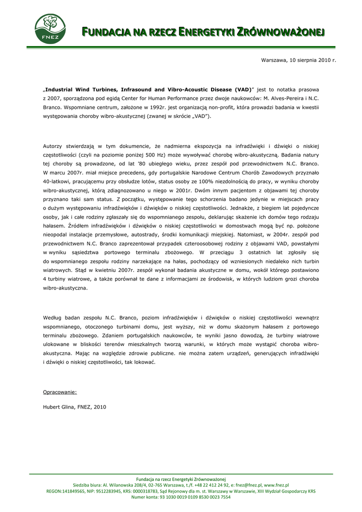 FUUNNDDAACCJJAA NNAA RRZZEECCZZ ENNEERRGGEETTYYKKII ZRRÓÓW WN NO OW WAAŻŻO ON NEEJJ Warszawa, 10 sierpnia 2010 r. „Industrial Wind Turbines, Infrasound and Vibro-Acoustic Disease (VAD)” jest to notatka prasowa z 2007, sporządzona pod egidą Center for Human Performance przez dwoje naukowców: M. Alves-Pereira i N.C. Branco. Wspomniane centrum, założone w 1992r. jest organizacją non-profit, która prowadzi badania w kwestii występowania choroby wibro-akustycznej (zwanej w skrócie „VAD”). Autorzy stwierdzają w tym dokumencie, że nadmierna ekspozycja na infradźwięki i dźwięki o niskiej częstotliwości (czyli na poziomie poniżej 500 Hz) może wywoływać chorobę wibro-akustyczną. Badania natury tej choroby są prowadzone, od lat ’80 ubiegłego wieku, przez zespół pod przewodnictwem N.C. Branco. W marcu 2007r. miał miejsce precedens, gdy portugalskie Narodowe Centrum Chorób Zawodowych przyznało 40-latkowi, pracującemu przy obsłudze lotów, status osoby ze 100% niezdolnością do pracy, w wyniku choroby wibro-akustycznej, którą zdiagnozowano u niego w 2001r. Dwóm innym pacjentom z objawami tej choroby przyznano taki sam status. Z początku, występowanie tego schorzenia badano jedynie w miejscach pracy o dużym występowaniu infradźwięków i dźwięków o niskiej częstotliwości. Jednakże, z biegiem lat pojedyncze osoby, jak i całe rodziny zgłaszały się do wspomnianego zespołu, deklarując skażenie ich domów tego rodzaju hałasem. Źródłem infradźwięków i dźwięków o niskiej częstotliwości w domostwach mogą być np. położone nieopodal instalacje przemysłowe, autostrady, środki komunikacji miejskiej. Natomiast, w 2004r. zespół pod przewodnictwem N.C. Branco zaprezentował przypadek czteroosobowej rodziny z objawami VAD, powstałymi w wyniku sąsiedztwa portowego terminalu zbożowego. W przeciągu 3 ostatnich lat zgłosiły się do wspomnianego zespołu rodziny narzekające na hałas, pochodzący od wzniesionych niedaleko nich turbin wiatrowych. Stąd w kwietniu 2007r. zespół wykonał badania akustyczne w domu, wokół którego postawiono 4 turbiny wiatrowe, a także porównał te dane z informacjami ze środowisk, w których ludziom grozi choroba wibro-akustyczna. Według badan zespołu N.C. Branco, poziom infradźwięków i dźwięków o niskiej częstotliwości wewnątrz wspomnianego, otoczonego turbinami domu, jest wyższy, niż w domu skażonym hałasem z portowego terminalu zbożowego. Zdaniem portugalskich naukowców, te wyniki jasno dowodzą, że turbiny wiatrowe ulokowane w bliskości terenów mieszkalnych tworzą warunki, w których może wystąpić choroba wibroakustyczna. Mając na względzie zdrowie publiczne. nie można zatem urządzeń, generujących infradźwięki i dźwięki o niskiej częstotliwości, tak lokować. Opracowanie: Hubert Glina, FNEZ, 2010 Fundacja na rzecz Energetyki Zrównoważonej Siedziba biura: Al. Wilanowska 208/4, 02-765 Warszawa, t./f. +48 22 412 24 92, e: [email protected], www.fnez.pl REGON:141849565, NIP: 9512283945, KRS: 0000318783, Sąd Rejonowy dla m. st. Warszawy w Warszawie, XIII Wydział Gospodarczy KRS Numer konta: 93 1030 0019 0109 8530 0023 7554