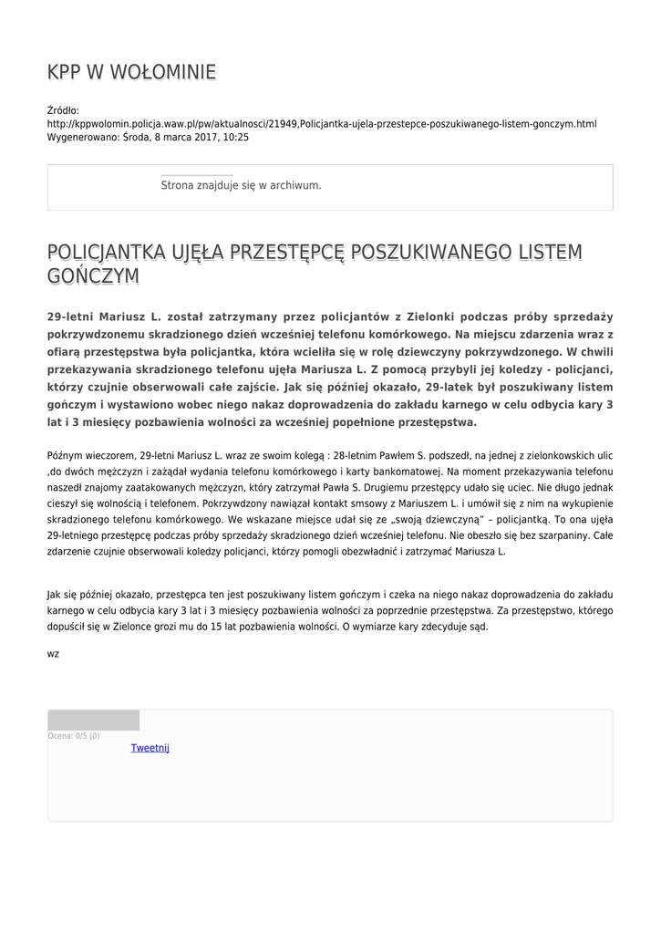 KPP W WOŁOMINIE Źródło: http://kppwolomin.policja.waw.pl/pw/aktualnosci/21949,Policjantka-ujela-przestepce-poszukiwanego-listem-gonczym.html Wygenerowano: Środa, 8 marca 2017, 10:25 Strona znajduje się w archiwum. POLICJANTKA UJĘŁA PRZESTĘPCĘ POSZUKIWANEGO LISTEM GOŃCZYM 29-letni Mariusz L. został zatrzymany przez policjantów z Zielonki podczas próby sprzedaży pokrzywdzonemu skradzionego dzień wcześniej telefonu komórkowego. Na miejscu zdarzenia wraz z ofiarą przestępstwa była policjantka, która wcieliła się w rolę dziewczyny pokrzywdzonego. W chwili przekazywania skradzionego telefonu ujęła Mariusza L. Z pomocą przybyli jej koledzy - policjanci, którzy czujnie obserwowali całe zajście. Jak się później okazało, 29-latek był poszukiwany listem gończym i wystawiono wobec niego nakaz doprowadzenia do zakładu karnego w celu odbycia kary 3 lat i 3 miesięcy pozbawienia wolności za wcześniej popełnione przestępstwa. Późnym wieczorem, 29-letni Mariusz L. wraz ze swoim kolegą : 28-letnim Pawłem S. podszedł, na jednej z zielonkowskich ulic ,do dwóch mężczyzn i zażądał wydania telefonu komórkowego i karty bankomatowej. Na moment przekazywania telefonu naszedł znajomy zaatakowanych mężczyzn, który zatrzymał Pawła S. Drugiemu przestępcy udało się uciec. Nie długo jednak cieszył się wolnością i telefonem. Pokrzywdzony nawiązał kontakt smsowy z Mariuszem L. i umówił się z nim na wykupienie skradzionego telefonu komórkowego. We wskazane miejsce udał się ze „swoją dziewczyną” – policjantką. To ona ujęła 29-letniego przestępcę podczas próby sprzedaży skradzionego dzień wcześniej telefonu. Nie obeszło się bez szarpaniny. Całe zdarzenie czujnie obserwowali koledzy policjanci, którzy pomogli obezwładnić i zatrzymać Mariusza L. Jak się później okazało, przestępca ten jest poszukiwany listem gończym i czeka na niego nakaz doprowadzenia do zakładu karnego w celu odbycia kary 3 lat i 3 miesięcy pozbawienia wolności za poprzednie przestępstwa. Za przestępstwo, którego dopuścił się w Zielonce grozi mu do 15 lat pozbawienia wolności. O wymiarze kary zdecyduje sąd. wz Ocena: 0/5 (0) Tweetnij