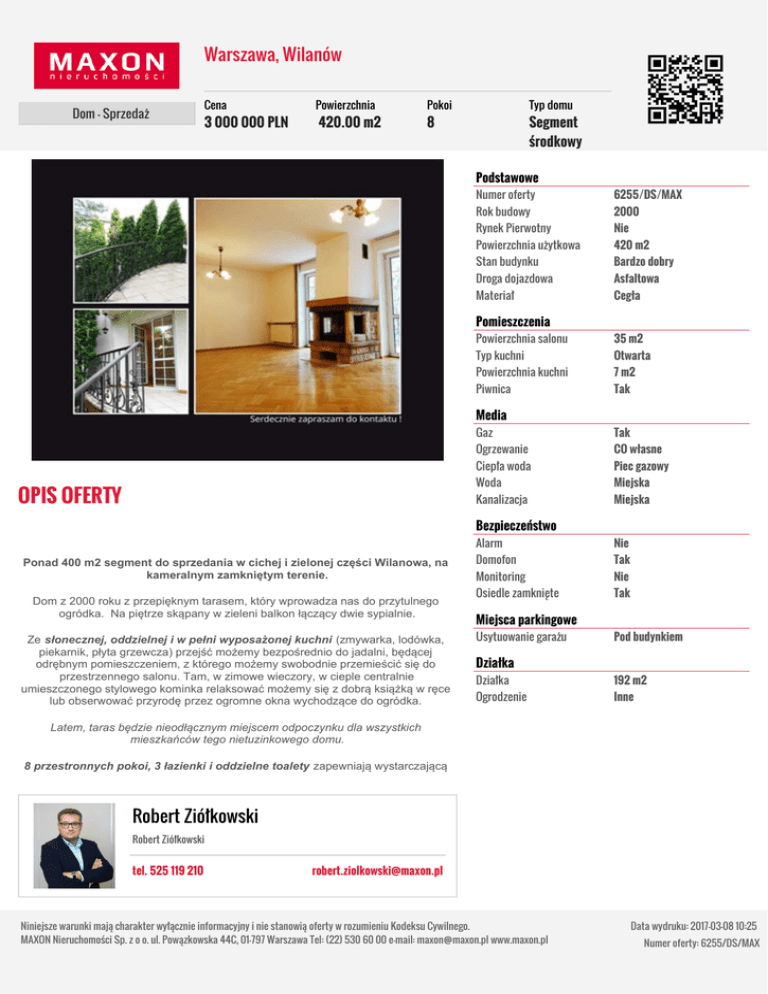 Warszawa, Wilanów Dom - Sprzedaż Cena 3 000 000 PLN Powierzchnia 420.00 m2 Pokoi Typ domu 8 Segment środkowy Podstawowe Numer oferty 6255/DS/MAX Rok budowy 2000 Rynek Pierwotny Nie Powierzchnia użytkowa 420 m2 Stan budynku Bardzo dobry Droga dojazdowa Asfaltowa Materiał Cegła Pomieszczenia Powierzchnia salonu 35 m2 Typ kuchni Otwarta Powierzchnia kuchni 7 m2 Piwnica Tak Media OPIS OFERTY Gaz Tak Ogrzewanie CO własne Ciepła woda Piec gazowy Woda Miejska Kanalizacja Miejska Bezpieczeństwo Ponad 400 m2 segment do sprzedania w cichej i zielonej części Wilanowa, na kameralnym zamkniętym terenie. Dom z 2000 roku z przepięknym tarasem, który wprowadza nas do przytulnego ogródka. Na piętrze skąpany w zieleni balkon łączący dwie sypialnie. Ze słonecznej, oddzielnej i w pełni wyposażonej kuchni (zmywarka, lodówka, piekarnik, płyta grzewcza) przejść możemy bezpośrednio do jadalni, będącej odrębnym pomieszczeniem, z którego możemy swobodnie przemieścić się do przestrzennego salonu. Tam, w zimowe wieczory, w cieple centralnie umieszczonego stylowego kominka relaksować możemy się z dobrą książką w ręce lub obserwować przyrodę przez ogromne okna wychodzące do ogródka. Alarm Nie Domofon Tak Monitoring Nie Osiedle zamknięte Tak Miejsca parkingowe Usytuowanie garażu Pod budynkiem Działka Działka 192 m2 Ogrodzenie Inne Latem, taras będzie nieodłącznym miejscem odpoczynku dla wszystkich mieszkańców tego nietuzinkowego domu. 8 przestronnych pokoi, 3 łazienki i oddzielne toalety zapewniają wystarczającą Robert Ziółkowski Robert Ziółkowski tel. 525 119 210 [email protected] Niniejsze warunki mają charakter wyłącznie informacyjny i nie stanowią oferty w rozumieniu Kodeksu Cywilnego. MAXON Nieruchomości Sp. z o o. ul. Powązkowska 44C, 01-797 Warszawa Tel: (22) 530 60 00 e-mail: [email protected] www.maxon.pl Data wydruku: 2017-03-08 10:25 Numer oferty: 6255/DS/MAX