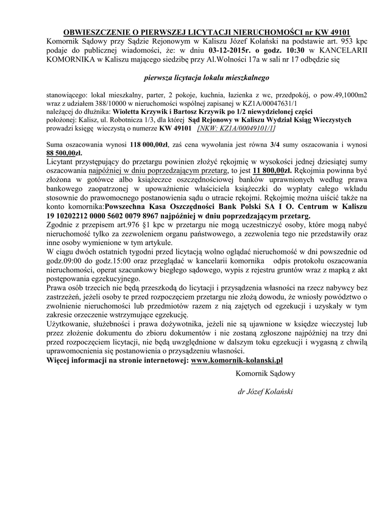 OBWIESZCZENIE O PIERWSZEJ LICYTACJI NIERUCHOMOŚCI nr KW 49101 Komornik Sądowy przy Sądzie Rejonowym w Kaliszu Józef Kolański na podstawie art. 953 kpc podaje do publicznej wiadomości, że: w dniu 03-12-2015r. o godz. 10:30 w KANCELARII KOMORNIKA w Kaliszu mającego siedzibę przy Al.Wolności 17a w sali nr 17 odbędzie się pierwsza licytacja lokalu mieszkalnego stanowiącego: lokal mieszkalny, parter, 2 pokoje, kuchnia, łazienka z wc, przedpokój, o pow.49,1000m2 wraz z udziałem 388/10000 w nieruchomości wspólnej zapisanej w KZ1A/00047631/1 należącej do dłużnika: Wioletta Krzywik i Bartosz Krzywik po 1/2 niewydzielonej części położonej: Kalisz, ul. Robotnicza 1/3, dla której Sąd Rejonowy w Kaliszu Wydział Ksiąg Wieczystych prowadzi księgę wieczystą o numerze KW 49101 [NKW: KZ1A/00049101/1] Suma oszacowania wynosi 118 000,00zł, zaś cena wywołania jest równa 3/4 sumy oszacowania i wynosi 88 500,00zł. Licytant przystępujący do przetargu powinien złożyć rękojmię w wysokości jednej dziesiątej sumy oszacowania najpóźniej w dniu poprzedzającym przetarg, to jest 11 800,00zł. Rękojmia powinna być złożona w gotówce albo książeczce oszczędnościowej banków uprawnionych według prawa bankowego zaopatrzonej w upoważnienie właściciela książeczki do wypłaty całego wkładu stosownie do prawomocnego postanowienia sądu o utracie rękojmi. Rękojmię można uiścić także na konto komornika:Powszechna Kasa Oszczędności Bank Polski SA I O. Centrum w Kaliszu 19 10202212 0000 5602 0079 8967 najpóźniej w dniu poprzedzającym przetarg. Zgodnie z przepisem art.976 §1 kpc w przetargu nie mogą uczestniczyć osoby, które mogą nabyć nieruchomość tylko za zezwoleniem organu państwowego, a zezwolenia tego nie przedstawiły oraz inne osoby wymienione w tym artykule. W ciągu dwóch ostatnich tygodni przed licytacją wolno oglądać nieruchomość w dni powszednie od godz.09:00 do godz.15:00 oraz przeglądać w kancelarii komornika odpis protokołu oszacowania nieruchomości, operat szacunkowy biegłego sądowego, wypis z rejestru gruntów wraz z mapką z akt postępowania egzekucyjnego. Prawa osób trzecich nie będą przeszkodą do licytacji i przysądzenia własności na rzecz nabywcy bez zastrzeżeń, jeżeli osoby te przed rozpoczęciem przetargu nie złożą dowodu, że wniosły powództwo o zwolnienie nieruchomości lub przedmiotów razem z nią zajętych od egzekucji i uzyskały w tym zakresie orzeczenie wstrzymujące egzekucję. Użytkowanie, służebności i prawa dożywotnika, jeżeli nie są ujawnione w księdze wieczystej lub przez złożenie dokumentu do zbioru dokumentów i nie zostaną zgłoszone najpóźniej na trzy dni przed rozpoczęciem licytacji, nie będą uwzględnione w dalszym toku egzekucji i wygasną z chwilą uprawomocnienia się postanowienia o przysądzeniu własności. Więcej informacji na stronie internetowej: www.komornik-kolanski.pl Komornik Sądowy dr Józef Kolański