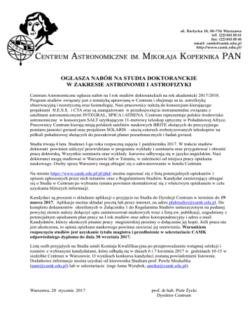 OGŁASZA NABÓR NA STUDIA DOKTORANCKIE W ZAKRESIE ASTRONOMII I ASTROFIZYKI Centrum Astronomiczne ogłasza nabór na I rok studiów doktoranckich na rok akademicki 2017/2018. Program studiów związany jest z tematyką uprawianą w Centrum i obejmuje m.in. astrofizykę obserwacyjną i teoretyczną oraz kosmologię. Nasi pracownicy należą do konsorcjum kierującego projektami H.E.S.S. i CTA oraz są zaangażowani w przedsięwzięcia instrumentalne związane z satelitami astronomicznymi INTEGRAL, SPICA i ATHENA. Centrum reprezentuje polskie środowisko astronomiczne w konsorcjum SALT użytkującym 11-metrowy teleskop optyczny w Południowej Afryce. Pracownicy Centrum kierują misją polskich satelitów naukowych BRITE służących do precyzyjnego pomiaru jasności gwiazd oraz projektem SOLARIS – siecią czterech zrobotyzowanych teleskopów na półkuli południowej służących do poszukiwań planet pozasłonecznych i badań gwiazd. Studia trwają 4 lata. Studenci I-go roku rozpoczną zajęcia 1 października 2017. W trakcie studiów doktorant powinien zaliczyć przewidziane w programie wykłady i seminaria oraz przygotować i obronić pracę doktorską. Wszystkie seminaria oraz wykłady kursowe odbywają się w języku angielskim. Nasi doktoranci mogą studiować w Warszawie lub w Toruniu, w zależności od miejsca pracy opiekuna naukowego. Osoby spoza Warszawy mogą ubiegać się o zakwaterowanie w hotelu Centrum. Na stronie https://www.camk.edu.pl/pl/phd/ można zapoznać się z listą potencjalnych opiekunów i opisem zgłoszonych przez nich tematów oraz z Regulaminem Studiów. Kandydat zamierzający ubiegać się o Studia w Centrum po wybraniu tematu powinien skontaktować się z właściwym opiekunem w celu uzyskania bliższych informacji. Kandydaci są proszeni o składanie aplikacji o przyjęcie na Studia do Dyrekcji Centrum w terminie do 19 marca 2017. Aplikacje można składać pocztą lub przez internet, na adres [email protected]. Do kompletu dokumentów określonych w Załączniku 1 do Regulaminu Studiów umieszczonym na podanej powyżej stronie należy dołączyć opis zainteresowań naukowych wraz z listą ew. publikacji, uzgodniony z potencjalnym opiekunem plan pracy na I rok studiów oraz adres korespondencyjny i adres e-mail. Kandydatów, którzy ukończyli pisanie pracy magisterskiej prosimy o dołączenie jej kopii. Jeśli praca nie jest ukończona, to opinia opiekuna naukowego powinna zawierać jej omówienie. Warunkiem rozpoczęcia studiów jest uzyskanie tytułu magistra i przedłożenie w sekretariacie CAMK odpowiedniego dyplomu do dnia 30 września 2017. Listę osób przyjętych na Studia ustali Komisja Kwalifikacyjna po przeprowadzeniu wstępnej selekcji i rozmów z wybranymi kandydatami, które odbędą się w dniach 6 i 7 kwietnia 2017 w godzinach 10-15 w siedzibie Centrum w Warszawie. O wynikach konkursu kandydaci zostaną powiadomieni listownie. Dodatkowe informacje można uzyskać od kierownika Studium prof. Pawła Moskalika ([email protected]) lub w sekretariacie (mgr Anna Wyrębek, [email protected]). Warszawa, 20 stycznia 2017 prof. dr hab. Piotr Życki Dyrektor Centrum