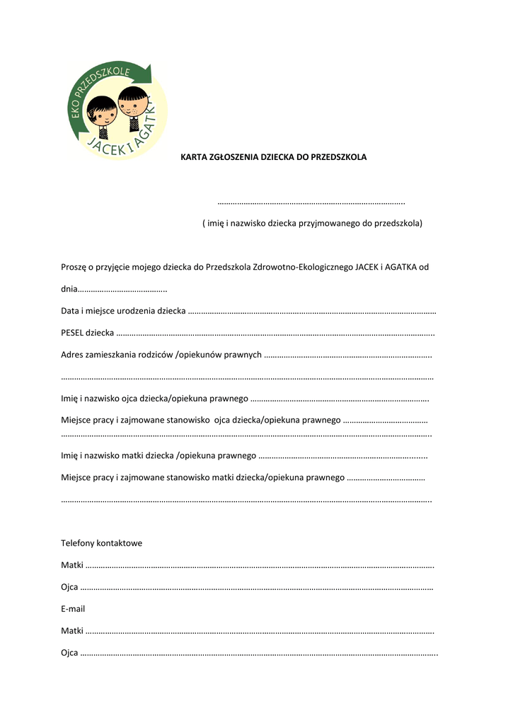 KARTA ZGŁOSZENIA DZIECKA DO PRZEDSZKOLA ………………………………………………………………………….. ( imię i nazwisko dziecka przyjmowanego do przedszkola) Proszę o przyjęcie mojego dziecka do Przedszkola Zdrowotno-Ekologicznego JACEK i AGATKA od dnia………………………………….. Data i miejsce urodzenia dziecka …………………………………………………………………………………………………… PESEL dziecka ……………………………………………………………………………………………………………………………….. Adres zamieszkania rodziców /opiekunów prawnych ………………………………………………………………….. ……………………………………………………………………………………………………………………………………………………… Imię i nazwisko ojca dziecka/opiekuna prawnego ………………………………………………………………………. Miejsce pracy i zajmowane stanowisko ojca dziecka/opiekuna prawnego ………………………………… …………………………………………………………………………………………………………………………………………………….. Imię i nazwisko matki dziecka /opiekuna prawnego ……………………………………………………………........ Miejsce pracy i zajmowane stanowisko matki dziecka/opiekuna prawnego ……………………………… …………………………………………………………………………………………………………………………………………………….. Telefony kontaktowe Matki ……………………………………………………………………………………………………………………………………………. Ojca ……………………………………………………………………………………………………………………………………………… E-mail Matki ……………………………………………………………………………………………………………………………………………. Ojca ……………………………………………………………………………………………………………………………………………….. (podpis matki/opiekuna prawnego) i/lub (podpis ojca/opiekuna prawnego) INFORMACJE O DZIECKU Proszę zaznaczyć stwierdzenia, które najbardziej charakteryzują Państwa dziecko (przez podkreślenie) SAMODZIELNOŚĆ Samo radzi sobie z jedzeniem Trzeba je karmić Pamięta o potrzebach fizjologicznych i radzi sobie samo Zgłasza swoje potrzeby ale wymaga pomocy przy korzystaniu z toalety Trzeba je pilnować bo zapomina o zgłaszaniu potrzeb fizjologicznych Inne uwagi dotyczące dziecka ……………………………………………………………………………………………………………… ……………………………………………………………………………………………………………………………………………………………. SPANIE Jest przyzwyczajone do spania w ciągu dnia w godzinach …………………………………………………………………… Nie sypia w ciągu dnia INNE INFORMACJE O DZIECKU Jest alergikiem uczulonym na: …………………………………………………………………………………………………………… ………………………………………………………………………………………………………………………………………………………….. Dziecko znajduje się pod stałą opieką specjalistyczną (jaką?) ……………………………………………………………. Dziecko przebyło choroby zakaźne (jakie?) ………………………………………………………………………………………. Wyrażam zgodę na przetwarzanie danych osobowych zawartych w karcie do celów edukacyjnych oraz celów związanych z realizacją przez przedszkole zadań statutowych, zgodnie z Ustawą z dnia 29 sierpnia 1997 r. o ochronie danych osobowych. Cieszyn, dn. ……………………………………… ………………………………………………… podpis rodzica tel. 664 416 669 www.przedszkolejacekiagatka.pl e-mail: [email protected]