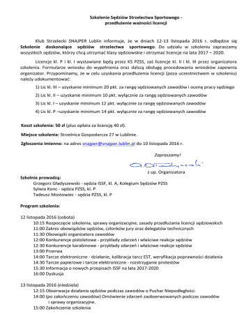 Szkolenie Sędziów Strzelectwa Sportowego przedłużenie ważności licencji Klub Strzelecki SNAJPER Lublin informuje, że w dniach 12-13 listopada 2016 r. odbędzie się Szkolenie doskonalące sędziów strzelectwa sportowego. Do udziału w szkoleniu zapraszamy wszystkich sędziów, którzy chcą utrzymać klasy sędziowskie i otrzymać licencje na lata 2017 – 2020. Licencje kl. P i kl. I wystawiane będą przez KS PZSS, zaś licencje kl. II i kl. III przez organizatora szkolenia. Formularze wniosku do wypełnienia oraz dalszą obsługę procedowania wniosków zapewnia organizator. Przypominamy, że w celu uzyskania przedłużenia licencji (poza uczestnictwem w szkoleniu) należy udokumentować: 1) Lic kl. III – uzyskanie minimum 20 pkt. za rangę sędziowanych zawodów i ocenę pracy sędziego 2) Lic kl. II – uzyskanie minimum 10 pkt. wyłącznie za rangę sędziowanych zawodów 3) Lic kl. I – uzyskanie minimum 12 pkt. wyłącznie za rangę sędziowanych zawodów 4) Lic kl. P –uzyskanie minimum 14 pkt. wyłącznie za rangę sędziowanych zawodów Koszt szkolenia: 50 zł (plus opłata za licencję 40 zł). Miejsce szkolenia: Strzelnica Gospodarcza 27 w Lublinie. Zgłoszenia imienne: na adres [email protected] do 10 listopada 2016 r. Zapraszamy! z up. Organizatora Szkolnie prowadzą: Grzegorz Gładyszewski - sędzia ISSF, kl. A, Kolegium Sędziów PZSS Sylwia Konc - sędzia PZSS, kl. P Tadeusz Mostowiec - sędzia PZSS, kl. P Program szkolenia: 12 listopada 2016 (sobota) 10:15 Rozpoczęcie szkolenia, sprawy organizacyjne, zasady przedłużania licencji sędziowskich 11:00 Zakres obowiązków sędziów, członków jury oraz delegatów technicznych 11:30 Obowiązki organizatora zawodów 12:00 Konkurencje pistoletowe - przykłady zdarzeń i właściwe reakcje sędziów 12:30 Konkurencje karabinowe - przykłady zdarzeń i właściwe reakcje sędziów 13:00 Przerwa 14:00 Tarcze elektroniczne - działanie, kalibracja tarcz EST, weryfikacja poprawności działania 14:30 Tarcze papierowe i tarcze elektroniczne - rozstrzyganie protestów 15:30 Informacja o nowych przepisach ISSF na lata 2017-2020 16:00 Dyskusja 13 listopada 2016 (niedziela) 12:15 Obserwacja działania sędziów podczas zawodów o Puchar Niepodległości. 14:00 (po zakończeniu zawodów) Omówienie zdarzeń zaobserwowanych podczas zawodów i sprawy organizacyjne. 15:00 Zakończenie szkolenia