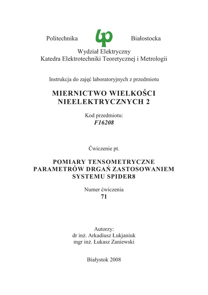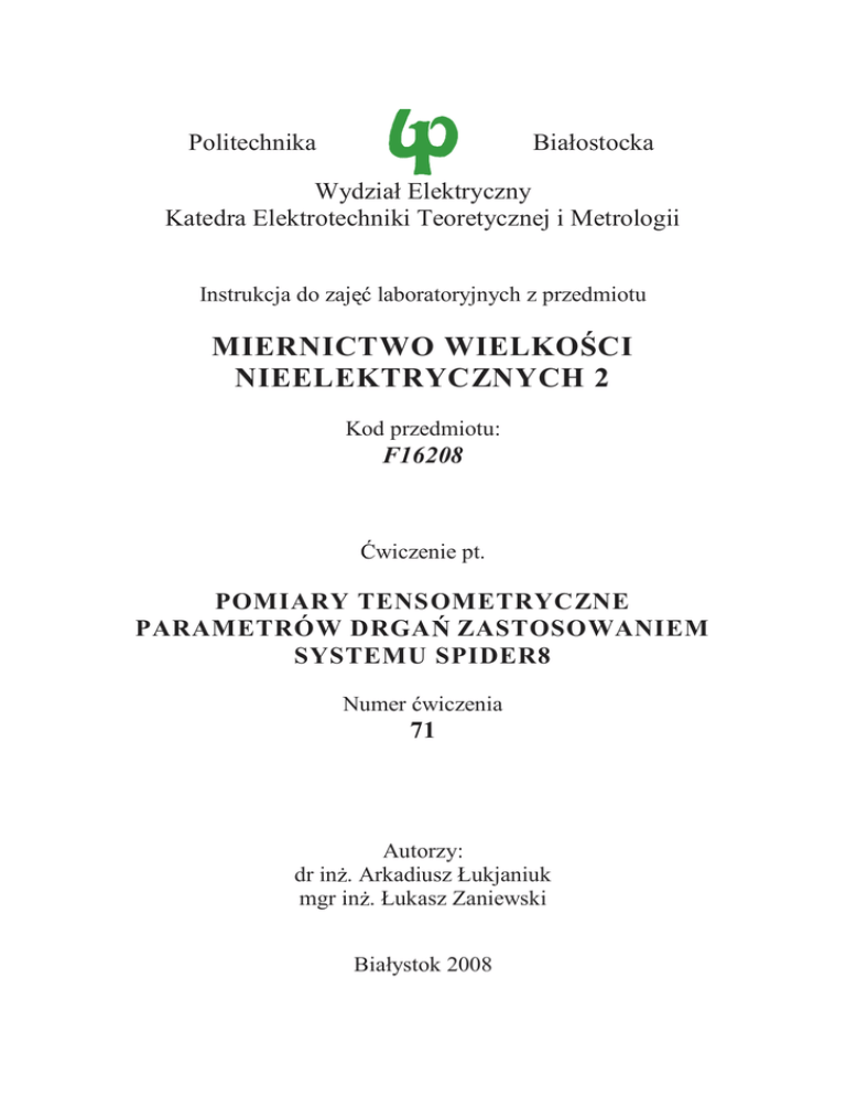Politechnika Białostocka Wydział Elektryczny Katedra Elektrotechniki Teoretycznej i Metrologii Instrukcja do zaj laboratoryjnych z przedmiotu MIERNICTWO WIELKO CI NIEELEKTRYCZNYCH 2 Kod przedmiotu: F16208 wiczenie pt. POMIARY TENSOMETRYCZNE PARAMETRÓW DRGA ZASTOSOWANIEM SYSTEMU SPIDER8 Numer wiczenia 71 Autorzy: dr in . Arkadiusz Łukjaniuk mgr in . Łukasz Zaniewski Białystok 2008 Ćwicz. Nr 71 Pomiary tensometryczne z zastosowaniem ... 2 1. Wprowadzenie C lem ćwiczenia jest zapoznanie studentów z pomiarami tensometrycznymi parametrów ruchu drgającego; nauczenie podstawowych zasad wykorzystywania w metrologii komputerowych systemów pomiarowym na przykładzie systemu Spider8. 1.1 Klasyfikacja drga 1. Ze względu na liczbę stopni swobody: • o jednym stopniu swobody (rys. 1); • o wielu (sko czonej liczbie) stopni swobody (rys. 2); • o niesko czonej liczbie stopni swobody (drgania ośrodków ciągłych – rys.3.) 2. Ze względu na charakter odkształceń spręŜystych układu: • podłu ne (rys. 4); • poprzeczne (giętne) (rys. 5); • skr tne (rys. 6); • zło one (kombinacja poprzednich) (rys. 7); Ćwicz. Nr 71 Pomiary tensometryczne z zastosowaniem ... 3 3. Ze względu na przyczyny wywołujące drgania: • drgania własne lub swobodne; są to drgania wywołane jednorazowym wytrąceniem układu z połoŜenia równowagi spręŜystej, po czym układ jest pozostawiony samemu sobie; • drgania wymuszone; są to drgania, wzbudzane siłami zewnętrznymi, zmieniającymi się w czasie okresowo (rys. 8); • drgania parametryczne; są to drgania wywołane okresową zmianą parametrów układu (np. jego sztywności) (rys. 9); • drgania samowzbudne (autodrgania); są to drgania wzbudzane przez siły spowodowane samym ruchem (np. siły tarcia) (rys. 10); 4. Ze względu na moŜliwość występowania oporów: • drgania nietłumione (bez oporów) (rys. 11); • drgania tłumione (występowanie oporów) (rys. 12): - zewn trznych (np. opór ośrodka – tarcie suche, opór wiskotyczny); - wewn trznych (np. siły tarcia międzycząsteczkowego); Ćwicz. Nr 71 Pomiary tensometryczne z zastosowaniem ... 4 5. Ze względu na opis matematyczny ruchu: • drgania liniowe – opisane równaniami liniowymi; • drgania nieliniowe - opisane równaniami nieliniowymi (rys. 11 i 13). Rodzaje nieliniowości w układach drgających: • typu „naturalnego” wynikającego z konstrukcji i przeznaczenia maszyny (tarcie suche, wiskotyczne, konstrukcyjne, itp.); • „programowe”, występujące na skutek odpowiedniego doboru spręŜyn, stosowaniu luzów oraz stosowaniu nieliniowych amortyzatorów i tłumików. Tłumienie jest jednym z przejawów rozproszenia energii mechanicznej, nierozłącznie związanej z ruchem układów mechanicznych. Rodzaje tłumienia naturalnego: • wpływ rodowiska (powietrze, ciecz, itp.); • tarcie wewn trzne w materiale; • tarcie w podporach; • tarcie w poł czeniach. Układ dyskretny moŜna zdefiniować jako układ, którego ruch jest opisany równaniami róŜniczkowymi zwyczajnymi o skończonej liczbie niewiadomych funkcji jednej zmiennej, np. czasu. an x + an−1 x + ...... + a1 x + a0 x = P(t ), n 1 gdzie: an,....,a0 – współczynniki równania; n x - n-ta pochodna; n – rząd równania róŜniczkowego; P(t) – funkcja wymuszeń (drgania wymuszone, jeśli P(t)=0, to mamy do czynienia z drganiami swobodnymi). JeŜeli wszystkie współczynniki an są liniowe, to układ (1) jest liniowy. W przeciwnym wypadku – nieliniowy. Praktycznie wszystkie układy są nieliniowe, Ćwicz. Nr 71 Pomiary tensometryczne z zastosowaniem ... 5 jednak jeśli amplitudy drgań są niewielkie, to nieliniowe zaleŜności moŜna zastąpić ich liniowymi przybliŜeniami, odrzucając wyrazy drugiego i wyŜszych rzędów. Wpływ drga • • • • • : zakłócenie prawidłowości działania maszyn; zmniejszenie trwałości maszyn i urządzeń; szkodliwy wpływ drgań na organizm ludzki; hałas; zniszczenia maszyn i konstrukcji. 1.2 Drgania swobodne Rozpatrzmy drgania swobodne układu liniowego (P(t)=0). Równanie drgań swobodnych tłumionych układów o jednym stopniu swobody: •• • m x + α x + kx = 0 , (1) lub w postaci •• • x + 2n x + ω 0 x = 0 , gdzie: 2n = α , a ω 2 0 m = 2 k - jest kwadratem częstości drgań; m k – współczynnik spręŜystości [N/m]; m – masa układu drgającego; α - współczynnik tłumienia lepkiego [Ns/m=kg/s]);. • α y - opór ośrodka. Równanie charakterystyczne: r 2 + 2nr + ω02 = 0 . (3) Ogólne rozwiązanie równania (2) zaleŜy od znaku i wartości wyróŜnika równania (3). Występują trzy przypadki rozwiązań: • nadkrytyczne; • krytyczne; • podkrytyczne. (2) 6 Ćwicz. Nr 71 Pomiary tensometryczne z zastosowaniem ... 1.2.1. TŁUMIENIE NADKRYTYCZNE ∆ φ 0 , czyli n φ ω 0 Rozwiązanie ogólne ma postać: x = C1e r t + C 2 e r t , 1 2 (4) gdzie: r1 i r2 pierwiastki równania (3) r1, 2 = −n ± n 2 − ω02 Stałe całkowania C1 i C2 zaleŜą od warunków początkowych. JeŜeli dla t = 0, x = x0 , • • • x = x0 , to stałe wynoszą: x −r x C1 = 0 2 0 , r1 − r2 • x0 − r1 x0 C2 = r2 − r1 1.2.2. TŁUMIENIE KRYTYCZNE ∆ = 0, czyli n=ω ω0 Rozwiązanie ogólne równania (2) ma postać: x = e − nt (C1 + C 2 t ) (5) Stałe całkowania C1 i C2 zaleŜą od warunków początkowych i wynoszą: • C1 = x0 , C2 = x0 + nx0 . Ostatecznie • x = e x0 + x0 + nx0 t . − nt (6) 1.2.3. TŁUMIENIE NADKRYTYCZNE ∆ < 0, czyli n < ω0 Rozwiązanie ogólne równania (2) ma postać: x = e − nt (C1 cos ω1t + C 2 sin ω1t ), gdzie: (7) ω1 = ω 02 − n 2 - częstość drgań swobodnych tłumionych. Stałe całkowania C1 i C2 zaleŜą od warunków początkowych i wynoszą: • C1 = x0 , C2 = nx0 + x0 ω1 . Ćwicz. Nr 71 Pomiary tensometryczne z zastosowaniem ... 7 Po przekształceniu moŜna zapisać w postaci: x = A0 e − nt sin (ω1t + ϕ ), (8) gdzie: • 2 nx0 + x0 , 2 2 2 A0 = C1 + C2 = x0 + ω1 x0ω1 , C 