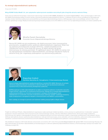 Ku strategii odpowiedzialności społecznej Droga przez ISO 26000 Mis j ą K GHM P ols k a Miedź S.A . j es t opt y malne wy k or zy s t anie zas obów nat ur alny ch j ak o dr ogi do wzr os t u war t oś ci fir my . Firma chce ją realizować korzystając z wytycznych najnowszego standardu I SO 26000 „Guidance on s ocial r es pons ibilit y ”, który został przyjęty w 2010 roku. ISO 26000 systematyzuje wiedzę na temat szeroko rozumianej społecznej odpowiedzialności biznesu. Z założenia nie jest to forma certyfikacji ani obowiązkowej regulacji, ma być natomiast praktycznym przewodnikiem po koncepcji odpowiedzialnego biznesu, definiując jego ramy oraz przybliżając wartości i idee. Z racji prestiżu i globalnego zasięgu Międzynarodowej Organizacji Standaryzacyjnej norma ISO 26000 ma szanse stać się najbardziej powszechną na świecie wykładnią CSR. Mi re lla Pane k-Ow s i ańs ka Pre z e ska F oru m O d p owi e d z i aln e g o Bi z n e su Norma ISO 26000 nie jest przełomowa, ale dzięki procesowi, który towarzyszył jej powstawaniu, uwzględnia pełne spektrum odpowiedzialności organizacji. Może stać się podstawą do budowania strategii CSR Firmy, a dzięki kompleksowemu charakterowi normy, Firma może być pewna, że żadne obszary lub grupy interesariuszy nie zostaną pominięte. W najbliższych latach, ISO 26000 ma szansę stać się najważniejszym standardem odpowiedzialności, do którego odwoływać będą się zarówno firmy, jak i organizacje pozarządowe czy administracja publiczna. Bog us ław Grab oń Dyre ktor Nacz e ln y d s. Z arz ąd z an i a i Z równ oważ on e g o Roz woj Naszą strategię odpowiedzialności społecznej oparliśmy o standard ISO 26000. Wierzymy, że na bazie wdrożenia międzynarodowych standardów w zakresie CSR uda nam się skutecznie adresować wyzwania Firmy w sferze ekonomicznej, ekologicznej i społecznej. KGHM przyjmuje na siebie odpowiedzialność za wpływ na otoczenie społeczne i środowisko naturalne. Pragnie słuchać i odpowiadać na oczekiwania interesariuszy. Dlatego też w strategii odpowiedzialności społecznej postawiliśmy na: tworzenie innowacyjnych rozwiązań minimalizujących nasze oddziaływanie na środowisko naturalne, budowanie pozycji „dobrego sąsiada” i zaufanego inwestora, etykę i przejrzystość w zarządzaniu relacjami z interesariuszami oraz dbałość o pracowników. Mam nadzieję, że strategia ta pomoże nam budować stabilną pozycję Spółki w długim okresie. Projekt ten definiuje CSR jako „Odpowiedzialność organizacji za wpływ jej decyzji i działań (produkty, serwis, procesy) na społeczeństwo i środowisko”, poprzez przejrzyste i etyczne zachowanie, które przyczynia się do zrównoważonego rozwoju, zdrowia i dobrobytu społeczeństwa, bierze pod uwagę oczekiwania interesariuszy, jest zgodne z obowiązującym prawem oraz międzynarodowymi normami zachowania, spójne z organizacją i praktykowane w jej relacjach. Norma definiuje także główne obszary społecznej odpowiedzialności, takie jak: ład korporacyjny, prawa człowieka, ochrona środowiska, zachowanie wobec pracowników, rzetelność i uczciwość biznesowa, kwestie konsumenckie (dbałość o klienta) oraz zaangażowanie społeczne i rozwój społeczności lokalnych. Aby działalność związana z CSR miała właściwe umocowanie, we wrześniu 2011 roku Firma powołała Depar t ament do s pr aw CSR i Zrównoważonego Rozwoju. Na jego czele którego stoi dyrektor odpowiedzialny za koordynację prac w zakresie społecznej odpowiedzialności biznesu, zrównoważonego rozwoju oraz nadzór nad realizacją strategii CSR. Krzys ztof Kułac z p .o. Dyre ktora De p artam e n tu CS R i Z równ oważ on e g o Roz woj Społeczna odpowiedzialność biznesu (CSR) w firmie KGHM Polska Miedź S.A. posiada istotne znaczenie zarówno w kontekście branżowym, organizacyjno-korporacyjnym, jak i społecznym. Szereg zadań mojego departamentu, utworzonego w październiku 2011 roku, wynika z jednej strony, z wcześniejszych wieloletnich doświadczeń i działań Firmy oraz Fundacji Polska Miedź, a z drugiej z nowatorskich przedsięwzięć podejmowanych w ostatnich latach funkcjonowania Firmy na rzecz szeroko pojętego zrównoważonego rozwoju. Warto podkreślić, że spółka KGHM rozumie także swoją odpowiedzialność, wynikającą z naszej globalnej roli jako jednego z czołowych producentów miedzi na świecie. Jesteśmy gotowi włączyć się w międzynarodowe działania na rzecz dbałości o środowisko naturalne, przestrzegania praw człowieka i zasad demokracji oraz rozwoju społecznego. Przed nami ważny etap szkoleń i wdrażania zasad odpowiedzialnego biznesu, który będziemy realizować m.in.: poprzez międzynarodowe, powszechnie uznane i stosowane standardy odpowiedzialnego postępowania firm, poprzez tworzoną strategię CSR dla KGHM na lata 2012-2018, a także w oparciu o dobre praktyki i inspiracje dla naszego sektora przemysłowego oraz poprzez podniesienie poziomu edukacji pracowników i interesariuszy.