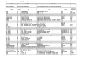 Wykaz podręczników stosowanych w roku 2008/09 Liceum Ogólnokształcące adres szkoły typ szkoły Liceum Ogólnokształcące Przedmiot biologia biologia biologia chemia chemia chemia fizyka i astronomia fizyka i astronomia fizyka i astronomia geografia geografia geografia geografia historia historia historia historia język angielski język angielski język angielski język angielski język angielski język angielski język angielski język angielski język niemiecki język niemiecki język niemiecki język polski język polski język polski język polski język rosyjski język rosyjski język rosyjski matematyka matematyka matematyka matematyka podstawy przedsiębiorczości Przysposobienie obronne Przysposobienie obronne technologia informacyjna wiedza o kulturze wiedza o społeczeństwie wiedza o społeczeństwie wychowanie do Ŝycia w rodzinie religia religia religia 08-430 śelechów ul. Piłsudskiego 45 Klasa I II III I II III I II III I II II III I I II III I I I I I II II III I II III I I II III I II III I I II III III I II I II II III I,II,III I II III Autor nazwa szkoły Liceum Ogólnokształcące w Zespole Szkół Ponadgimnazjalnych w śelechowie Tytuł A.Jerzmanowski (red.) Biologia podręcznik dla LO,LP i TZ B.Klimuszko, M.Polczyk Biologia. cz1. i cz 2. B.Klimuszko, M.Polczyk Biologia. cz1. i cz 2. M.Litwin, S.Styka-Wlazło, J.Szymońska Chemia ogólna i nieorganiczna M.Litwin, S.Styka-Wlazło, J.Szymońska Chemia ogólna i nieorganiczna M.Litwin, S.Styka-Wlazło, J.Szymońska Chemia organiczna 2 P.Walczak, G.F.Wojewoda Fizyka i astronomia 1 zakres podstawowy P.Walczak, G.F.Wojewoda Fizyka i astronomia 2 zakres podstawowy P.Walczak, G.F.Wojewoda Fizyka i astronomia 3 zakres podstawowy B.Lenartowicz E.Wilczyska M.Wójcik "Geografia w czasie. Geografia fizyczna świata i Polski" zakres podstawowy B.Lenartowicz E.Wilczyska M.Wójcik "Geografia w czasie. Geografia fizyczna świata i Polski" zakres podstawowy B.Lenartowicz E.Wilczyska M.Wójcik "Geografia w czasie. Geografia fizyczna świata i Polski" zakres podstawowy B.Lenartowicz E.Wilczyska M.Wójcik "Geografia w czasie. Geografia fizyczna świata i Polski" zakres podstawowy L.Mroziewicz R.Śniegocki "Historia dzieje staroŜytne" czI M.Kamieński G.Pańko R.Śniegocki "Historia Średniowiecze" cz.II B.Burda, B.Halczak, R.M.Józefiak, A.Roszak, M.Szymczak Historia 2 Czasy nowoŜytne B.Burda, B.Halczak, R.M.Józefiak, M.Szymczak Historia 3 Historia najnowsza "New English Fill" elementarny "New Opportunities" elementarny "Matura Success" elementarny M.Harris, D.Mower Opportunities Beginner M.Harris, D.Mower, A.Sikorzyńska Opportunities Pre-Intermediate New Edition M.Harris, D.Mower Opportunities Beginner M.Harris, D.Mower, A.Sikorzyńska Opportunities Pre-Intermediate New Edition M.Harris, D.Mower, A.Sikorzyńska Opportunities Elementary New Edition K.Łuniewska, Z.Wąsik i inni Alles klar K.Łuniewska, Z.Wąsik i inni Alles klar K.Łuniewska, Z.Wąsik i inni Alles klar Beata Drabik, Jakub Pstrąg, Andrzej Zawadzki Klucz do świata. Podręcznik dla klasy I, część 1. K.Mrowcewicz Przeszłość to dziś A.Nawarecki, D.Siwicka Przeszłość to dziś J.Kopciński, E.Gruszczyńska Przeszłość to dziś H.Granatowska, I.Danecka Kak dieła? 1 H.Granatowska, I.Danecka Kak dieła? 2 H.Granatowska, I.Danecka Kak dieła? 3 W.Babiański, L.Chańko Matematyka - podręcznik dla LO kształcenie ogólne M.Trzeciak, M.Jankowska Matematyka1 M.Dobrowolska, M.Karpiński, J.Lech, W.Urbańczyk Matematyka klasa II M.Trzeciak, M.Jankowska Matematyka klasa III J.Musiałkiewicz Podstawy Przedsiębiorczości dla LO LP TZ Bogusław Breitkopf Mirosław Marciniak Zbigniew Worwa Przysposobienie obronne Bogusław Breitkopf Mirosław Marciniak Zbigniew Worwa Przysposobienie obronne E.Gurbiel, G.Hardt-Olejniczak, E.Kołczyk Technologia informacyjna R.Chymkowski, W.Dudzik, M.Wójtowski Wiedza o kulturze Z.Smutek, J.Maleska, B.Surmacz Wiedza o społeczeństwie (licea i technikum) Z.Smutek, J.Maleska, B.Surmacz Wiedza o społeczeństwie (licea i technikum) M.Ryś Wychowanie do Ŝycia w rodzinie . KsiąŜka dla młodzieŜy ks. Z.Marek (red.) Drogi świadków Chrystusa - Jestem świadkiem Chrystusa w kościele ks. Z.Marek (red.) Drogi świadków Chrystusa - Jestem świadkiem Chrystusa w kościele ks. Z.Marek (red.) Drogi świadków Chrystusa - Jestem świadkiem Chrystusa w kościele Wydawca WSiP śAK śAK NOWA ERA NOWA ERA NOWA ERA OPERON OPERON OPERON PWN PWN PWN PWN NOWA ERA NOWA ERA OPERON OPERON Longman PEARSON EDUCATION PEARSON EDUCATION PEARSON EDUCATION PEARSON EDUCATION PEARSON EDUCATION WSiP WSiP WSiP PWN STENTOR STENTOR STENTOR Wyd.Szk.PWN Wyd.Szk.PWN Wyd.Szk.PWN NOWA ERA WSiP Gdańskie Wyd. Oświatowe WSiP EKONOMIK WSiP WSiP WSiP WSiP OPERON OPERON CMPP-Ped MEN WAM WAM WAM Nr dopuszczenia zgodny z wykazem MEiN 120/04 223/03 i 347/02 223/03 i 347/02 109/02 109/02 166/03 317/03 136/03 66/04 14/07 14/07 14/07 14/07 172/03 427/03 206/02 59/04 206/02 59/04 64/05 71/02 156/02 44/03 40/07 130/02 199/03 200/04 12/02 29/03 186/04 106/02 429/02 357/03 8/04 337/02 107/2 107/2 75/02 227/03 144/02 144/02 192/99 1372/2002 911/2003 3900/2003/2004 Podpis i pieczęć Dyrektora Szkoły