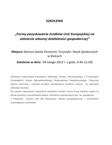 SZKOLENIE „Formy pozyskiwania środków Unii Europejskiej na założenie własnej działalności gospodarczej” Miejsce: Wyższa Szkoła Ekonomii, Turystyki i Nauk Społecznych w Kielcach Szkolenie w dniu: 04 lutego 2012 r. ( godz. 9.40-12.50) Szkolenie poprowadzą konsultanci Głównego Punktu Informacyjnego o Funduszach Europejskich Urzędu Marszałkowskiego Województwa Świętokrzyskiego. Dotyczyło będzie informacji o różnych formach pozyskiwania środków unijnych na założenie własnego biznesu. Do udziału zapraszamy wszystkich studentów Uczelni, którzy chcą wiedzieć więcej na temat procedury pozyskiwania dotacji. Szkolenie organizowane jest we współpracy z Władzami Uczelni oraz Kół Naukowych „Młodzi przedsiębiorczy” i „Przestrzeń” zrzeszających studentów. PROGRAM SZKOLENIA „Formy Pozyskiwania Środków Unii Europejskiej na założenie własnej działalności gospodarczej” Godzina 09.40-09.45 Temat Rejestracja uczestników szkolenia/ powitanie 1. „Dotacje UE na własny biznes”  09.45-10.45  10.45-11.00 Program Operacyjny Kapitał Ludzki, Działanie 6.2 „Wsparcie oraz promocja przedsiębiorczości i samo zatrudnienia” Program Rozwoju Obszarów Wiejskich, Działanie 312 „Tworzenie i rozwój mikroprzedsiębiorstw” Przerwa na kawę 2. „Wsparcie na e-biznes” Program Operacyjny Innowacyjna Gospodarka, Działanie 8.1 „Wspieranie działalności gospodarczej w dziedzinie gospodarki elektronicznej” 3. „Wdrażanie nowej technologii”  Program Operacyjny Innowacyjna Gospodarka, Działanie 4.3 „ Kredyt technologiczny”  11.00-12.45 4. „Alternatywne formy wsparcia biznesu”    12.50 Fundusz pożyczkowy, Fundusz poręczeniowy, Fundusze kapitałowe, Instytucje otoczenia biznesu Zakończenie