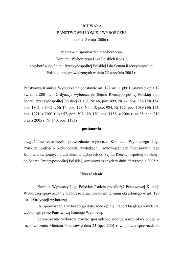 UCHWAŁA PAŃSTWOWEJ KOMISJI WYBORCZEJ z dnia 8 maja 2006 r. w sprawie sprawozdania wyborczego Komitetu Wyborczego Liga Polskich Rodzin z wyborów do Sejmu Rzeczypospolitej Polskiej i do Senatu Rzeczypospolitej Polskiej, przeprowadzonych w dniu 25 września 2005 r. Państwowa Komisja Wyborcza na podstawie art. 122 ust. 1 pkt 1 ustawy z dnia 12 kwietnia 2001 r. - Ordynacja wyborcza do Sejmu Rzeczypospolitej Polskiej i do Senatu Rzeczypospolitej Polskiej (Dz.U. Nr 46, poz. 499, Nr 74, poz. 786 i Nr 154, poz. 1802, z 2002 r. Nr 14, poz. 128, Nr 113, poz. 984, Nr 127, poz. 1089 i Nr 153, poz. 1271, z 2003 r. Nr 57, poz. 507 i Nr 130, poz. 1188, z 2004 r. nr 25, poz. 219 oraz z 2005 r. Nr 140, poz. 1173) postanawia przyjąć bez zastrzeżeń sprawozdanie wyborcze Komitetu Wyborczego Liga Polskich Rodzin o przychodach, wydatkach i zobowiązaniach finansowych tego Komitetu związanych z udziałem w wyborach do Sejmu Rzeczypospolitej Polskiej i do Senatu Rzeczypospolitej Polskiej, przeprowadzonych w dniu 25 września 2005 r. Uzasadnienie Komitet Wyborczy Liga Polskich Rodzin przedłożył Państwowej Komisji Wyborczej sprawozdanie wyborcze z zachowaniem terminu określonego w art. 120 ust. 1 Ordynacji wyborczej. Do sprawozdania wyborczego dołączono opinię i raport biegłego rewidenta, wybranego przez Państwową Komisję Wyborczą. Sprawozdanie wyborcze zostało sporządzone według wzoru określonego w rozporządzeniu Ministra Finansów z dnia 23 lipca 2001 r. w sprawie sprawozdania 2 komitetu wyborczego w wyborach do Sejmu Rzeczypospolitej Polskiej i do Senatu Rzeczypospolitej Polskiej (Dz.U. Nr 81, poz. 881). W wyniku badania sprawozdania wyborczego i załączonych do niego dokumentów oraz po zapoznaniu się z opinią i raportem biegłego rewidenta, Państwowa Komisja Wyborcza stwierdziła, że Komitet ten pozyskał na cele związane z wyborami przychody w kwocie 13.804.602,61 zł. Na kwotę tę składają się środki finansowe w wysokości 13.757.413,96 zł pochodzące – zgodnie z art. 111 ust. 1 Ordynacji wyborczej – z rachunku Funduszu Wyborczego Liga Polskich Rodzin o nr 81 1020 1097 0000 7502 0004 9213 i odsetki w wysokości 6.263,64 zł od środków finansowych lokowanych na krótkoterminowych rachunkach (lokat bankowych). Środki finansowe były gromadzone na rachunku bankowym Komitetu nr 50 1020 1097 0000 7002 0108 0738, prowadzonym w PKO BP S.A. w Warszawie. Do przychodów wliczono ponadto wartość usług świadczonych nieodpłatnie na rzecz Komitetu wycenioną na 47.188,65 zł. Pozyskiwanie i wydatkowanie środków finansowych przez Komitet odbywało się zgodnie z terminami określonymi w art. 110 ust. 2 i ust. 4 Ordynacji wyborczej. Komitet wykazał w sprawozdaniu wydatki w wysokości 15.881.816,79 zł, w tym nieuregulowane zobowiązania finansowe w kwocie 2.146.343,38 zł, które – zgodnie z art. 104 pkt 1 Ordynacji wyborczej – pokrywa partia polityczna ze środków Funduszu Wyborczego. Wykazane wydatki nie przekroczyły limitu określonego zgodnie z art. 114 Ordynacji wyborczej, który dla Komitetu Wyborczego Liga Polskich Rodzin wynosił 29. 814.909,25 zł. Koszty kampanii wyborczej prowadzonej w formach i na zasadach właściwych dla reklamy nie przekroczyły 80% limitu wydatków dla tego Komitetu. W wyniku przeprowadzonego badania sprawozdania wyborczego Komitetu Wyborczego Liga Polskich Rodzin, biegły rewident stwierdził występowanie materiałów wyborczych mogących świadczyć o prowadzeniu wspólnej kampanii wyborczej parlamentarnej i prezydenckiej. Cechą tych materiałów agitacyjnych jest wykorzystanie autorytetu kandydata na Prezydenta RP do promowania kandydatów na posłów i senatorów. Z tego faktu, udokumentowanego w dwóch przypadkach, nie można jednak wnioskować o ponoszeniu kosztów na rzecz kampanii prezydenckiej. 3 Należy wskazać, iż źródłem finansowania Komitetu Wyborczego Liga Polskich Rodzin był Fundusz Wyborczy partii. Ze środków Funduszu przekazywanych Komitetowi Wyborczemu Kandydata na Prezydenta RP Macieja Giertycha finansowana była równocześnie kampania prezydencka. Wspólną cechą prowadzonych kampanii wyborczych parlamentarnej i prezydenckiej było upowszechnianie programu partii i haseł wyborczych, wywodzących się z tego programu. Państwowa Komisja Wyborcza, po zapoznaniu się ze sprawozdaniem wyborczym Komitetu Wyborczego Liga Polskich Rodzin, dokumentami do niego załączonymi oraz opinią i raportem biegłego rewidenta, postanowiła jak w sentencji. Od niniejszego postanowienia nie przysługuje środek prawny. Przewodniczący Państwowej Komisji Wyborczej: Ferdynand Rymarz Zastępcy Przewodniczącego Państwowej Komisji Wyborczej: Jan Kacprzak, Stanisław Kosmal Członkowie Państwowej Komisji Wyborczej: Stefan Jaworski, Andrzej Kisielewicz, Andrzej Mączyński, Włodzimierz Ryms, Stanisław Zabłocki, Tadeusz Żyznowski