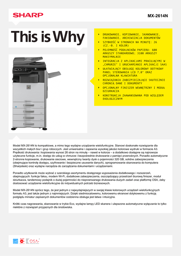MX-2614N DRUKOWANIE, KOPIOWANIE, SKANOWANIE, FAKSOWANIE, ARCHIWIZACJA DOKUMENTÓW SZYBKOŚĆ W STRONACH NA MINUTĘ: 26 (CZ.-B. I KOLOR) POJEMNOŚĆ PODAJNIKÓW PAPIERU: 600 ARKUSZY STANDARDOWO; 3100 ARKUSZY MAKSYMALNIE INTEGRACJA Z APLIKACJAMI PRACUJĄCYMI W „CHMURZE” I URUCHAMIANIE APLIKACJI SAAS UŁATWIAJĄCY OBSŁUGĘ KOLOROWY DOTYKOWY PANEL STEROWANIA LCD 7,0" ORAZ OPCJONALNA KLAWIATURA ROZWIĄZANIA ZABEZPIECZAJĄCE SKUTECZNIE CHRONIĄ DANE I DOKUMENTY OPCJONALNY FINISZER WEWNĘTRZNY I MODUŁ DZIURKACZA KONSTRUKCJA ZAAWANSOWANA POD WZGLĘDEM EKOLOGICZNYM Model MX-2614N to kompaktowe, a mimo tego wydajne urządzenie wielofunkcyjne. Stanowi doskonałe rozwiązanie dla wszystkich małych biur i grup roboczych. Jest uniwersalne i zapewnia wysokiej jakości kolorowe wydruki w formacie A3. Prędkość drukowania i kopiowania wynosi 26 stron na minutę – nawet w kolorze – a dodatkowo dostępne są najnowsze użyteczne funkcje, m.in. dostęp do usług w chmurze i bezpośrednie drukowanie z pamięci przenośnych. Ponadto automatyczne 2-stronne kopiowanie, drukowanie sieciowe, wewnętrzny twardy dysk o pojemności 320 GB, solidne zabezpieczenia (obejmujące kontrolę dostępu, szyfrowanie i bezpieczne usuwanie danych), oprogramowanie skanowania do komputera (Sharpdesk) oraz wydajne narzędzia do zarządzania dokumentami i urządzeniami. Ponadto użytkownik może wybrać z szerokiego asortymentu dostępnego wyposażenia dodatkowego i rozszerzeń, obejmujących: funkcje faksu, modem Wi-Fi, dodatkowe zabezpieczenia, oszczędzający przestrzeń biurową finiszer, moduł dziurkacza, tandemowy podajnik o dużej pojemności do nieprzerwanego drukowania dużych zadań oraz platformę OSA, żeby dostosować urządzenie wielofunkcyjne do indywidualnych potrzeb biznesowych. Model MX-2614N oprócz tego, że jest jednym z najwydajniejszych w swojej klasie kolorowych urządzeń wielofunkcyjnych formatu A3, jest także jednym z najmniejszych. Dzięki siedmiocalowemu, kolorowemu ekranowi dotykowemu z funkcją podglądu miniatur zapisanych dokumentów codzienna obsługa jest łatwa i intuicyjna. Krótki czas nagrzewania, skanowanie w trybie Eco, wydajne lampy LED skanera i ulepszone automatyczne wyłączanie to tylko niektóre z rozwiązań przyjaznych dla środowiska. KOPIARKA OGÓLNE Szybkość urządzenia, tryb kolorowy w str./min (A4): 26 Szybkość urządzenia, tryb cz.-b. w str./min (A4): 26 Szybkość urządzenia, tryb kolorowy w str./min (A3): 14 Szybkość urządzenia, tryb cz.-b. w str./min (A3): 14 Format papieru: min.- maks.: A5R - A3W Gramatura papieru (g/m²): 60 - 220 55 - 300 (multi-bypass) Pojemność: standardowa (arkuszy): 600 Pojemność: maks. (arkuszy): 3100 Czas nagrzewania (w sekundach): 18 Pamięć ogólna min./maks. (MB): 3072 (copier/printer)shared Pamięć drukarki min./maks. (MB): 2048 (option) Twardy dysk: STD Pojemność twardego dysku (GB): 320 Dupleks: STD Wymagania dotyczące źródła zasilania - sieciowe napięcie lokalne (Hz): 220 - 240V, 50/60Hz Pobór mocy (kW): 1,84 Wymiary (mm): 608 x 642 x 834 Waga (kg): 76,2 PODAJNIK DOKUMENTÓW Pojemność podajnika oryginałów (kartek): 100 FUNKCJA ARCHIWIZACJI DOKUMENTÓW Funkcja archiwizacji dokumentów (std./opcja): STD Pojemność funkcji przechowywania dokumentów - foldery główny i własny (liczba stron): 20.000 Pojemność funkcji przechowywania dokumentów - folder tymczasowy (liczba stron): 10.000 Programowane zadania: Kopiowanie, drukowanie, skanowanie, wysyłanie faksów Foldery do przechowywania dokumentów: Folder tymczasowy, folder główny, foldery własne (maks. 1000) Przechowywanie faksów poufnych: FAKS Faks (std./opcja): Opcja System kompresji: MH/MR/MMR/JBIG Protokół komunikacyjny: Super G3/G3 Czas transmisji (w sekundach): 3 Szybkość modemu (b/s): 33.600 - 2.400 Rozdzielczość transmisji: STD 203,2 x 97,8 dpi Ultra Fine 406,4 x 391 dpi Format dokumentu (min.): A5 Format dokumentu (maks.): A3 Pamięć (MB): 1024 Poziomy szarości: 256 Programowanie połączeń; skrócone, szybkie: 1000 Rozsyłanie (maks. liczba odbiorców): 500 Format oryginału (maks.): A3 Czas pierwszej kopii kolorowej (sek.): 8,1 Czas pierwszej kopii cz.-b. (sek.): 5,9 Sorter elektroniczny (standard): Kopiowanie ciągłe (maks. kopii): 999 Rozdzielczość skanowania w trybie cz.-b. (dpi): 600 x 600,600 x 400,600 x 300 Rozdzielczość skanowania w trybie kolorowym (dpi): 600 x 600 Rozdzielczość druku (dpi): 600 x 600,9600 equivalent x 600 (depending on print mode) Gradacja (liczba odcieni) - tryb czarno-biały: 2 Gradacja (liczba odcieni) - tryb kolorowy: 256 Zakres regulacji skali (%): 25 - 400 Zaprogramowane skale kopiowania: 10 SKANER Skaner sieciowy (std./opcja): STD Skanowanie w trybach "pull scan" i "push scan": Rozdzielczość w trybie "push scan" (dpi): 100,200, 300,400, 600 Rozdzielczość w trybie "pull scan" (dpi): 75,100, 150,200, 300,400, 600 50 to 9600 custom Formaty plików: TIFF, PDF, PDF/A-1b, Encrypted PDF, JPEG (colour only), XPS Narzędzia skanera: Sharpdesk, Sharpdesk Mobile, Sharp Network Scanner Tool, Sharp OSA Network Scanner Tool (requires MX-AMX2 and licenses) Skanowanie na pulpit: Skanowanie do FTP, Email: Skanowanie do folderu sieciowego: Skanowanie do pamięci USB: DRUKARKA Rozdzielczość (dpi): 600 x 600 Podwyższona rozdzielczość (dpi): 9600 equivalent x 600 Drukarka sieciowa (std./opcja): Standard Interfejs standardowy/opcjonalny: Standard USB 2.0,10Base-T/100Base-TX/1000Base-T Obsługiwane systemy operacyjne - standardowo: Windows XP/Windows Server 2003/2008/2008R2, Windows Vista/ Windows 7 Obsługiwane systemy operacyjne - opcjonalnie: Mac OS X 10.4.11/10.5 - 10.5.8,10.6 - 10.6.8,10.7 - 10.7.4 Protokoły sieciowe: TCP/IP (IPv4 and IPv6), IPX/SPX (NetWare), NetBEUI, EtherTalk (AppleTalk) Protokoły druku: LPR, Raw TCP (port 9100), POP3 (drukowanie przez email), HTTP, aplikacja Novell Printserver z NDS i Bindery, FTP do pobierania plików do druku, druk EtherTalk, IPP PDL std./opcja: Standard