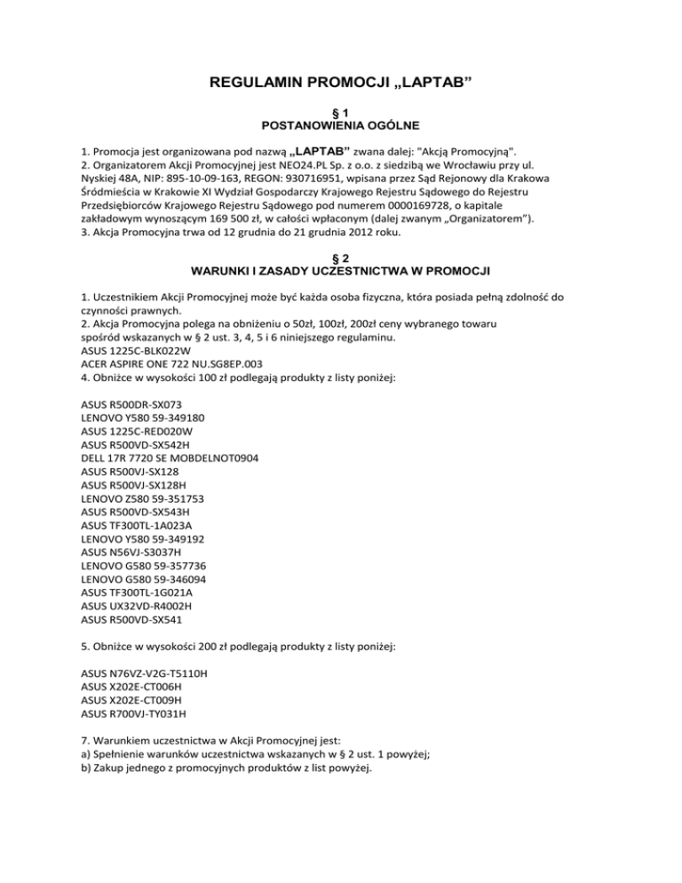 REGULAMIN PROMOCJI „LAPTAB” §1 POSTANOWIENIA OGÓLNE 1. Promocja jest organizowana pod nazwą „LAPTAB” zwana dalej: "Akcją Promocyjną". 2. Organizatorem Akcji Promocyjnej jest NEO24.PL Sp. z o.o. z siedzibą we Wrocławiu przy ul. Nyskiej 48A, NIP: 895‐10‐09‐163, REGON: 930716951, wpisana przez Sąd Rejonowy dla Krakowa Śródmieścia w Krakowie XI Wydział Gospodarczy Krajowego Rejestru Sądowego do Rejestru Przedsiębiorców Krajowego Rejestru Sądowego pod numerem 0000169728, o kapitale zakładowym wynoszącym 169 500 zł, w całości wpłaconym (dalej zwanym „Organizatorem”). 3. Akcja Promocyjna trwa od 12 grudnia do 21 grudnia 2012 roku. §2 WARUNKI I ZASADY UCZESTNICTWA W PROMOCJI 1. Uczestnikiem Akcji Promocyjnej może być każda osoba fizyczna, która posiada pełną zdolność do czynności prawnych. 2. Akcja Promocyjna polega na obniżeniu o 50zł, 100zł, 200zł ceny wybranego towaru spośród wskazanych w § 2 ust. 3, 4, 5 i 6 niniejszego regulaminu. ASUS 1225C-BLK022W ACER ASPIRE ONE 722 NU.SG8EP.003 4. Obniżce w wysokości 100 zł podlegają produkty z listy poniżej: ASUS R500DR-SX073 LENOVO Y580 59-349180 ASUS 1225C-RED020W ASUS R500VD-SX542H DELL 17R 7720 SE MOBDELNOT0904 ASUS R500VJ-SX128 ASUS R500VJ-SX128H LENOVO Z580 59-351753 ASUS R500VD-SX543H ASUS TF300TL-1A023A LENOVO Y580 59-349192 ASUS N56VJ-S3037H LENOVO G580 59-357736 LENOVO G580 59-346094 ASUS TF300TL-1G021A ASUS UX32VD-R4002H ASUS R500VD-SX541 5. Obniżce w wysokości 200 zł podlegają produkty z listy poniżej: ASUS N76VZ-V2G-T5110H ASUS X202E-CT006H ASUS X202E-CT009H ASUS R700VJ-TY031H 7. Warunkiem uczestnictwa w Akcji Promocyjnej jest: a) Spełnienie warunków uczestnictwa wskazanych w § 2 ust. 1 powyżej; b) Zakup jednego z promocyjnych produktów z list powyżej. §3 RABAT 1. Każdemu Uczestnikowi Akcji Promocyjnej przysługuje rabat kwotowy w zależności od zakupu wybranego towaru objętego Akcją Promocyjną, wg listy produktów ujętych w § 2 ust. 3, 4, 5 i 6 niniejszego regulaminu. 2. Rabat zostanie odpowiednio naliczony w koszyku, po dodaniu promocyjnego produktu i po wpisaniu kodu rabatowego: LAPTAB. 3. Do koszyka można dodać dowolną ilość promocyjnych produktów, rabat zostanie odliczony od każdego z produktów. 4. Ilość produktów objętych promocją jest ograniczona i zależy od stanów magazynowych. §5 POSTANOWIENIA KOŃCOWE 1. Regulamin niniejszy jest jedynym dokumentem określającym zasady Akcji Promocyjnej. 2. Wszelkie reklamacje dotyczące przebiegu Akcji Promocyjnej Uczestnicy mogą zgłaszać w formie pisemnej pod rygorem nieważności, przez cały czas trwania Promocji oraz w terminie 14 dni od dnia zakończenia Akcji Promocyjnej. Reklamacje należy przesyłać listem poleconym do Organizatora, na adres NEO24.PL Sp. z o.o., ul. Nyska 48A, 50‐505 Wrocław. O zachowaniu terminu złożenia reklamacji decyduje data stempla pocztowego. Uczestnik Akcji Promocyjnej zgłaszający reklamację zostanie powiadomiony pisemnie o wyniku postępowania reklamacyjnego. 3. Udział Uczestnika w Akcji Promocyjnej oznacza akceptację jej zasad zawartych w niniejszym regulaminie. 4. Organizator zastrzega sobie prawo do zmiany niniejszego regulaminu w czasie trwania Akcji Promocyjnej, z tym, że zmiany te nie mogą naruszać praw już nabytych przez Uczestników Akcji Promocyjnej. 5. Wszelkie materiały promocyjno– reklamowe mają charakter wyłącznie informacyjny. 6. Regulamin niniejszy jest dostępny: a) W siedzibie NEO24.PL Sp z o.o. b) Na stronie internetowej http://www.neostatic.pl/images2/promocje/big/rabatobranie2/regulamin.pdf NEO24.PL Sp. z o.o.
