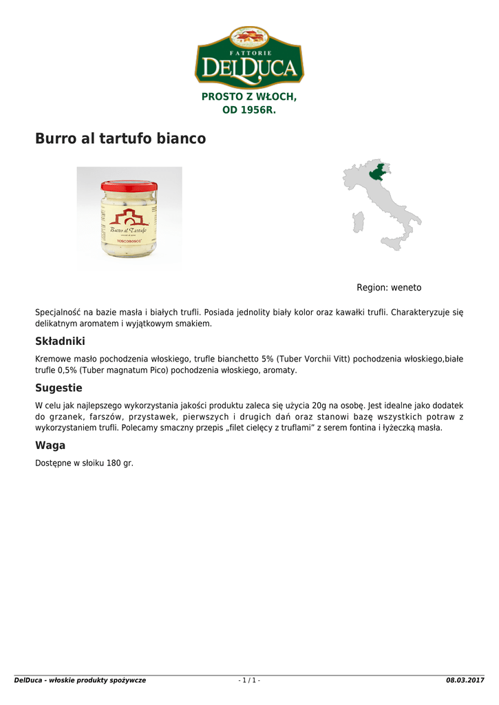 PROSTO Z WŁOCH, OD 1956R. Burro al tartufo bianco Region: weneto Specjalność na bazie masła i białych trufli. Posiada jednolity biały kolor oraz kawałki trufli. Charakteryzuje się delikatnym aromatem i wyjątkowym smakiem. Składniki Kremowe masło pochodzenia włoskiego, trufle bianchetto 5% (Tuber Vorchii Vitt) pochodzenia włoskiego,białe trufle 0,5% (Tuber magnatum Pico) pochodzenia włoskiego, aromaty. Sugestie W celu jak najlepszego wykorzystania jakości produktu zaleca się użycia 20g na osobę. Jest idealne jako dodatek do grzanek, farszów, przystawek, pierwszych i drugich dań oraz stanowi bazę wszystkich potraw z wykorzystaniem trufli. Polecamy smaczny przepis „filet cielęcy z truflami” z serem fontina i łyżeczką masła. Waga Dostępne w słoiku 180 gr. DelDuca - włoskie produkty spożywcze -1/1- 08.03.2017