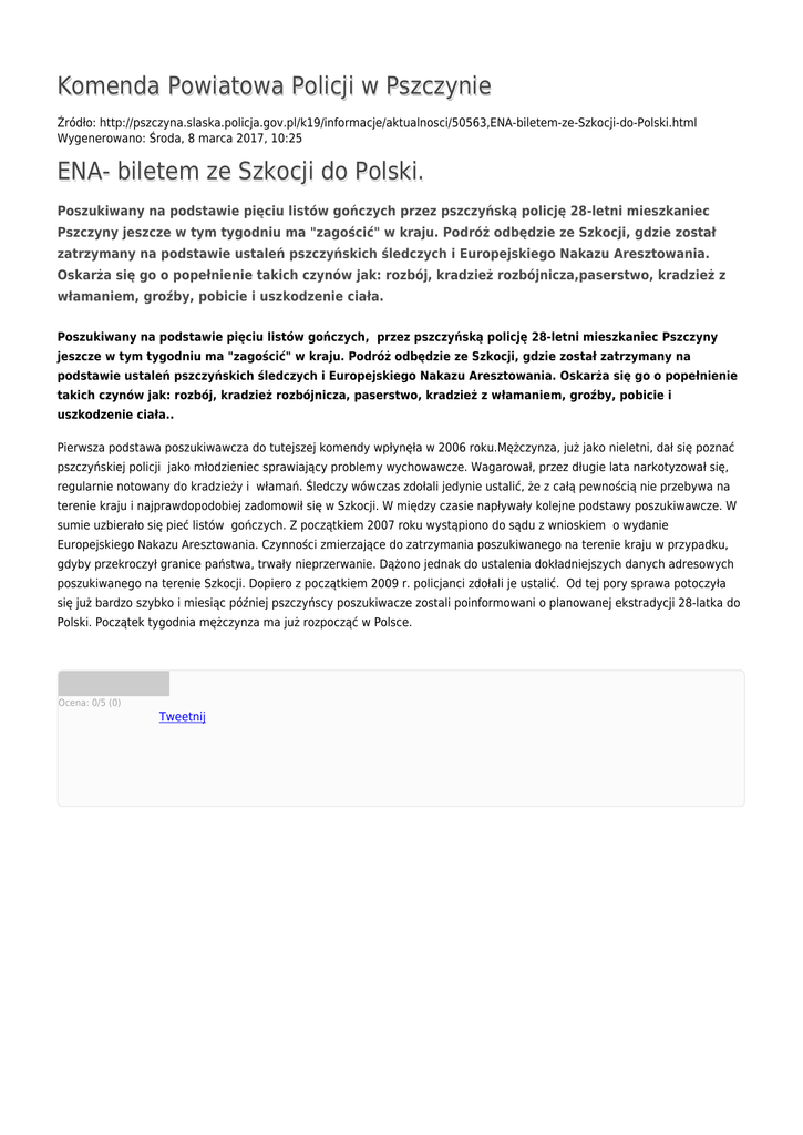 Komenda Powiatowa Policji w Pszczynie Źródło: http://pszczyna.slaska.policja.gov.pl/k19/informacje/aktualnosci/50563,ENA-biletem-ze-Szkocji-do-Polski.html Wygenerowano: Środa, 8 marca 2017, 10:25 ENA- biletem ze Szkocji do Polski. Poszukiwany na podstawie pięciu listów gończych przez pszczyńską policję 28-letni mieszkaniec Pszczyny jeszcze w tym tygodniu ma "zagościć" w kraju. Podróż odbędzie ze Szkocji, gdzie został zatrzymany na podstawie ustaleń pszczyńskich śledczych i Europejskiego Nakazu Aresztowania. Oskarża się go o popełnienie takich czynów jak: rozbój, kradzież rozbójnicza,paserstwo, kradzież z włamaniem, groźby, pobicie i uszkodzenie ciała. Poszukiwany na podstawie pięciu listów gończych, przez pszczyńską policję 28-letni mieszkaniec Pszczyny jeszcze w tym tygodniu ma "zagościć" w kraju. Podróż odbędzie ze Szkocji, gdzie został zatrzymany na podstawie ustaleń pszczyńskich śledczych i Europejskiego Nakazu Aresztowania. Oskarża się go o popełnienie takich czynów jak: rozbój, kradzież rozbójnicza, paserstwo, kradzież z włamaniem, groźby, pobicie i uszkodzenie ciała.. Pierwsza podstawa poszukiwawcza do tutejszej komendy wpłynęła w 2006 roku.Mężczynza, już jako nieletni, dał się poznać pszczyńskiej policji jako młodzieniec sprawiający problemy wychowawcze. Wagarował, przez długie lata narkotyzował się, regularnie notowany do kradzieży i włamań. Śledczy wówczas zdołali jedynie ustalić, że z całą pewnością nie przebywa na terenie kraju i najprawdopodobiej zadomowił się w Szkocji. W między czasie napływały kolejne podstawy poszukiwawcze. W sumie uzbierało się pieć listów gończych. Z początkiem 2007 roku wystąpiono do sądu z wnioskiem o wydanie Europejskiego Nakazu Aresztowania. Czynności zmierzające do zatrzymania poszukiwanego na terenie kraju w przypadku, gdyby przekroczył granice państwa, trwały nieprzerwanie. Dążono jednak do ustalenia dokładniejszych danych adresowych poszukiwanego na terenie Szkocji. Dopiero z początkiem 2009 r. policjanci zdołali je ustalić. Od tej pory sprawa potoczyła się już bardzo szybko i miesiąc później pszczyńscy poszukiwacze zostali poinformowani o planowanej ekstradycji 28-latka do Polski. Początek tygodnia mężczynza ma już rozpocząć w Polsce. Ocena: 0/5 (0) Tweetnij