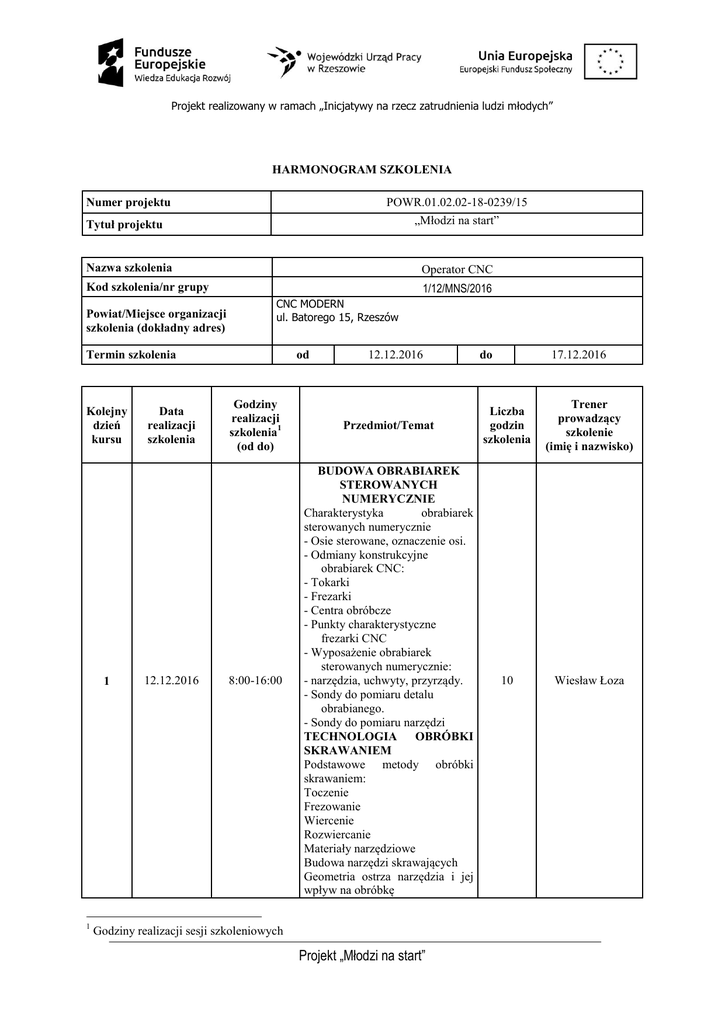 Projekt realizowany w ramach „Inicjatywy na rzecz zatrudnienia ludzi młodych” HARMONOGRAM SZKOLENIA POWR.01.02.02-18-0239/15 Numer projektu „Młodzi na start” Tytuł projektu Nazwa szkolenia Operator CNC 1/12/MNS/2016 Kod szkolenia/nr grupy Powiat/Miejsce organizacji szkolenia (dokładny adres) CNC MODERN ul. Batorego 15, Rzeszów Termin szkolenia Kolejny dzień kursu 1 1 Data realizacji szkolenia 12.12.2016 od Godziny realizacji szkolenia1 (od do) 8:00-16:00 12.12.2016 17.12.2016 do Przedmiot/Temat Liczba godzin szkolenia Trener prowadzący szkolenie (imię i nazwisko) BUDOWA OBRABIAREK STEROWANYCH NUMERYCZNIE Charakterystyka obrabiarek sterowanych numerycznie - Osie sterowane, oznaczenie osi. - Odmiany konstrukcyjne obrabiarek CNC: - Tokarki - Frezarki - Centra obróbcze - Punkty charakterystyczne frezarki CNC - Wyposażenie obrabiarek sterowanych numerycznie: - narzędzia, uchwyty, przyrządy. - Sondy do pomiaru detalu obrabianego. - Sondy do pomiaru narzędzi TECHNOLOGIA OBRÓBKI SKRAWANIEM Podstawowe metody obróbki skrawaniem: Toczenie Frezowanie Wiercenie Rozwiercanie Materiały narzędziowe Budowa narzędzi skrawających Geometria ostrza narzędzia i jej wpływ na obróbkę 10 Wiesław Łoza Godziny realizacji sesji szkoleniowych Projekt „Młodzi na start” Projekt realizowany w ramach „Inicjatywy na rzecz zatrudnienia ludzi młodych” Oznaczenia kodowe narzędzi skrawających wg ISO Dobór narzędzi i parametrów do danej operacji 8:00-16:00 2 13.12.2016 8:00-16:00 3 14.12.2016 8:00-16:00 4 15.12.2016 PROGRAMOWANIE OBRABIAREK CNC (ISO) WPROWADZENIE Komputerowe sterowanie numeryczne - wprowadzenie Układy sterowania numerycznego CNC Metody programowania obrabiarek CNC Geometryczne podstawy obróbki CNC układy współrzędnych i punkty detalu obrabianego. Struktura programu obróbki: - nazwa programu - funkcje przygotowawcze G - funkcje maszynowe ( pomocnicze) M - funkcje technologiczne: S, F, - funkcje narzędziowe: T, D, H PROGRAMOWANIE OBRABIAREK CNC (ISO) zajęcia praktyczne na symulatorach - Programowanie podstawowych funkcji przygotowawczych. - Programowanie w układzie absolutnym. - Programowanie w układzie przyrostowym. - Programowanie przemieszczeń liniowych. - Programowanie przemieszczeń liniowych jałowych. - Programowanie przemieszczeń liniowych roboczych. - Programowanie interpolacji kołowej. - Programowanie z użyciem korekcji narzędzia. - Programowanie czasowego postoju. - Programowanie cykli obróbkowych. Zajęcia praktyczne na Obrabiarkach CNC Procedura uruchamiania i wyłączania maszyny. Bazowanie obrabiarki Tryby pracy obrabiarki. Uzbrojenie obrabiarki: - mocowanie narzędzi Projekt „Młodzi na start” Wiesław Łoza 10 Wiesław Łoza 10 Wiesław Łoza 10 Projekt realizowany w ramach „Inicjatywy na rzecz zatrudnienia ludzi młodych” 8:00-16:00 5 16.12.2016 8:00-16:00 Określenie wartości korekcyjnych narzędzi Zajęcia praktyczne na Obrabiarkach CNC Mocowanie i ustawienie półfabrykatu. Ustawianie punktu zerowego przedmiotu. Najazdy kontrolne. Napisanie programu na obrabiarce wykonanie detalu Pomiary – kontrola jakości wykonanego przedmiotu. Dokonanie zmian w programie obróbczym Powtórzenie programu od dowolnego bloku Zachowanie się w sytuacjach awaryjnych Czyszczenie i konserwacja maszyny po zakończonej pracy Wiesław Łoza 10 Wiesław Łoza PODSTAWY RYSUNKU TECHNICZNEGO - Rzutowanie prostokątne. - Widoki kłady i przekroje. - Elementy i zasady wymiarowania. - Zasady tolerowania wymiarów. 6 17.12.2016 - Pasowania części maszyn. 10 - Odchyłki kształtu i położenia – sposoby tolerowania. - Oznaczenie chropowatości powierzchni - Dokumentacja technologiczna – czytanie …………………………………………………… Data i podpis Beneficjenta Projekt „Młodzi na start”