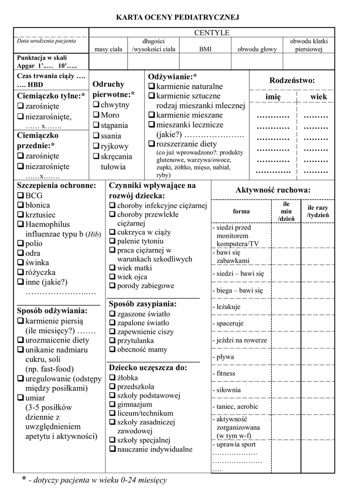 KARTA OCENY PEDIATRYCZNEJ CENTYLE Data urodzenia pacjenta masy ciała długości /wysokości ciała obwodu klatki piersiowej obwodu głowy BMI Punktacja w skali Apgar 1’..… 10’….. Czas trwania ciąży …. …. HBD Odruchy Ciemiączko tylne:* pierwotne:* chwytny zarośnięte Moro niezarośnięte, stąpania …… x……. Ciemiączko ssania przednie:* ryjkowy zarośnięte skręcania niezarośnięte tułowia ……x……. Szczepienia ochronne: BCG błonica krztusiec Haemophilus influenzae typu b (Hib) polio odra świnka różyczka inne (jakie?) …………………..… ____________________ Sposób odżywiania: karmienie piersią (ile miesięcy?) ……. urozmaicenie diety unikanie nadmiaru cukru, soli (np. fast-food) uregulowanie (odstępy między posiłkami) umiar (3-5 posiłków dziennie z uwzględnieniem apetytu i aktywności) Odżywianie:* karmienie naturalne karmienie sztuczne rodzaj mieszanki mlecznej karmienie mieszane mieszanki lecznicze (jakie?) …………………. rozszerzanie diety (co już wprowadzono?: produkty glutenowe, warzywa/owoce, zupki, żółtko, mięso, nabiał, ryby) Czynniki wpływające na rozwój dziecka: choroby infekcyjne ciężarnej choroby przewlekłe ciężarnej cukrzyca w ciąży palenie tytoniu praca ciężarnej w warunkach szkodliwych wiek matki wiek ojca porody zabiegowe ________________________ Sposób zasypiania: zgaszone światło zapalone światło zapewnienie ciszy przytulanka obecność mamy ________________________ Dziecko uczęszcza do: żłobka przedszkola szkoły podstawowej gimnazjum liceum/technikum szkoły zasadniczej zawodowej szkoły specjalnej nauczanie indywidualne * - dotyczy pacjenta w wieku 0-24 miesięcy Rodzeństwo: imię ………… ………… ………… ………… ………… …………. wiek ……… ……… ……… ……… ……… ……… Aktywność ruchowa: forma - siedzi przed monitorem komputera/TV - bawi się zabawkami - siedzi – bawi się - biega – bawi się - leżakuje - spaceruje - jeździ na rowerze - pływa - fitness - siłownia - taniec, aerobic - aktywność zorganizowana (w tym w-f) - uprawia sport ………………. ………………… …. ile min /dzień ile razy /tydzień KARTA OCENY PEDIATRYCZNEJ CENTYLE Data urodzenia pacjenta masy ciała długości /wysokości ciała obwodu klatki piersiowej obwodu głowy BMI Punktacja w skali Apgar 1’..… 10’….. Czas trwania ciąży …. …. HBD Odruchy Ciemiączko tylne:* pierwotne:* chwytny zarośnięte Moro niezarośnięte, stąpania …… x……. Ciemiączko ssania przednie:* ryjkowy zarośnięte skręcania niezarośnięte tułowia ……x……. Szczepienia ochronne: BCG błonica krztusiec Haemophilus influenzae typu b (Hib) polio odra świnka różyczka inne (jakie?) …………………..… ____________________ Sposób odżywiania: karmienie piersią (ile miesięcy?) ……. urozmaicenie diety unikanie nadmiaru cukru, soli (np. fast-food) uregulowanie (odstępy między posiłkami) umiar (3-5 posiłków dziennie z uwzględnieniem apetytu i aktywności) Odżywianie:* karmienie naturalne karmienie sztuczne rodzaj mieszanki mlecznej karmienie mieszane mieszanki lecznicze (jakie?) …………………. rozszerzanie diety (co już wprowadzono?: produkty glutenowe, warzywa/owoce, zupki, żółtko, mięso, nabiał, ryby) Czynniki wpływające na rozwój dziecka: choroby infekcyjne ciężarnej choroby przewlekłe ciężarnej cukrzyca w ciąży palenie tytoniu praca ciężarnej w warunkach szkodliwych wiek matki wiek ojca porody zabiegowe ________________________ Sposób zasypiania: zgaszone światło zapalone światło zapewnienie ciszy przytulanka obecność mamy ________________________ Dziecko uczęszcza do: żłobka przedszkola szkoły podstawowej gimnazjum liceum/technikum szkoły zasadniczej zawodowej szkoły specjalnej nauczanie indywidualne * - dotyczy pacjenta w wieku 0-24 miesięcy Rodzeństwo: imię ………… ………… ………… ………… ………… …………. wiek ……… ……… ……… ……… ……… ……… Aktywność ruchowa: forma - siedzi przed monitorem komputera/TV - bawi się zabawkami - siedzi – bawi się - biega – bawi się - leżakuje - spaceruje - jeździ na rowerze - pływa - fitness - siłownia - taniec, aerobic - aktywność zorganizowana (w tym w-f) - uprawia sport ………………. ………………… …. ile min /dzień ile razy /tydzień