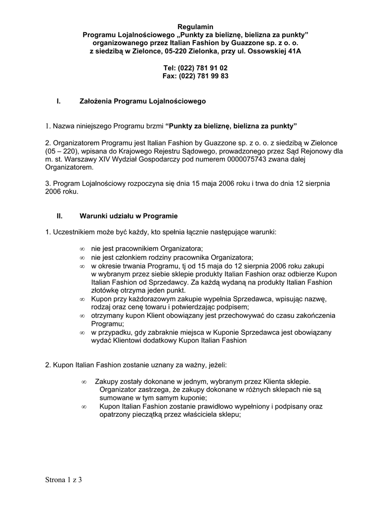Regulamin Programu Lojalnościowego „Punkty za bieliznę, bielizna za punkty” organizowanego przez Italian Fashion by Guazzone sp. z o. o. z siedzibą w Zielonce, 05-220 Zielonka, przy ul. Ossowskiej 41A Tel: (022) 781 91 02 Fax: (022) 781 99 83 I. Założenia Programu Lojalnościowego 1. Nazwa niniejszego Programu brzmi “Punkty za bieliznę, bielizna za punkty” 2. Organizatorem Programu jest Italian Fashion by Guazzone sp. z o. o. z siedzibą w Zielonce (05 – 220), wpisana do Krajowego Rejestru Sądowego, prowadzonego przez Sąd Rejonowy dla m. st. Warszawy XIV Wydział Gospodarczy pod numerem 0000075743 zwana dalej Organizatorem. 3. Program Lojalnościowy rozpoczyna się dnia 15 maja 2006 roku i trwa do dnia 12 sierpnia 2006 roku. II. Warunki udziału w Programie 1. Uczestnikiem może być każdy, kto spełnia łącznie następujące warunki: • • • • • • nie jest pracownikiem Organizatora; nie jest członkiem rodziny pracownika Organizatora; w okresie trwania Programu, tj od 15 maja do 12 sierpnia 2006 roku zakupi w wybranym przez siebie sklepie produkty Italian Fashion oraz odbierze Kupon Italian Fashion od Sprzedawcy. Za każdą wydaną na produkty Italian Fashion złotówkę otrzyma jeden punkt. Kupon przy każdorazowym zakupie wypełnia Sprzedawca, wpisując nazwę, rodzaj oraz cenę towaru i potwierdzając podpisem; otrzymany kupon Klient obowiązany jest przechowywać do czasu zakończenia Programu; w przypadku, gdy zabraknie miejsca w Kuponie Sprzedawca jest obowiązany wydać Klientowi dodatkowy Kupon Italian Fashion 2. Kupon Italian Fashion zostanie uznany za ważny, jeżeli: • • Strona 1 z 3 Zakupy zostały dokonane w jednym, wybranym przez Klienta sklepie. Organizator zastrzega, że zakupy dokonane w różnych sklepach nie są sumowane w tym samym kuponie; Kupon Italian Fashion zostanie prawidłowo wypełniony i podpisany oraz opatrzony pieczątką przez właściciela sklepu; Regulamin Programu Lojalnościowego „Punkty za bieliznę, bielizna za punkty” organizowanego przez Italian Fashion by Guazzone sp. z o. o. z siedzibą w Zielonce, 05-220 Zielonka, przy ul. Ossowskiej 41A Tel: (022) 781 91 02 Fax: (022) 781 99 83 • Kupon będzie umożliwiał ustalenie przez Organizatora w jednoznaczny sposób danych osobowych uczestnika Programu (w tym imienia, nazwiska, adresu, telefonu kontaktowego, adresu e – mail) wraz z oświadczeniem następującej treści: Wyrażam zgodę na wykorzystywanie moich danych osobowych dla działań marketingowych prowadzonych przez firmę Italian Fashion by Guazzone sp. z o. o z siedzibą w Zielonce, ul. Ossowska 41a, zgodnie z ustawą z dnia 29 sierpnia 1997 roku o ochronie danych osobowych (Dz. U. Z dnia 29 czerwca 1997, nr 133, poz. 883) 3. Poprzez wypełnienie Kuponu uczestnik Programu wyraża zgodę na wykorzystywanie jego danych osobowych dla działań marketingowych prowadzonych przez Organizatora, zgodnie z ustawą z dnia 29 sierpnia 1997 roku o ochronie danych osobowych (Dz. U. Z dnia 29 czerwca 1997, nr 133, poz. 883) 4. Nad przebiegiem Programu czuwać będzie Organizator - Dział Handlowy Italian Fashion. III. Zasady naliczania punktów. • • • IV. Klient, który zdobędzie od160 do 249 punktów zyskuje możliwość otrzymania produktu Italian Fashion o wartości 10% sumy jego dokonanych i wpisanych w kupon zakupów; Klient, który zdobędzie od 250 do 499 punktów zyskuje możliwość otrzymania produktu Italian Fashion o wartości 12% sumy jego dokonanych i wpisanych w kupon zakupów; Klient, który zdobędzie 500 punktów lub więcej zyskuje możliwość otrzymania produktu Italian Fashion o wartości 15% sumy jego dokonanych i wpisanych w kupon zakupów Zasady otrzymywania nagród: • • • • • • Strona 2 z 3 w momencie uzyskania odpowiedniej ilości punktów, Klient może odebrać nagrodę w sklepie, w którym dokonywał zakupów w terminie od 14 sierpnia do 16 września 2006 roku; do odbioru nagrody konieczny jest prawidłowo wypełniony Kupon Italian Fashion, na którym Sprzedawca zobowiązany jest wpisać w polu „Twój prezent” nazwę, rodzaj, cenę, ilość produktu wybranego przez Klienta; Odebranie Nagrody Klient potwierdza własnoręcznie złożonym podpisem; Po odebraniu Nagrody Klient przekazuje Sprzedawcy Kupon Italian Fashion; Klient nie może otrzymać w zamian za Nagrodę ekwiwalentu pieniężnego; Towar zakupiony w trakcie trwania Programu, jak i Nagroda nie podlegają zwrotom Regulamin Programu Lojalnościowego „Punkty za bieliznę, bielizna za punkty” organizowanego przez Italian Fashion by Guazzone sp. z o. o. z siedzibą w Zielonce, 05-220 Zielonka, przy ul. Ossowskiej 41A Tel: (022) 781 91 02 Fax: (022) 781 99 83 V. Dostępność Regulaminu i ogólnych zasad Programu. 1. Pełny Regulamin dostępny jest w siedzibie Organizatora oraz na stronie internetowej www.italianfashion.pl w zakładce Program Lojalnościowy dla Klientów “Punkty za bieliznę, bielizna za punkty”. 2. Przystępując do Programu, uczestnik akceptuje treść Regulaminu i poddaje się jego postanowieniom. VI. Postanowienia końcowe 1. Organizator nie ponosi odpowiedzialności za działalność innych osób, niezwiązanych z organizacją Programu. 2. Wszelkie spory związane z niniejszym Programem Lojalnościowym będą rozstrzygane przez sąd właściwy dla Organizatora VII. Reklamacje 1. Wszelkie roszczenia, reklamacje, uwagi i zastrzeżenia, co do przebiegu Programu można składać wyłącznie pisemnie pod adresem Organizatora najpóźniej w terminie do dnia 16 września 2006 (decyduje data wpływu) 2. Reklamacje rozpatrywane będą przez Organizatora w terminie 7 dni od dnia ich doręczenia, najpóźniej jednak do dnia 22 września 2006. Odpowiedzi zostaną wysłane pocztą na adres wskazany przez składającego reklamację. Strona 3 z 3