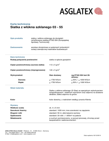 Karta techniczna Siatka z włókna szklanego 03 - 55 Opis produktu siatka z włókna szklanego do dociepleń certyfikowana według ETAG 004 (Europejskiej Aprobaty Technicznej) Zastosowanie warstwa zbrojeniowa w systemach tynkarskich/ izolacji zewnętrznej materiałów budowlanych Dane techniczne Rodzaj połączenia powierzchni siatka w splocie gazejskim Ciężar powierzchniowy (surowa siatka) 113 ± 5 g/m 2 Ciężar powierzchniowy (impregnowana) 140 ± 5 g/m 2 Wytrzymałość Stan dostawy wg ETAG 004 test 28dniowy: Osnowa > 1750 N/5cm > 50% i > 1000 N/5cm Wątek > 1750 N/5cm > 50% I > 1000 N/5cm Skład materiału Siatka z włókna szklanego (E-Glas) ze specjalnym wykończeniem antypoślizgowym / stabilnym wymiarem oraz odporna na działanie alkaliów; siatka odporna na gnicie Kolor kolor dowolny, z nadrukiem według uznania Klienta Wymiary Wielkość oczka ok. 4 x 5 mm Szerokość tkaniny standard: 1000 mm; inne szerokości na zapytanie Długość rolki standard: 50 m; alternatywne wymiary Opakowanie standard: 33 rolki = 1.650m² na palecie Składowanie w suchym pomieszczeniu, w pozycji pionowej, chroniąc przed bezpośrednim nasłonecznieniem ASGLATEX Ohorn GmbH . Röderstr. 15 . 01896 Ohorn . Germany Tel.: +49 35955-859-0 . Fax: +49 35955-859-99 E-Mail: [email protected] . www.asglatex.com Data wydania: 03/12/2013