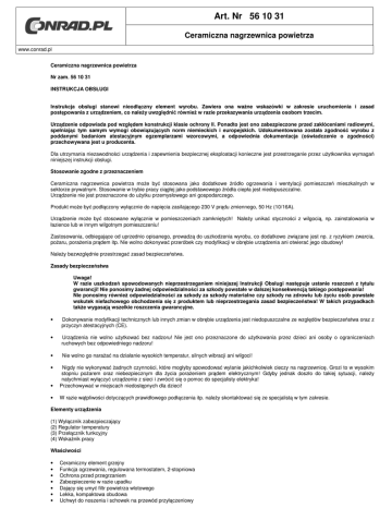 Art. Nr 56 10 31 Ceramiczna nagrzewnica powietrza www.conrad.pl Ceramiczna nagrzewnica powietrza Nr zam. 56 10 31 INSTRUKCJA OBSŁUGI Instrukcja obsługi stanowi nieodłączny element wyrobu. Zawiera ona ważne wskazówki w zakresie uruchomienia i zasad postępowania z urządzeniem, co należy uwzględnić również w razie przekazywania urządzenia osobom trzecim. Urządzenie odpowiada pod względem konstrukcji klasie ochrony II. Ponadto jest ono zabezpieczone przed zakłóceniami radiowymi, spełniając tym samym wymogi obowiązujących norm niemieckich i europejskich. Udokumentowana została zgodność wyrobu z poddanymi badaniom atestacyjnym egzemplarzami wzorcowymi, a odpowiednia dokumentacja (oświadczenie o zgodności) przechowywana jest u producenta. Dla utrzymania niezawodności urządzenia i zapewnienia bezpiecznej eksploatacji konieczne jest przestrzeganie przez użytkownika wymagań niniejszej instrukcji obsługi. Stosowanie zgodne z przeznaczeniem Ceramiczna nagrzewnica powietrza może być stosowana jako dodatkowe źródło ogrzewania i wentylacji pomieszczeń mieszkalnych w sektorze prywatnym. Stosowanie w trybie pracy ciągłej jako podstawowego źródła ciepła jest niedopuszczalne. Urządzenie nie jest przeznaczone do użytku przemysłowego ani gospodarczego. Produkt może być podłączony wyłącznie do napięcia zasilającego 230 V prądu zmiennego, 50 Hz (10/16A). Urządzenie może być stosowane wyłącznie w pomieszczeniach zamkniętych! Należy unikać styczności z wilgocią, np. zainstalowania w łazience lub w innym wilgotnym pomieszczeniu! Zastosowania, odbiegające od uprzednio opisanego, prowadzą do uszkodzenia wyrobu, co dodatkowo związane jest np. z ryzykiem zwarcia, pożaru, porażenia prądem itp. Nie wolno dokonywać przeróbek czy modyfikacji w obrębie urządzenia ani otwierać jego obudowy! Należy bezwzględnie przestrzegać zasad bezpieczeństwa. Zasady bezpieczeństwa Uwaga! W razie uszkodzeń spowodowanych nieprzestrzeganiem niniejszej Instrukcji Obsługi następuje ustanie roszczeń z tytułu gwarancji! Nie ponosimy żadnej odpowiedzialności za szkody powstałe w dalszej konsekwencją takiego postępowania! Nie ponosimy również odpowiedzialności za szkody za szkody materialne czy szkody na zdrowiu lub życiu osób powstałe wskutek niefachowego obchodzenia się z produktem lub nieprzestrzegania zasad bezpieczeństwa! W takich przypadkach także wygasają wszelkie roszczenia gwarancyjne. • Dokonywanie modyfikacji technicznych lub innych zmian w obrębie urządzenia jest niedopuszczalne ze względów bezpieczeństwa oraz z przyczyn atestacyjnych (CE). • Urządzenia nie wolno użytkować bez nadzoru! Nie jest ono przeznaczone do użytkowania przez dzieci ani osoby o ograniczeniach ruchowych bez odpowiedniego nadzoru! • Nie wolno go narażać na działanie wysokich temperatur, silnych wibracji ani wilgoci! • Nigdy nie wykonywać żadnych czynności, które mogłyby spowodować wylanie jakichkolwiek cieczy na nagrzewnicę. Grozi to w wysokim stopniu pożarem oraz niebezpiecznym dla życia porażeniem prądem elektrycznym! Gdyby jednak doszło do takiej sytuacji, należy natychmiast wyłączyć urządzenie z sieci i zwrócić się o pomoc do specjalisty elektryka! Przechowywać w miejscach niedostępnych dla dzieci! • W razie wątpliwości dotyczących prawidłowego podłączenia itp. należy skontaktować się ze specjalistą w tym zakresie. • Elementy urządzenia (1) Wyłącznik zabezpieczający (2) Regulator temperatury (3) Przełącznik funkcyjny (4) Wskaźnik pracy Właściwości • • • • • • • Ceramiczny element grzejny Funkcja ogrzewania, regulowana termostatem, 2-stopniowa Ochrona przed przegrzaniem Zabezpieczenie w razie upadku Dający się umyć filtr powietrza wlotowego Lekka, kompaktowa obudowa Uchwyt do noszenia i schowek na przewód przyłączeniowy Ustawienie Ceramicznej nagrzewnicy powietrza nie wolno ustawiać bezpośrednio pod elektrycznymi gniazdami ściennymi. Urządzenia nie wolno również użytkować w pobliżu wanien kąpielowych, pryszniców, basenów, czy innych miejsc, gdzie mogłoby ono mieć kontakt z wilgocią. Niedozwolone jest również użytkowanie na zewnątrz budynku. Nie stosować nagrzewnicy w miejscach, w których składowane są lub używane benzyna, farby lub inne substancje łatwopalne. Wybierając miejsce ustawienia, zachować minimalną odległość 90 cm od przewodów elektrycznych, zasłon, mebli i innych materiałów łatwopalnych. Podczas ustawiania należy również uwzględnić, że przewód zasilający nie może ulec zgnieceniu lub zostać uszkodzony przez ostre krawędzie. Urządzenie ustawić stabilnie. Jego upadek może spowodować uszkodzenia ciała. • • • • Nagrzewnicę ustawić na podłodze lub innej równej i stabilnej powierzchni. Powierzchnia ustawienia nie może być łatwopalna. Musi być ona pozioma, aby nie doszło do upadku nagrzewnicy. Urządzenie musi stać pewnie. Kabel zasilania ułożyć w taki sposób, by nie potykali się o niego ludzie. Podłączenie do zasilania elektrycznego Uwaga! Jako źródło zasilania może być wykorzystywane przepisowe gniazdo (230V~/50Hz) publicznej sieci zasiłowej Ceramiczna nagrzewnica powietrza nie może być użytkowana z programatorem, przełącznikiem czasowym, ani innym urządzeniem sterującym, które automatycznie by ją włączało, gdyż istnieje niebezpieczeństwo pożaru w przypadku przykrytego wzgl. nieprawidłowo ustawionego urządzenia. Nagrzewnicy nie należy podłączać do przedłużaczy ani do listew kilkugniazdowych. Przewód zasilający nie może być podłączany ani odłączany mokrymi rękami - niebezpieczeństwo porażenia prądem elektrycznym! Prosimy pamiętać, że urządzenie również w stanie wyłączonym jest jeszcze połączone z siecią. Aby wyłączyć je z sieci, należy wyjąć wtyk przewodu zasilającego z gniazda sieciowego. • • • • • Przełącznik funkcyjny (3) u