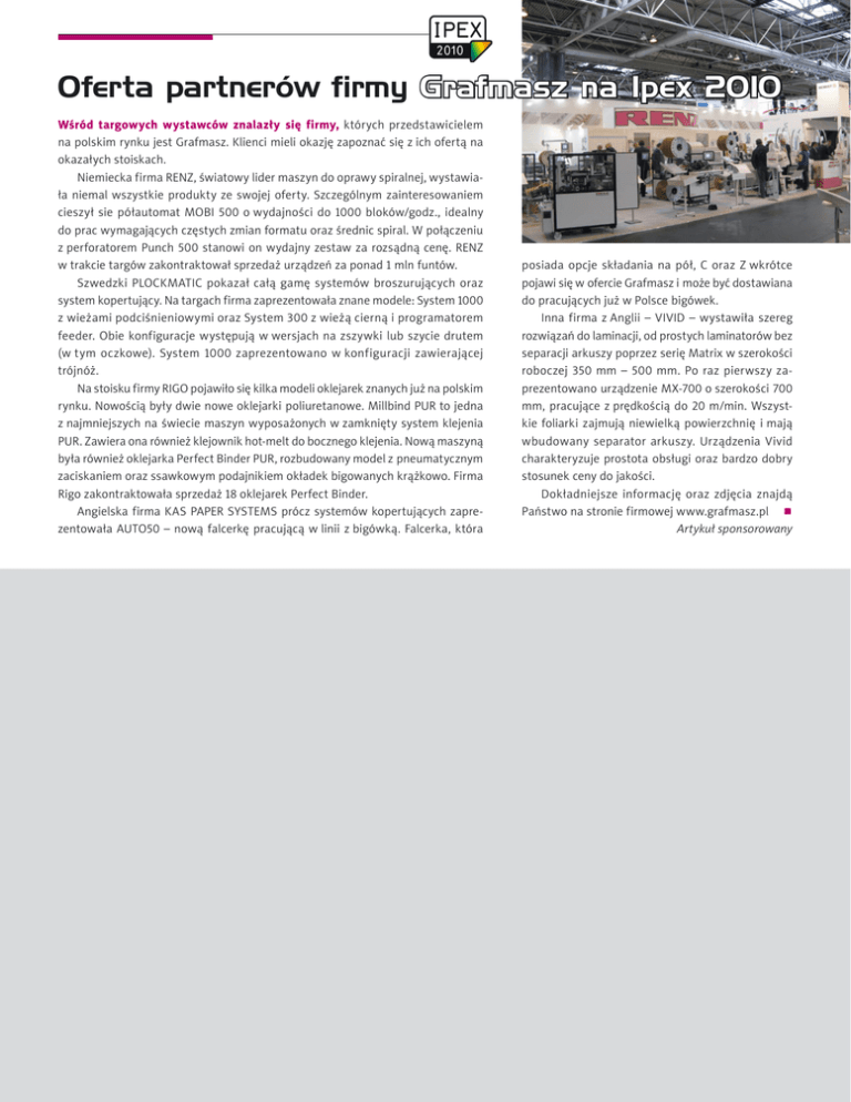 Oferta partnerów firmy Grafmasz na Ipex 2010 Wœród targowych wystawców znalaz³y siê firmy, których przedstawicielem na polskim rynku jest Grafmasz. Klienci mieli okazjê zapoznaæ siê z ich ofert¹ na okaza³ych stoiskach. Niemiecka firma RENZ, œwiatowy lider maszyn do oprawy spiralnej, wystawia³a niemal wszystkie produkty ze swojej oferty. Szczególnym zainteresowaniem cieszy³ sie pó³automat MOBI 500 o wydajnoœci do 1000 bloków/godz., idealny do prac wymagaj¹cych czêstych zmian formatu oraz œrednic spiral. W po³¹czeniu z perforatorem Punch 500 stanowi on wydajny zestaw za rozs¹dn¹ cenê. RENZ w trakcie targów zakontraktowa³ sprzeda¿ urz¹dzeñ za ponad 1 mln funtów. Szwedzki PLOCKMATIC pokaza³ ca³¹ gamê systemów broszuruj¹cych oraz system kopertuj¹cy. Na targach firma zaprezentowa³a znane modele: System 1000 z wie¿ami podciœnieniowymi oraz System 300 z wie¿¹ ciern¹ i programatorem feeder. Obie konfiguracje wystêpuj¹ w wersjach na zszywki lub szycie drutem (w tym oczkowe). System 1000 zaprezentowano w konfiguracji zawieraj¹cej trójnó¿. Na stoisku firmy RIGO pojawi³o siê kilka modeli oklejarek znanych ju¿ na polskim rynku. Nowoœci¹ by³y dwie nowe oklejarki poliuretanowe. Millbind PUR to jedna z najmniejszych na œwiecie maszyn wyposa¿onych w zamkniêty system klejenia PUR. Zawiera ona równie¿ klejownik hot-melt do bocznego klejenia. Now¹ maszyn¹ by³a równie¿ oklejarka Perfect Binder PUR, rozbudowany model z pneumatycznym zaciskaniem oraz ssawkowym podajnikiem ok³adek bigowanych kr¹¿kowo. Firma Rigo zakontraktowa³a sprzeda¿ 18 oklejarek Perfect Binder. Angielska firma KAS PAPER SYSTEMS prócz systemów kopertuj¹cych zaprezentowa³a AUTO50 – now¹ falcerkê pracuj¹c¹ w linii z bigówk¹. Falcerka, która posiada opcje sk³adania na pó³, C oraz Z wkrótce pojawi siê w ofercie Grafmasz i mo¿e byæ dostawiana do pracuj¹cych ju¿ w Polsce bigówek. Inna firma z Anglii – VIVID – wystawi³a szereg rozwi¹zañ do laminacji, od prostych laminatorów bez separacji arkuszy poprzez seriê Matrix w szerokoœci roboczej 350 mm – 500 mm. Po raz pierwszy zaprezentowano urz¹dzenie MX-700 o szerokoœci 700 mm, pracuj¹ce z prêdkoœci¹ do 20 m/min. Wszystkie foliarki zajmuj¹ niewielk¹ powierzchniê i maj¹ wbudowany separator arkuszy. Urz¹dzenia Vivid charakteryzuje prostota obs³ugi oraz bardzo dobry stosunek ceny do jakoœci. Dok³adniejsze informacjê oraz zdjêcia znajd¹ Pañstwo na stronie firmowej www.grafmasz.pl r Artyku³ sponsorowany