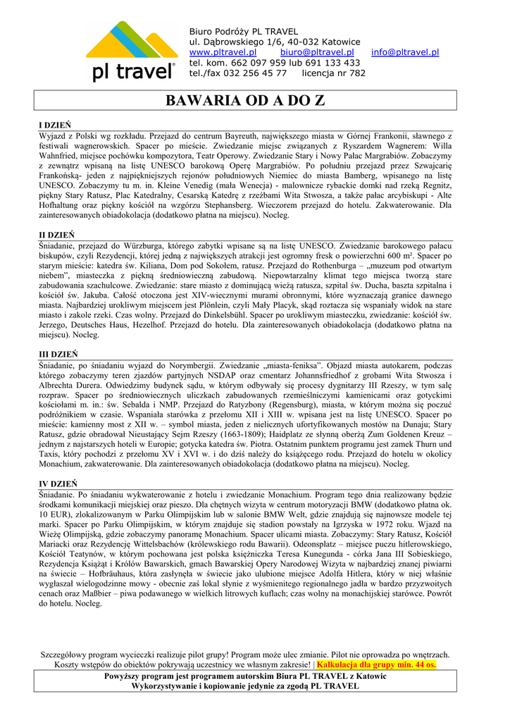 Biuro Podróży PL TRAVEL ul. Dąbrowskiego 1/6, 40-032 Katowice www.pltravel.pl [email protected] [email protected] tel. kom. 662 097 959 lub 691 133 433 tel./fax 032 256 45 77 licencja nr 782 BAWARIA OD A DO Z I DZIEŃ Wyjazd z Polski wg rozkładu. Przejazd do centrum Bayreuth, największego miasta w Górnej Frankonii, sławnego z festiwali wagnerowskich. Spacer po mieście. Zwiedzanie miejsc związanych z Ryszardem Wagnerem: Willa Wahnfried, miejsce pochówku kompozytora, Teatr Operowy. Zwiedzanie Stary i Nowy Pałac Margrabiów. Zobaczymy z zewnątrz wpisaną na listę UNESCO barokową Operę Margrabiów. Po południu przejazd przez Szwajcarię Frankońską- jeden z najpiękniejszych rejonów południowych Niemiec do miasta Bamberg, wpisanego na listę UNESCO. Zobaczymy tu m. in. Kleine Venedig (mała Wenecja) - malownicze rybackie domki nad rzeką Regnitz, piękny Stary Ratusz, Plac Katedralny, Cesarską Katedrę z rzeźbami Wita Stwosza, a także pałac arcybiskupi - Alte Hofhaltung oraz piękny kościół na wzgórzu Stephansberg. Wieczorem przejazd do hotelu. Zakwaterowanie. Dla zainteresowanych obiadokolacja (dodatkowo płatna na miejscu). Nocleg. II DZIEŃ Śniadanie, przejazd do Würzburga, którego zabytki wpisane są na listę UNESCO. Zwiedzanie barokowego pałacu biskupów, czyli Rezydencji, której jedną z największych atrakcji jest ogromny fresk o powierzchni 600 m². Spacer po starym mieście: katedra św. Kiliana, Dom pod Sokołem, ratusz. Przejazd do Rothenburga – „muzeum pod otwartym niebem”, miasteczka z piękną średniowieczną zabudową. Niepowtarzalny klimat tego miejsca tworzą stare zabudowania szachulcowe. Zwiedzanie: stare miasto z dominującą wieżą ratusza, szpital św. Ducha, baszta szpitalna i kościół św. Jakuba. Całość otoczona jest XIV-wiecznymi murami obronnymi, które wyznaczają granice dawnego miasta. Najbardziej urokliwym miejscem jest Plönlein, czyli Mały Placyk, skąd roztacza się wspaniały widok na stare miasto i zakole rzeki. Czas wolny. Przejazd do Dinkelsbühl. Spacer po urokliwym miasteczku, zwiedzanie: kościół św. Jerzego, Deutsches Haus, Hezelhof. Przejazd do hotelu. Dla zainteresowanych obiadokolacja (dodatkowo płatna na miejscu). Nocleg. III DZIEŃ Śniadanie, po śniadaniu wyjazd do Norymbergii. Zwiedzanie „miasta-feniksa”. Objazd miasta autokarem, podczas którego zobaczymy teren zjazdów partyjnych NSDAP oraz cmentarz Johannsfriedhof z grobami Wita Stwosza i Albrechta Durera. Odwiedzimy budynek sądu, w którym odbywały się procesy dygnitarzy III Rzeszy, w tym salę rozpraw. Spacer po średniowiecznych uliczkach zabudowanych rzemieślniczymi kamienicami oraz gotyckimi kościołami m. in.: św. Sebalda i NMP. Przejazd do Ratyzbony (Regensburg), miasta, w którym można się poczuć podróżnikiem w czasie. Wspaniała starówka z przełomu XII i XIII w. wpisana jest na listę UNESCO. Spacer po mieście: kamienny most z XII w. – symbol miasta, jeden z nielicznych ufortyfikowanych mostów na Dunaju; Stary Ratusz, gdzie obradował Nieustający Sejm Rzeszy (1663-1809); Haidplatz ze słynną oberżą Zum Goldenen Kreuz – jednym z najstarszych hoteli w Europie; gotycka katedra św. Piotra. Ostatnim punktem programu jest zamek Thurn und Taxis, który pochodzi z przełomu XV i XVI w. i do dziś należy do książęcego rodu. Przejazd do hotelu w okolicy Monachium, zakwaterowanie. Dla zainteresowanych obiadokolacja (dodatkowo płatna na miejscu). Nocleg. IV DZIEŃ Śniadanie. Po śniadaniu wykwaterowanie z hotelu i zwiedzanie Monachium. Program tego dnia realizowany będzie środkami komunikacji miejskiej oraz pieszo. Dla chętnych wizyta w centrum motoryzacji BMW (dodatkowo płatna ok. 10 EUR), zlokalizowanym w Parku Olimpijskim lub w salonie BMW Welt, gdzie znajdują się najnowsze modele tej marki. Spacer po Parku Olimpijskim, w którym znajduje się stadion powstały na Igrzyska w 1972 roku. Wjazd na Wieżę Olimpijską, gdzie zobaczymy panoramę Monachium. Spacer ulicami miasta. Zobaczymy: Stary Ratusz, Kościół Mariacki oraz Rezydencję Wittelsbachów (królewskiego rodu Bawarii). Odeonsplatz – miejsce puczu hitlerowskiego, Kościół Teatynów, w którym pochowana jest polska księżniczka Teresa Kunegunda - córka Jana III Sobieskiego, Rezydencja Książąt i Królów Bawarskich, gmach Bawarskiej Opery Narodowej Wizyta w najbardziej znanej piwiarni na świecie – Hofbräuhaus, która zasłynęła w świecie jako ulubione miejsce Adolfa Hitlera, który w niej właśnie wygłaszał wielogodzinne mowy - obecnie zaś lokal słynie z wyśmienitego regionalnego jadła w bardzo przyzwoitych cenach oraz Maßbier – piwa podawanego w wielkich litrowych kuflach; czas wolny na monachijskiej starówce. Powrót do hotelu. Nocleg. Szczegółowy program wycieczki realizuje pilot grupy! Program może ulec zmianie. Pilot nie oprowadza po wnętrzach. Koszty wstępów do obiektów pokrywają uczestnicy we własnym zakresie! | Kalkulacja dla grupy min. 44 os. Powyższy program jest programem autorskim Biura PL TRAVEL z Katowic Wykorzystywanie i kopiowanie jedynie za zgodą PL TRAVEL Biuro Podróży PL TRAVEL ul. Dąbrowskiego 1/6, 40-032 Katowice www.pltravel.pl [email protected] [email protected] tel. kom. 662 097 959 lub 691 133 433 tel./fax 032 256 45 77 licencja nr 782 V DZIEŃ Śniadanie. Przejazd do Wieskirche - zwiedzanie najpiękniejszego kościoła rokokowego na terenie Bawarii. Przejazd do Füssen. Zwiedzanie bajkowego zamku Neuschwanstein, który władca wzniósł inspirowany germańską mitologią i muzyką Wagnera i był inspiracją dla twórców bajkowego pałacu Walta Disneya. Monumentalna Sala Śpiewaków przeznaczona jest do przedstawień wagnerowskich. Wizytę na zamku dopełnia wspaniały widok po przekroczeniu Marienbrücke – mostu nad przepaścią z widokiem na zamek i wodospad. Następnie zwiedzanie zamku Hohenschwangau, w którym Ludwik II spędził swoje młodzieńcze lata. Przejazd do Lind