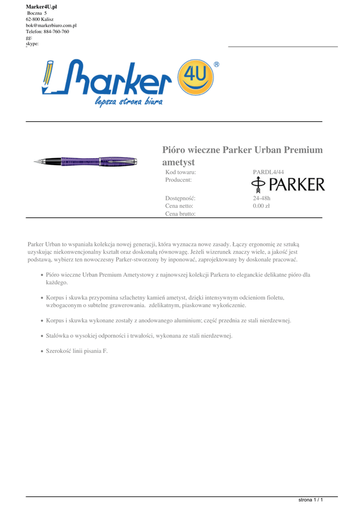 Marker4U.pl Boczna 5 62-800 Kalisz [email protected] Telefon: 884-760-760 gg: skype: Pióro wieczne Parker Urban Premium ametyst Kod towaru: Producent: PARDL4/44 Dostępność: Cena netto: Cena brutto: 24-48h 0.00 zł Parker Urban to wspaniała kolekcja nowej generacji, która wyznacza nowe zasady. Łączy ergonomię ze sztuką uzyskując niekonwencjonalny kształt oraz doskonałą równowagę. Jeżeli wizerunek znaczy wiele, a jakość jest podstawą, wybierz ten nowoczesny Parker-stworzony by inponować, zaprojektowany by doskonale pracować. Pióro wieczne Urban Premium Ametystowy z najnowszej kolekcji Parkera to eleganckie delikatne pióro dla każdego. Korpus i skuwka przypomina szlachetny kamień ametyst, dzięki intensywnym odcieniom fioletu, wzbogaconym o subtelne grawerowania. zdelikatnym, piaskowane wykończenie. Korpus i skuwka wykonane zostały z anodowanego aluminium; część przednia ze stali nierdzewnej. Stalówka o wysokiej odporności i trwałości, wykonana ze stali nierdzewnej. Szerokość linii pisania F. strona 1 / 1 Powered by TCPDF (www.tcpdf.org)