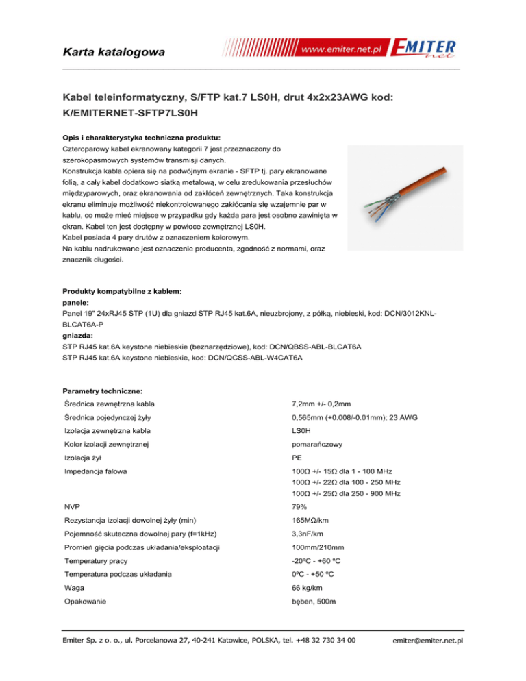 Karta katalogowa ___________________________________________________________________________ Kabel teleinformatyczny, S/FTP kat.7 LS0H, drut 4x2x23AWG kod: K/EMITERNET-SFTP7LS0H Opis i charakterystyka techniczna produktu: Czteroparowy kabel ekranowany kategorii 7 jest przeznaczony do szerokopasmowych systemów transmisji danych. Konstrukcja kabla opiera się na podwójnym ekranie - SFTP tj. pary ekranowane folią, a cały kabel dodatkowo siatką metalową, w celu zredukowania przesłuchów międzyparowych, oraz ekranowania od zakłóceń zewnętrznych. Taka konstrukcja ekranu eliminuje możliwość niekontrolowanego zakłócania się wzajemnie par w kablu, co może mieć miejsce w przypadku gdy każda para jest osobno zawinięta w ekran. Kabel ten jest dostępny w powłoce zewnętrznej LS0H. Kabel posiada 4 pary drutów z oznaczeniem kolorowym. Na kablu nadrukowane jest oznaczenie producenta, zgodność z normami, oraz znacznik długości. Produkty kompatybilne z kablem: panele: Panel 19" 24xRJ45 STP (1U) dla gniazd STP RJ45 kat.6A, nieuzbrojony, z półką, niebieski, kod: DCN/3012KNLBLCAT6A-P gniazda: STP RJ45 kat.6A keystone niebieskie (beznarzędziowe), kod: DCN/QBSS-ABL-BLCAT6A STP RJ45 kat.6A keystone niebieskie, kod: DCN/QCSS-ABL-W4CAT6A Parametry techniczne: Średnica zewnętrzna kabla 7,2mm +/- 0,2mm Średnica pojedynczej żyły 0,565mm (+0.008/-0.01mm); 23 AWG Izolacja zewnętrzna kabla LS0H Kolor izolacji zewnętrznej pomarańczowy Izolacja żył PE Impedancja falowa 100Ω +/- 15Ω dla 1 - 100 MHz 100Ω +/- 22Ω dla 100 - 250 MHz 100Ω +/- 25Ω dla 250 - 900 MHz NVP 79% Rezystancja izolacji dowolnej żyły (min) 165MΩ/km Pojemność skuteczna dowolnej pary (f=1kHz) 3,3nF/km Promień gięcia podczas układania/eksploatacji 100mm/210mm Temperatury pracy -20ºC - +60 ºC Temperatura podczas układania 0ºC - +50 ºC Waga 66 kg/km Opakowanie bęben, 500m Emiter Sp. z o. o., ul. Porcelanowa 27, 40-241 Katowice, POLSKA, tel. +48 32 730 34 00 [email protected] Karta katalogowa ___________________________________________________________________________ Częstotliwość (MHz) 10 16 62,5 100 200 300 600 Tłumienność (dB/100m) 5,4 6,8 13,7 17,4 25 31,5 46,3 Next (dB) 78 78 78 76 71 69 64 ACR (dB) 72,6 71,2 64,3 58,5 45,7 37,5 17,7 Sieć zbudowana w oparciu o kabel K/EMITERNET-SFTP7LS0H oraz odpowiednie zakończenia kategorii 6A lub 7 pozwala na implementację protokołów do 10Gb Ethernet. Gwarancja produktowa 5 lat od daty zakupu. Przeznaczony do instalacji z systemem EmiterNet serii certyfikowanej lub standard. Możliwość uzyskania 25 letniej Gwarancji Systemowej (po spełnieniu warunków określonych w Programie Gwarancji Systemu Okablowania Strukturalnego EmiterNet). Dołożyliśmy wszelkich starań, aby przedstawione informacje były rzetelne i kompletne. Jednak nie ponosimy odpowiedzialności za dokładność i kompletność danych oraz w szczególności nie możemy zagwarantować, że niniejsza specyfikacja nie zawiera błędów lub pomyłek. Informacje zawarte w niniejszej specyfikacji mogą zostać zmienione w każdej chwili bez powiadomienia. Emiter Sp. z o. o., ul. Porcelanowa 27, 40-241 Katowice, POLSKA, tel. +48 32 730 34 00 [email protected]