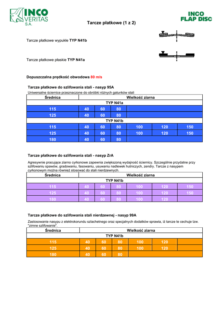 Tarcze płatkowe (1 z 2) Tarcze płatkowe wypukłe TYP N41b Tarcze płatkowe płaskie TYP N41a Dopuszczalna prędkość obwodowa 80 m/s Tarcze płatkowe do szlifowania stali - nasyp 95A Uniwersalne ściernice przeznaczone do obróbki różnych gatunków stali Średnica Wielkość ziarna TYP N41a 115 40 60 125 40 60 80 80 TYP N41b 115 40 60 80 100 120 150 125 40 60 80 100 120 150 180 40 60 80 Tarcze płatkowe do szlifowania stali - nasyp ZrA Agresywnie pracujące ziarno cyrkonowe zapewnia zwiększoną wydajność ściernicy. Szczególnie przydatne przy szlifowaniu spawów, gradowaniu, fasowaniu, usuwaniu nadlewek hutniczych, zendry. Tarcze z nasypem cyrkonowym można również stosować do stali nierdzewnych. Średnica Wielkość ziarna TYP N41b 115 40 60 80 100 120 150 125 40 60 80 100 120 150 180 40 60 80 100 120 Tarcze płatkowe do szlifowania stali nierdzewnej - nasyp 99A Zastosowanie nasypu z elektrokorundu szlachetnego oraz specjalnych dodatków sprawia, iż tarcze te cechuje tzw. "zimne szlifowanie". Średnica Wielkość ziarna TYP N41b 115 40 60 80 100 120 125 40 60 80 100 120 180 40 60 80 Tarcze płatkowe (2 z 2) Tarcze płatkowe do szlifowania kamienia i metali nieżelaznych - nasyp 98C Uniwersalne narzędzia do obróbki różnego rodzaju kamienia naturalnego i betonu, żeliw i metali nieżelaznych, a także do czyszczenia powierzchni drewnianych np. z farb i lakierów. Średnica Wielkość ziarna TYP N41b 115 40 60 80 125 40 60 80 Wszystkie rozmiary podano w milimetrach Dopuszczalne wielkości obrotów w zależności od średnicy: Średnica obr/min 115 13300 125 12200 180 8500 Informujemy również o możliwości wykonania tarcz płatkowych płaskich i wypukłych w przedziale wielkości ziarna od 40 do 150.