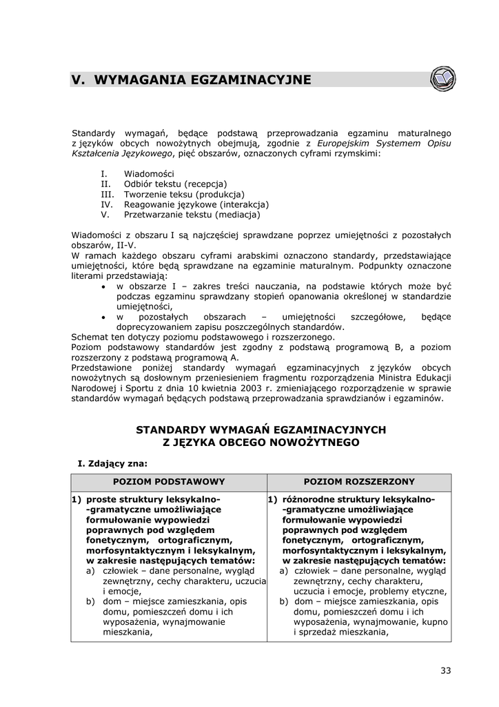 V. WYMAGANIA EGZAMINACYJNE Standardy wymagań, będące podstawą przeprowadzania egzaminu maturalnego z języków obcych nowożytnych obejmują, zgodnie z Europejskim Systemem Opisu Kształcenia Językowego, pięć obszarów, oznaczonych cyframi rzymskimi: I. II. III. IV. V. Wiadomości Odbiór tekstu (recepcja) Tworzenie teksu (produkcja) Reagowanie językowe (interakcja) Przetwarzanie tekstu (mediacja) Wiadomości z obszaru I są najczęściej sprawdzane poprzez umiejętności z pozostałych obszarów, II-V. W ramach każdego obszaru cyframi arabskimi oznaczono standardy, przedstawiające umiejętności, które będą sprawdzane na egzaminie maturalnym. Podpunkty oznaczone literami przedstawiają: • w obszarze I – zakres treści nauczania, na podstawie których może być podczas egzaminu sprawdzany stopień opanowania określonej w standardzie umiejętności, • w pozostałych obszarach – umiejętności szczegółowe, będące doprecyzowaniem zapisu poszczególnych standardów. Schemat ten dotyczy poziomu podstawowego i rozszerzonego. Poziom podstawowy standardów jest zgodny z podstawą programową B, a poziom rozszerzony z podstawą programową A. Przedstawione poniżej standardy wymagań egzaminacyjnych z języków obcych nowożytnych są dosłownym przeniesieniem fragmentu rozporządzenia Ministra Edukacji Narodowej i Sportu z dnia 10 kwietnia 2003 r. zmieniającego rozporządzenie w sprawie standardów wymagań będących podstawą przeprowadzania sprawdzianów i egzaminów. STANDARDY WYMAGAŃ EGZAMINACYJNYCH Z JĘZYKA OBCEGO NOWOŻYTNEGO I. Zdający zna: POZIOM PODSTAWOWY POZIOM ROZSZERZONY 1) proste struktury leksykalno1) różnorodne struktury leksykalno-gramatyczne umożliwiające -gramatyczne umożliwiające formułowanie wypowiedzi formułowanie wypowiedzi poprawnych pod względem poprawnych pod względem fonetycznym, ortograficznym, fonetycznym, ortograficznym, morfosyntaktycznym i leksykalnym, morfosyntaktycznym i leksykalnym, w zakresie następujących tematów: w zakresie następujących tematów: a) człowiek – dane personalne, wygląd a) człowiek – dane personalne, wygląd zewnętrzny, cechy charakteru, zewnętrzny, cechy charakteru, uczucia i emocje, uczucia i emocje, problemy etyczne, b) dom – miejsce zamieszkania, opis b) dom – miejsce zamieszkania, opis domu, pomieszczeń domu i ich domu, pomieszczeń domu i ich wyposażenia, wynajmowanie, kupno wyposażenia, wynajmowanie i sprzedaż mieszkania, mieszkania, 33 c) d) e) f) g) h) i) j) k) l) m) n) o) 34 szkoła – przedmioty nauczania, oceny i wymagania, życie szkoły, kształcenie pozaszkolne, praca – popularne zawody i związane z nimi czynności, warunki pracy i zatrudnienia, praca dorywcza, życie rodzinne i towarzyskie – okresy życia, członkowie rodziny, czynności życia codziennego, formy spędzania czasu wolnego, święta i uroczystości, styl życia, żywienie – artykuły spożywcze, przygotowanie potraw, posiłki, lokale gastronomiczne, zakupy i usługi – rodzaje sklepów, towary, sprzedawanie i kupowanie, reklama, korzystanie z usług, podróżowanie i turystyka – środki transportu, baza noclegowa, informacja turystyczna, wycieczki, zwiedzanie, wypadki i awarie, kultura – podstawowe dziedziny kultury, twórcy i ich dzieła, uczestnictwo w kulturze, sport – popularne dyscypliny sportu, podstawowy sprzęt sportowy, imprezy sportowe, zdrowie – higieniczny tryb życia, podstawowe schorzenia, ich objawy i leczenie, niepełnosprawni, uzależnienia, nauka, technika – odkrycia naukowe, wynalazki, obsługa i korzystanie z podstawowych urządzeń technicznych, świat przyrody – klimat, świat roślin i zwierząt, krajobraz, zagrożenie i ochrona środowiska naturalnego, klęski żywiołowe, państwo i społeczeństwo – struktura państwa, urzędy, organizacje międzynarodowe, konflikty wewnętrzne i międzynarodowe, przestępczość, elementy wiedzy o krajach obszaru językowego, którego język jest zdawany, c) szkoła – przedmioty nauczania, oceny i wymagania, życie szkoły, kształcenie pozaszkolne, system oświaty, d) praca – zawody i związane z nimi czynności, warunki pracy i zatrudnienia, praca dorywcza, rynek pracy, e) życie rodzinne i towarzyskie – okresy życia, członkowie rodziny, czynności życia codziennego, formy spędzania czasu wolnego, święta i uroczystości, styl życia, konflikty i problemy, f) żywienie – artykuły spożywcze, przygotowanie potraw, posiłki, lokale gastronomiczne, diety, g) zakupy i usługi – rodzaje sklepów, towary, sprzedawanie i kupowanie, reklama, reklamacja, korzystanie z usług, środki płatnicze, banki, ubezpieczenia, h) podróżowanie i turystyka – środki transportu, baza noclegowa, informacja turystyczna, wycieczki, zwiedzanie, wypadki i awarie, i) kultura – dziedziny kultury, twórcy i ich dzieła, uczestnictwo w kulturze, j) sport – dyscypliny sportu, sprzęt sportowy, imprezy sportowe, sport wyczynowy, sporty ekstremalne, k) zdrowie – higieniczny tryb życia, schorzenia, ich przyczyny, objawy i leczenie, niepełnosprawni, uzależnienia, system ochrony zdrowia, l) nauka, technika – odkrycia naukowe, wynalazki, obsługa i korzystanie z urządzeń technicznych, współczesne środki przekazu i przetwarzania informacji, m) świat przyrody – klimat, świat roślin i zwierząt, krajobraz, zagrożenie i ochrona środowiska naturalnego, klęski żywiołowe, przestrzeń kosmiczna, n) państwo i społeczeństwo – struktura państwa, urzędy, organizacje międzynarodowe, problemy i konflikty wewnętrzne i międzynarodowe, przestępczość, polityka społeczna, partie i politycy, kościoły i religie, gospodarka, o) elementy wiedzy o krajach obszaru językowego, którego język jest zdawany, 2) zasady konstruowania różnych form 2) zasady konstruowania różnych prostych wypowiedzi: form wypowiedzi: a) ustnych – formy nawiązywania a) ustnych – formy nawiązywania kontaktu z rozmówcą, przekazywa