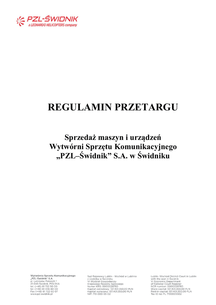 REGULAMIN PRZETARGU Sprzedaż maszyn i urządzeń Wytwórni Sprzętu Komunikacyjnego „PZL–Świdnik” S.A. w Świdniku 1. NAZWA I ADRES SPRZEDAJĄCEGO Wytwórnia Sprzętu Komunikacyjnego „PZL–Świdnik” S.A. z siedzibą w Świdniku, Al. Lotników Polskich 1, 21-045 Świdnik, Polska, zwana w treści „Sprzedającym” 2. POSTANOWIENIA OGÓLNE 2.1 Niniejszy „Regulamin przetargu”, zwany dalej „Regulaminem”, określa zasady przeprowadzania przetargu pisemnego na sprzedaż maszyn i urządzeń będących własnością Sprzedającego. Celem przetargu jest wybór nabywcy na maszyny i urządzenia, o których mowa w ust. 2.1 2.2 3. FORMA PRZETARGU Przetarg pisemny ma formę konkursu ofert. Niniejszy przetarg nie stanowi przetargu w rozumieniu przepisów ustawy Prawo zamówień publicznych (Dz. U. z 2013 r., poz. 907 ze zm.), a złożenie oferty w odpowiedzi na Ogłoszenie nie obliguje do zawarcia umowy i nie stanowi podstawy roszczeń o zawarcie umowy ani innych roszczeń związanych z udziałem w postępowaniu i przygotowaniem oferty. 4. PRZEDMIOT PRZETARGU 4.1 Przedmiotem przetargu jest sprzedaż maszyn i urządzeń wg. Załącznika nr 1 do Regulaminu pt. „Wykaz maszyn i urządzeń”, Podstawowe dane dotyczące maszyn i urządzeń będą zamieszczone w Załączniku nr 1, który będzie dołączony do ogłoszenia. Maszyny i urządzenia będące przedmiotem przetargu można będzie oglądać w miejscu i terminie wskazanym w ogłoszeniu o przetargu. Podczas wizji lokalnej brak możliwości uruchomienia i sprawdzenia maszyn i urządzeń będących przedmiotem przetargu , 4.2 4.3 4.4 5. WARUNKI I ZASADY UCZESTNICTWA W PRZETARGU 5.1 Ogłoszenie o przetargu podaje się do publicznej wiadomości poprzez zamieszczenie informacji w prasie. Ogłoszenie o przetargu wraz załącznikami zamieszcza się na stronie www.pzl.swidnik.pl W ogłoszeniu o przetargu podaje się informacje dotyczące maszyn i urządzeń (podstawowe dane), termin i miejsce wizji lokalnej, warunki przetargu ( w tym termin i sposób składania ofert). 5.2 2 5.9 W przetargu mogą brać udział osoby fizyczne prowadzące działalność gospodarczą, osoby prawne lub jednostki organizacyjne nie posiadające osobowości prawnej. Pisemne oferty powinny zawierać: - imię, nazwisko i adres lub nazwę oferenta, - telefon kontaktowy; - nazwę nabywanej pozycji, oferowaną cenę/ ceny netto i warunki zapłaty; - oświadczenie o zapoznaniu się ze stanem faktycznym nabywanej ruchomości wraz z oświadczeniem , że akceptuje jego stan w dniu sprzedaży bez zastrzeżeń; - oświadczenie, że jest świadomy iż Sprzedający nie ponosi odpowiedzialności z tytułu gwarancji lub rękojmi za wady sprzedanego towaru. Zakupiony sprzęt nie podlega reklamacji; Ofertę Oferenci składają w języku polskim lub angielskim na formularzu ofertowym stanowiącym załącznik nr 2 do Regulaminu. Oferta powinna być podpisana przez osobę lub osoby uprawnione do reprezentacji Oferenta. Oferent może złożyć tylko jedną ofertę cenową na daną pozycję. Oferty należy składać drogą e-mailową na adres [email protected] nie później niż do dnia 14 października 2016 r. do godziny 16:00 Kompletne Materiały Przetargowe będą udostępnione na stronie www.pzl.swidnik.pl 6. PRZETARG 6.1 Przewodniczący komisji przetargowej ustala liczbę otrzymanych ofert. Do przeprowadzenia przetargu konieczne jest złożenie minimum jednej oferty zakupu na dowolną pozycję, Po otrzymaniu ofert, komisja przetargowa dokonuje szczegółowej analizy ofert, a następnie odrzuca oferty nie odpowiadające warunkom przetargu, W przypadku braków formalnych, Sprzedający może wezwać oferentów do uzupełnienia w określonym przez siebie terminie takich braków (nie dotyczy ceny), Po analizie ofert Sprzedający może poprosić oferenta o uzupełnienie dodatkowych informacji i dokumentów wymienionych w pkt 9. Sprzedający informuje oferentów (w formie e-mailowej), którzy zaproponowali najlepsze warunki cenowe, W przypadku złożenia równorzędnych ofert, będą kontynuowane negocjacje pomiędzy tymi oferentami, którzy zaoferowali takie same ceny. Z przeprowadzonych negocjacji komisja przetargowa sporządzi protokół, a rozstrzygnięcie nastąpi w formie pisemnych ofert uzupełniających uwzględniających kryterium wyboru oferty o którym mowa w pkt.16. 5.3 5.4 5.5 5.6 5.7 5.8 6.2 6.3 6.4 6.5 6.6 3 6.7 6.8 6.9 6.10 6.11 6.12 6.13 Sprzedający wybiera najkorzystniejszą ofertę wybraną zgodnie z pkt. 16 Złożone oferty winny pozostać wiążące dla oferenta przez okres 60 dni od terminu złożenia określonego pkt. 5.8. Kupujący jest zobowiązany zapłacić za zakupione pozycje po otrzymaniu informacji e-mailowej o wyborze oferty, w terminie płatności 3 dni roboczych od daty otrzymania faktury , Do wystawione faktury zostanie doliczony podatek VAT. Zakupione pozycje zostaną wydane Kupującemu nie wcześniej, niż po wywiązaniu się ze wszystkich warunków złożonej oferty, a także po zapłaceniu ceny nabycia oraz okazaniu dowodu wpłaty. Kupujący zobowiązany jest do odbioru maszyn i urządzeń na własny koszt w terminie do 30 dni od daty dokonania zapłaty za wystawioną fakturę jak w 6.9 powyżej. Sprzedający ma prawo do naliczenia opłaty z tytułu przechowywania zakupionych maszyn lub urządzeń, jeśli nie zostaną odebrane przez kupującego po upływie powyższego 30-dniowego terminu, w wysokości 0,1% ceny nabycia, za każdy rozpoczęty dzień. 7. HARMONOGRAM 7.1 7.4 Ukazanie się ogłoszenia w prasie i na stronie www.pzl.swidnik.pl w dniu 26 września 2016 Wizje lokalne w dniach 06 Październik – 7 Październik 2016 przed wizytą konieczność przekazania informacji o pozycjach które Kupujący będzie oglądał. Informację taką należy przesłać na jeden dzień przed terminem wizji lokalnej na adres e-mail: [email protected] tel. 81 722 51 77, 606-828-700 w dniu wizji lokalnej okazanie dokumentu tożsamości; brak dokumentu tożsam