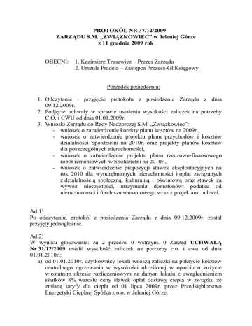 PROTOKÓŁ NR 37/12/2009 ZARZĄDU S.M. „ZWIĄZKOWIEC” w Jeleniej Górze z 11 grudnia 2009 rok OBECNI: 1. Kazimierz Trusewicz – Prezes Zarządu 2. Urszula Pradela – Zastępca Prezesa-Gł.Księgowy Porządek posiedzenia: 1. Odczytanie i przyjęcie protokołu z posiedzenia Zarządu z dnia 09.12.2009r. 2. Podjęcie uchwały w sprawie ustalenia wysokości zaliczek na potrzeby C.O. i CWU od dnia 01.01.2009r. 3. Wnioski Zarządu do Rady Nadzorczej S.M. „Związkowiec”: - wniosek o zatwierdzenie korekty planu kosztów na 2009r., - wniosek o zatwierdzenie projektu planu przychodów i kosztów działalności Spółdzielni na 2010r. oraz projekty planów kosztów dla poszczególnych nieruchomości, - wniosek o zatwierdzenie projektu planu rzeczowo-finansowego robót remontowych w Spółdzielni na 2010r., - wniosek o zatwierdzenie propozycji stawek eksploatacyjnych na rok 2010 dla wyodrębnionych nieruchomości i opłat związanych z działalnością społeczną, kulturalną i oświatową oraz stawek za wywóz nieczystości, utrzymania domofonów, podatku od nieruchomości i funduszu remontowego wraz z projektami uchwał. Ad.1) Po odczytaniu, protokół z posiedzenia Zarządu z dnia 09.12.2009r. został przyjęty jednogłośnie. Ad.2) W wyniku głosowania: za 2 przeciw 0 wstrzym. 0 Zarząd UCHWAŁĄ Nr 31/12/2009 ustalił wysokość zaliczek na potrzeby c.o. i cwu od dnia 01.01.2010r.: a) od 01.01.2010r. użytkownicy lokali wnoszą zaliczki na pokrycie kosztów centralnego ogrzewania w wysokości określonej w oparciu o zużycie w ostatnim okresie rozliczeniowym na danym lokalu z uwzględnieniem skutków 8% wzrostu ceny stawek opłat dostawy ciepła w związku ze zmianą taryfy dla ciepła od 01 lipca 2009r. przez Przedsiębiorstwo Energetyki Cieplnej Spółka z o.o. w Jeleniej Górze. b) Od 01.01.2010r. użytkownicy lokali wnoszą zaliczki na pokrycie kosztów związanych z dostawą ciepła dla potrzeb podgrzania wody w wysokości wynikającej z iloczynem zużycia wody (m3) przez mieszkańców danego lokalu w oparciu o zużycie wody w ostatnim okresie rozliczeniowym i średniego kosztu ciepłej wody w danym węźle ciepłowniczym z uwzględnieniem skutków 8% wzrostu ceny i stawek opłat dostawy ciepła w związku ze zmianą taryf dla ciepła od 01 lipca 2008r. przez Przedsiębiorstwo Energetyki Cieplnej Spółka z o.o. w Jeleniej Górze, tj. dla poszczególnych budynków: I WĘZEŁ Kiepury 49, 51 i 53 – 19,59zł/m3 cw, II WĘZEŁ Kiepury 55, 57, 59 i Sygietyńskiego 15 – 17,816zł/m3 cw, III WĘZEŁ Kiepury 61, 63, 65 i Sygietyńskiego 17 - 19,14zł/m3 cw, IV WĘZEŁ Kiepury 45A, 45B, 47 i 47A - 19,06zł/m3 cw. Użytkownicy lokali, w których wystąpiło zerowe zużycie ciepłej wody, umowne zaliczki w wysokości rozliczonych kosztów stałych podgrzania wody z uwzględnieniem skutków 8% wzrostu ceny i stawek opłat dostawy ciepła w związku ze zmianą taryfy dla ciepła od 01 lipca 2009r. przez Przedsiębiorstwo Energetyki cieplnej Spółka z o.o. w Jeleniej Górze dla poszczególnych budynków: I WĘZEŁ Kiepury 49, 51 i 53 – 14,98zł za miesiąc, II WĘZEŁ Kiepury 55, 57, 59 i Sygietyńskiego 15 – 12,61zł za miesiąc, III WĘZEŁ Kiepury 61, 63, 65 i Sygietyńskiego 17 - 14,79zł za miesiąc, IV WĘZEŁ Kiepury 45A, 45B, 47 i 47A - 12,89zł za miesiąc. Ad.3) Zarząd przygotował następujące wnioski skierowane do Rady Nadzorczej: - wniosek o zatwierdzenie korekty planu kosztów na 2009r., - wniosek o zatwierdzenie projektu planu przychodów i kosztów działalności Spółdzielni na 2010r. oraz projekty planów kosztów dla poszczególnych nieruchomości, - wniosek o zatwierdzenie projektu planu rzeczowo-finansowego robót remontowych w Spółdzielni na 2010r., - wniosek o zatwierdzenie propozycji stawek eksploatacyjnych na rok 2010 dla wyodrębnionych nieruchomości i opłat związanych z działalnością społeczną, kulturalną i oświatową oraz stawek za wywóz nieczystości, utrzymania domofonów, podatku od nieruchomości i funduszu remontowego wraz z projektami uchwał. Powyższe wnioski wraz ze stosownymi materiałami będą przedstawione na posiedzeniu Rady Nadzorczej w dniu 17.12.2009r. Zarząd