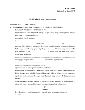 Wzór umowy Załącznik nr 2 do SIWZ UMOWA kredytowa Nr ..................... Zawarta w dniu........ 2009 r. między : 1. Gminą Dobrcz z siedzibą w Dobrczu przy ul. Długiej 50, 86-022 Dobrcz Nr REGON 092350659; NIP 554-26-79-775. reprezentowaną przez Krzysztofa Szalę – Wójta Gminy przy kontrasygnacie Jadwigi Rogozińskiej – Skarbnika Gminy zwaną dalej Kredytobiorcą a ............................................... z siedzibą w ........................................ ul. ......................., zwanym dalej Bankiem, wpisanym do rejestru przedsiębiorców Krajowego Rejestru Sądowego, prowadzonego przez Sąd Rejonowy .......... Wydział Gospodarczy KRS pod numerem KRS .....................................,/ działającym na podstawie statutu, z Zarządem w składzie : ........................................................................................................................................... działającym na podstawie ........................., reprezentowanym przez : ..................................................................... ..................................................................... uprawnionymi do łącznego reprezentowania Banku. Uprawnienie do reprezentacji potwierdza wypis aktualny z rejestru przedsiębiorców KRS, wydany przez oddział Centralnej Informacji KRS w dniu ................ a stan ten, zgodnie z oświadczeniem złoŜonym przez Bank nie uległ zmianie do dnia podpisania umowy. Niniejsza umowa została zawarta na podstawie oferty, wybranej w postępowaniu o udzielenie zamówienia publicznego w trybie przetargu nieograniczonego. §1. Definicje Do celów umowy poniŜsze zwroty i wyraŜenia mają następujące znaczenie: 1. Bank - .................................. 2. Dzień roboczy – dzień inny niŜ sobota lub niedziela lub inny dzień ustawowo wolny od pracy, w którym Bank oraz Kredytobiorca prowadzą normalną działalność. 3. WIBOR – Warsaw Inter Bank Offered Rate – średnia stopa procentowa podawana poprzez serwis REUTERS, ustalona zgodnie z „Regulaminem fixingu stawek referencyjnych WIBOR i WIBID”. 4. Trzymiesięczny Okres Rozliczeniowy: trwający trzy miesiące kalendarzowe okres rozpoczynający się w pierwszym dniu odpowiednio : stycznia, kwietnia, lipca, października kaŜdego roku. 5. Umowa – niniejsza umowa kredytowa. 6. Uruchomiony kredyt – środki finansowe przekazane przez Bank na rachunek bankowy Kredytobiorcy w cięŜar kredytu. 7. Uruchamianie Kredytu – przekazywanie poszczególnych transz Kredytu na rachunek bankowy Kredytobiorcy. §2 Kwota Kredytu i jego przeznaczenie 1. Bank udziela Kredytobiorcy kredytu w wysokości 1.200.000,00 PLN słownie : jeden milion dwieście tysięcy PLN). 2. Kredyt zostaje udzielony z przeznaczeniem na realizację inwestycji gminnej pn. „Przebudowa drogi gminnej nr 050207C na odcinku Nekla-Linówiec-PaulinyDobrcz”. 3. Kredyt zostanie postawiony do dyspozycji Kredytobiorcy po ustanowieniu zabezpieczenia spłaty kredytu, o którym mowa w § 9. 4. Kredyt uruchamiany będzie w transzach w formie bezgotówkowej z zastrzeŜeniem ust. 5 oraz § 4 ust. 1. 5. W przypadku zmiany numeru rachunku lub banku prowadzącego ten rachunek, Kredytobiorca poinformuje Bank o zmianie, niezwłocznie po jej dokonaniu. Od dnia otrzymania informacji o zmianie numeru rachunku lub banku prowadzącego ten rachunek, Kredyt będzie przekazywany na nowy rachunek. §3 Rola Banku 1. W stosunkach z tytułu Umowy: 1) Bank będzie uruchamiał Kredyt. 2) Spłata Kredytu oraz Odsetek będzie dokonywana przez Kredytobiorcę jedynie na rachunek Banku wskazany w Umowie lub skorygowany przez Bank w drodze wymiany korespondencji. 3) Wszystkie zobowiązania Kredytobiorcy wynikające z Umowy będą uznawane jako prawidłowo wykonane wówczas, gdy zostaną one dokonane przez Kredytobiorcę wobec Banku, 4) Wszelka korespondencja z Kredytobiorcą związana z Umową będzie prowadzona przez Bank. §4 Uruchomienie Kredytu 1. Kredyt będzie uruchamiany transzami na podstawie pisemnej dyspozycji Kredytobiorcy w terminach i w kwotach określonych kaŜdorazowo przez Kredytobiorcę. 2. Termin uruchomienia danej transzy Kredytu nie moŜe być dłuŜszy niŜ 4 dni robocze od dnia otrzymania przez BANK zawiadomienia, o którym mowa w pkt 1. 3. Za datę uruchomienia transzy Kredytu uznaje się datę uznania rachunku bankowego Kredytobiorcy. 4. Po uruchomieniu kaŜdej transzy Kredytu Bank w terminie 3 dni roboczych potwierdzi pisemnie Kredytobiorcy datę i kwotę tej transzy Kredytu. 5. Uruchomienie kolejnej transzy Kredytu nie wymaga uprzedniego wydatkowania przez Kredytobiorcę środków pochodzących z poprzednio uruchomionych transz. 6. Kredytobiorca moŜe Ŝądać uruchomienia Kredytu do dnia .................................. . Nie zgłoszenie powyŜszego Ŝądania w terminie jest równoznaczne z rezygnacją przez Kredytobiorcę z części nie uruchomionego kredytu. 7. Rezygnacja z części Kredytu, o której mowa w ust. 6 nie będzie rodziła po stronie Kredytobiorcy Ŝadnych zobowiązań finansowych, w szczególności nie będzie on zobowiązany do uiszczenia Ŝadnej opłaty lub prowizji. §5 Oprocentowanie 1. Odsetki od Kredytu będą naliczane w Trzymiesięcznych Okresach Rozliczeniowych od faktycznie uruchomionej i niespłaconej kwoty Kredytu, według zmiennej stopy procentowej stanowiącej sumę : 1) średniej arytmetycznej trzymiesięcznych z dziennych ostatnich stóp pięciu dni WIBOR dla roboczych depozytów poprzedniego Trzymiesięcznego Okresu Rozliczeniowego odsetkowego, z dokładnością do dwóch miejsc po przecinku. 2) stałej marŜy w wysokości ....................... punktów bazowych (słownie : ............................................... punktów bazowych ............................... setnych) w skali roku. 2. Odsetki od Kredytu stają się wymagalne w ostatnim dniu kaŜdego miesiąca roku. JeŜeli termin wymagalności odsetek przypada na dzień nie będący dniem roboczym, wówczas te
