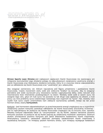 Driven Sports Lean Xtreme jest najlepszym spalaczem tkanki tłuszczowej nie zawierający ani miligrama stymulantów! Jego działanie polega na zdecydowanym zwiększeniu uwalniania energii z tkanki tłuszczowej oraz blokowaniu działania kortyzolu, który to w znacznej mierze odpowiedzialny jest za odkładanie się tkanki tłuszczowej oraz "uwalniania" jej z adipocytów. Aby osiągnąć zamierzony cel, którym najczęściej jest figura umięśniona i pozbawiona tkanki tłuszczowej. Często marzeniem wielu osób jest widoczna "kratka" na brzuchu. Aby to osiągnąć potrzebne jest wiele wyrzeczeń przy stosowaniu bardzo rygorystycznej diety, wielu ćwiczeń oraz niezmierzone ilości kilometrów przebiegniętych na bieżni. Niestety wiele osób w swoim życiu nie osiagnie tego celu, gdyż ich tryb życia nie pozwala na tak długo czas spędzony na siłowni, a tryb pracy czy inne problemy życia codziennego nastawiają nasz organizm na "tycie". Tak, niestety nasz szybki tryb życia często uniemożliwia nam zdobycie wymarzonej sylwetki. Dzieje się tak przez hormon stresu zwany kortyzolem. Kortyzol - jest hormonem odpowiedzialnym za przechowywanie energii znajdujacej się w organiźmie. Zwiększony poziom kortyzolu powoduje odkładanie się tkanki tłuszczowej wisceralnej (trzewnej) jest to najtrudniejsza do pozbycia się tkanka tłuszczowa znajdująca się na brzuchu (tzw. oponka). Niestety kortyzol odpowiada także za "utrzymywanie" się tej tkanki, dopiero obniżenie poziomu kortyzolu pozwala na pozbycie się tej tkanki poprzej jej zwiększoną możliwość uwalniania. Istotnym atutem zmniejszenia poziomu kortyzolu jest także blokowanie katabolizmu tkanki mięśniowej. Amerykańscy naukowcy udowodnili zależność pomiędzy katabolizmem tkanki mięśniowej a wysokością kortyzolu - im mniejszy poziom hormonu stresu, tym mniejszy występuje katabolizm Strona 1 z 5 tkanki mięśniowej. Lean Xtreme działa na hormon - kortyzol - poprzez jego stałe zmniejszenie, zwłaszcza w sytuacjach zwiększonego stresu (takiego jak treningi). Jak już wcześniej zostało wytłumaczone, blokowanie hormonu stresu (kortyzolu) powoduje istotne zwiększenie uwalniania tkanki tłuszczowej trzewnej oraz zmniejszony katabolizm tkanki mięśniowej. Prócz blokowania hormonu stresu, DS Lean Xtreme zwiększa ilość uwalnianej energii z tkanki tłuszczowej (z adipocytów) a także optymalizuje działanie układu immunologicznego, aby stworzyć idealne środowisko do spalania tłuszczu przy jednoczesnej ochronie mięśni. Stosowanie DS Lean Xtreme powoduje także zwiększoną gęstość tkanki kostnej, zmniejsza apetyt, usprawnia system odpornościowy, polepsza działanie naszego mózgu (wspiera pamięć oraz zdolność szybkiego myślenia). Lean Xtreme wspiera te wszystkie funkcje, gdyż blokuje kortyzol - hormon oddziałujący na nie w negatywny sposób. Dowód tego macie wokół siebie. Na pewno znacie wiele osób, które poprzez stres podupadły na zdrowiu, kondycji fizycznej oraz psychicznej. To właśnie stres, a co za tym idzie wysoki poziom kortyzolu wpłynął na ten stan! Strona 2 z 5 Strona 3 z 5 Lean Xtreme uwzględnia 7-OH fosfatydylserynę oraz 5-AT, aby kontrolować poziom kortyzolu, stymulować funkcje tarczycy oraz obniżać poziom stresu poprzez wpływ na cytokiny odpowiedzialne za sygnalizację reakcji zapalnych i kortyzolu. Lean Xtreme zawiera także Forskolin, który wpływa na kompozycję ciała i optymalne poziomy testosteronu. Dodatkowo w Lean Xtreme uwzględniono ekstrakt z zielonej herbaty o wysokim potencjale (EGCG), który posiada szereg pozytywnych właściwości, w tym stymulacji układu immunologicznego, spalania tłuszczu i zapobiegania Strona 4 z 5 gromadzeniu tłuszczu. Dzięki użyciu DSLean technologii Xtreme uwalniania, stabilne uwalnianie składników, czego efektem jest stała kontrola poziomu kortyzolu oraz ciągłe spalanie tłuszczu. W skład Driven Sports Lean Xtreme wchodzą składniki: 5-AT, 7-OH - to opatentowane substancje, które przede wszystkim pomagają w redukcji skutków działania kortyzolu. Dzięki tym właściwościom pomagają w redukcji tkanki tłuszczowej i działają antykatabolicznie. Działają też antyoksydacyjnie i zwiększają odporność organizmu. Pokrzywa Forskohli - forskolina zawarta w korzeniu tej pokrzywy swoim działaniem naśladuje adrenalinę - podnosi poziom cAMP, który to aktywuje lipazę HSL („rozbicie” zalegającego tłuszczu na wolne kwasy tłuszczowe i uwolnienie ich do krwii). Jednak w przeciwieństwie do adrenaliny nie pobudza centralnego układu nerwowego a tym samym pozwala uniknąć skutków ubocznych takich jak podenerwowanie czy drgawki. Ekstrakt Zielonej Herbaty - eliminują wolne rodniki, zapobiegają nowotworom, zawierają Katecholaminę EGCG, która hamuje procesy dezaktywacji i usuwania z organizmu Adrenaliny. Dzięki temu działa synergistycznie zarówno z naturalną Adrenaliną jak i związkami naśladującymi jej działanie. Fosfatydylseryna - odżywia i wpływa na funkcje mózgu, reguluje prace układu nerwowego. Redukcja tłuszczu 4 Ochrona mięśni 3 Uwalnianie energii 3 Pobudzenie 0 Wytrzymałość 0 Smak 4 Strona 5 z 5