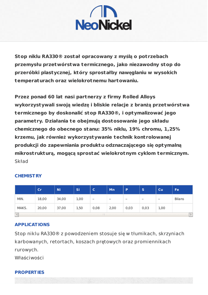 St op niklu RA330® zost ał opracowany z myślą o pot rzebach przemysłu przet wórst wa t ermicznego, jako niezawodny st op do przeróbki plast ycznej, kt óry sprost ałby nawęglaniu w wysokich t emperat urach oraz wielokrot nemu hart owaniu. Przez ponad 60 lat nasi part nerzy z firmy Rolled Alloys wykorzyst ywali swoją wiedzę i bliskie relacje z branżą przet wórst wa t ermicznego by doskonalić st op RA330®, i opt ymalizować jego paramet ry. Działania t e obejmują dost osowanie jego składu chemicznego do obecnego st anu: 35% niklu, 19% chromu, 1,25% krzemu, jak również wykorzyst ywanie t echnik kont rolowanej produkcji do zapewniania produkt u odznaczającego się opt ymalną mikrost rukt urą, mogącą sprost ać wielokrot nym cyklom t ermicznym. Skład CHEMIST RY Cr Ni Si C Mn P S Cu Fe MIN. 18,00 34,00 1,00 – – – – – Bilans MAKS. 20,00 37,00 1,50 0,08 2,00 0,03 0,03 1,00 APPLICAT IONS Stop niklu RA330® z powodzeniem stosuje się w tłumikach, skrzyniach karbowanych, retortach, koszach prętowych oraz promiennikach rurowych. Właściwości PROPERT IES Odporność na utlenianie do 1148°C (2100°F) Odporność na nawęglanie i azotowanie Odporność na szok termiczny Dobra wytrzymałość w podwyższonych temperaturach Stabilność metalurgiczna CARBURISAT ION Odporność na nawęglanie jest zasadniczym aspektem przy wyborze stopu do przemysłowych zastosowań grzewczych. Zawartość 35% niklu w stopie RA330® od dłuższego czasu jest uważana za optymalną dla właściwości mechanicznych oraz odporności na nawęglanie. Krzem, którego znamionowa zawartość wynosi 1,25%, jest uważany za istotny składnik zapewniający odporność na nawęglanie. Na parametry w zakresie nawęglania wpływają też naprężenia mechaniczne i termiczne, niszczące ochronną zgorzelinę. Względną odporność na nawęglanie stopów komercyjnych najrzetelniej można sprawdzić, wystawiając materiały na działanie rzeczywistych warunków pracy. PHYSICAL PROPERT IES (English) RA330 Met ric Conversion Physical Propert ies Density g/cm3 7.94416 Melt ing Range Temperat ure Coeff of Thermal Expansion Thermal Conductivity °C °C °C °C °C °C 21(70F) 538(1000F) 649(1200F) 760(1400F) 871(1600F) 982(1800F) mm/m°C x 10-6 mm/m°C x 10-6 mm/m°C x 10-6 mm/m°C x 10-6 mm/m°C x 10-6 mm/m°C x 10-6 17.46 17.64 18 kcal/(hr.m.°C) kcal/(hr.m.°C) kcal/(hr.m.°C) kcal/(hr.m.°C) kcal/(hr.m.°C) kcal/(hr.m.°C) 10.71 W/m.k W/m.k W/m.k 12.46 Modulus of Elasticity Dynamic MPa MPa MPa 196,501 20.39 21.13 21.87 W/m.k W/m.k W/m.k 23.71 24.58 25.45 MPa MPa MPa 144,790 134,448 124,106 MECHANICAL PROPERT IES (English) Mechanical Propert ies Represent at ive Tensile Propert ies Temperature °C °C °C °C °C 21(70F) 538(1000F) 593(1100F) 649(1200F) 704(1300F) MPa MPa MPa MPa MPa 586.1 489.5 457.8 390.9 305.4 MPa MPa MPa MPa MPa 268.9 172.4 166.9 151.7 144.8 % % % % % 47 46 46 43 69 °C °C °C °C °C 21(70F) 538(1000F) 593(1100F) 649(1200F) 704(1300F) Minimum creep 0.0001%/hr MPa MPa MPa MPa MPa 10,000 hour rupture strength MPa MPa MPa MPa MPa Ultimate Tensile Strength 0.2% Yield Strength Elongation Typical Creep Rupture Properties Temperature PROFIL WŁAŚCIWOŚCI Opatentowany stop niklu RA 330 zmieniał się przez lata pod względem składu. Zapewnia to lepsze właściwości w przypadku użytkowania w przemyśle przetwórstwa termicznego. Ten stop niklu początkowo został opracowany jako niezawodny materiał na potrzeby sektora przetwórstwa termicznego, wykorzystując wrodzoną odporność na wysokie temperatury, które towarzyszą nawęglaniu, jak również na naprężenia związane z częstym hartowaniem. Zmiany, które nastąpiły w składzie RA330 w ciągu ostatnich sześćdziesięciu lat, pozwoliły otrzymać obecny optymalny skład, obejmujący 35% niklu, 19% chromu i 1,25% krzemu. Te wszystkie połączone składniki tworzą stop niklu o wzmocnionej strukturze zapewniającej odporność na procesy termiczne. (Inne składniki obejmują 43% żelaza, 19% chromu, 1,5% magnezu oraz 0,05% węgla). Obecna struktura RA330 zapewnia mu metalurgiczną stabilność i odporność na utlenianie do 1148°C (2100°F), jak również na nawęglanie, azotowanie oraz szok termiczny. Jego zastosowania są różnorodne – stop niklu jest używany w przeróżnych zastosowaniach, takich jak wieszaki rurowe do podgrzewaczy ropy naftowej, kotły parowe, wentylatory piecowe i wały, przenośniki, płyty do prasowania na gorąco, tłumiki i retorty, promienniki rurowe, kosze prętowe, skrzynie karbowane i wiele innych. W sektorze obróbki cieplnej materiały wysokiej jakości mają zasadnicze znaczenie, ponieważ typowe stopy często nie sprawdzają się i rozczarowują. Jedynym wysokiej jakości stopem, który może sprostać bardzo wysokim temperaturom i innym obciążeniom, jednocześnie zapewniając ogólną odporność na korozję, jest RA330. Podczas nawęglania czynniki wytrzymałościowe odgrywają kluczową rolę w zakresie wyboru stopu do różnych zastosowań, a stop RA330 ma odpowiednią zawartość niklu, co zapewnia wymaganą odporność. W tym procesie istotne znaczenie ma również niewielka ilość zawartego w RA330 krzemu. Stop RA330 jest spawany przy użyciu materiałów dodatkowych, które są odpowiednio dobrane do jego składu, szczególnie RA330-04, który jest dostępny w nieosłoniętych drutach do spawania – prostych lub szpulowanych. W celu uzyskania najlepszych rezultatów, zalecane jest niestosowanie podgrzewania wstępnego oraz utrzymanie temperatury na niskim poziomie. Zalecane jest również stosowanie wzmocnionych spawów obrysowych. W trakcie obróbki stop RA330 hartuje się szybko – tempo hartowania odpowiada mniej więcej stali nierdzewnej 305, ponadto w przypadku cięcia wymagana jest dodatkowa moc, która musi być wyższa niż w przypadku typowe stali węglowej. Stop RA330 jest doskonałym rozwiązaniem technicznym i świetnie sprawdza się tam, gdzie inne stale nier