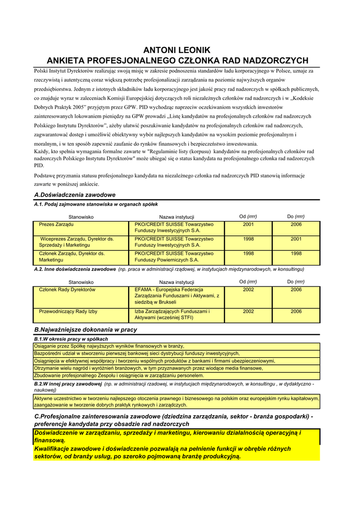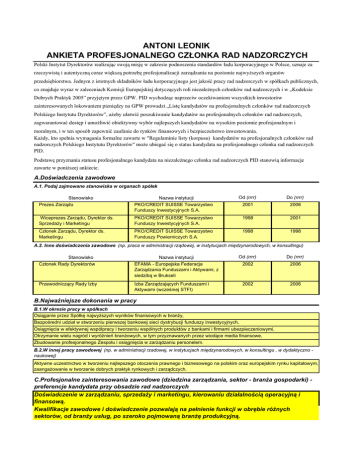 ANTONI LEONIK ANKIETA PROFESJONALNEGO CZŁONKA RAD NADZORCZYCH Polski Instytut Dyrektorów realizując swoją misję w zakresie podnoszenia standardów ładu korporacyjnego w Polsce, uznaje za rzeczywistą i autentyczną coraz większą potrzebę profesjonalizacji zarządzania na poziomie najwyŜszych organów przedsiębiorstwa. Jednym z istotnych składników ładu korporacyjnego jest jakość pracy rad nadzorczych w spółkach publicznych, co znajduje wyraz w zaleceniach Komisji Europejskiej dotyczących roli niezaleŜnych członków rad nadzorczych i w „Kodeksie Dobrych Praktyk 2005” przyjętym przez GPW. PID wychodząc naprzeciw oczekiwaniom wszystkich inwestorów zainteresowanych lokowaniem pieniędzy na GPW prowadzi „Listę kandydatów na profesjonalnych członków rad nadzorczych Polskiego Instytutu Dyrektorów”, aŜeby ułatwić poszukiwanie kandydatów na profesjonalnych członków rad nadzorczych, zagwarantować dostęp i umoŜliwić obiektywny wybór najlepszych kandydatów na wysokim poziomie profesjonalnym i moralnym, i w ten sposób zapewnić zaufanie do rynków finansowych i bezpieczeństwo inwestowania. KaŜdy, kto spełnia wymagania formalne zawarte w "Regulaminie listy (korpusu) kandydatów na profesjonalnych członków rad nadzorczych Polskiego Instytutu Dyrektorów" moŜe ubiegać się o status kandydata na profesjonalnego członka rad nadzorczych PID. Podstawę przyznania statusu profesjonalnego kandydata na niezaleŜnego członka rad nadzorczych PID stanowią informacje zawarte w poniŜszej ankiecie. A.Doświadczenia zawodowe A.1. Podaj zajmowane stanowiska w organach spółek Stanowisko Prezes Zarządu Nazwa instytucji PKO/CREDIT SUISSE Towarzystwo Funduszy Inwestycyjnych S.A. Od (rrrr) Do (rrrr) 2001 2006 Wiceprezes Zarządu, Dyrektor ds. SprzedaŜy i Marketingu PKO/CREDIT SUISSE Towarzystwo Funduszy Inwestycyjnych S.A. 1998 2001 Członek Zarządu, Dyrektor ds. Marketingu PKO/CREDIT SUISSE Towarzystwo Funduszy Powierniczych S.A. 1998 1998 A.2. Inne doświadczenia zawodowe (np. praca w administracji rządowej, w instytucjach międzynarodowych, w konsultingu) Stanowisko Członek Rady Dyrektorów Nazwa instytucji EFAMA - Europejska Federacja Zarządzania Funduszami i Aktywami, z siedzibą w Brukseli Przewodniczący Rady Izby Izba Zarządzających Funduszami i Aktywami (wcześniej STFI) Od (rrrr) Do (rrrr) 2002 2006 2002 2006 B.NajwaŜniejsze dokonania w pracy B.1.W okresie pracy w spółkach Osiąganie przez Spółkę najwyŜszych wyników finansowych w branŜy, Bazpośredni udział w stworzeniu pierwszej bankowej sieci dystrybucji funduszy inwestycyjnych, Osiągnięcia w efektywnej współpracy i tworzeniu wspólnych produktów z bankami i firmami ubezpieczeniowymi, Otrzymanie wielu nagród i wyróŜnień branŜowych, w tym przyznawanych przez wiodące media finansowe, Zbudowanie profesjonalnego Zespołu i osiągnięcia w zarządzaniu personelem. B.2.W innej pracy zawodowej (np. w administracji rzadowej, w instytucjach międzynarodowych, w konsultingu , w dydaktyczno naukowej) Aktywne uczestnictwo w tworzeniu najlepszego otoczenia prawnego i biznesowego na polskim oraz europejskim rynku kapitałowym, zaangaŜowanie w tworzenie dobrych praktyk rynkowych i zarządczych. C.Profesjonalne zainteresowania zawodowe (dziedzina zarządzania, sektor - branŜa gospodarki) preferencje kandydata przy obsadzie rad nadzorczych Doświadczenie w zarządzaniu, sprzedaŜy i marketingu, kierowaniu działalnością operacyjną i finansową. Kwalifikacje zawodowe i doświadczenie pozwalają na pełnienie funkcji w obrębie róŜnych sektorów, od branŜy usług, po szeroko pojmowaną branŜę produkcyjną. D.Wykształcenie D.1.Wykształcenie formalne Tytuł naukowy Rok ukończenia (rrrr) Magister Nazwa szkoły wyŜszej University of Newcastle, Wielka Brytania Nazwa wydziału (kierunku) Handel Międzynarodowy InŜynier ekonomiki SGGW w Warszawie Wydział Ekonomiczny 1993 Magister, InŜynier SGGW w Warszawie Wydział Techniczny, Mechanika Maszyn i Pojazdów 1990 1994 D.2.Inne uprawnienia zawodowe (np. radca prawny, rzeczoznawca majatkowy, biegły rewident, makler gieldowy itp.) Rok ukończenia (rrrr) Tytuł / nazwa Dyplom zdania Egzaminu dla kandydatów na członków Rad Nadzorczych w spółkach Skarbu Państwa. 2006 CHARTERED MARKETER, nadawany przez międzynarodowy The Chartered Institute of Marketing z siedzibą w Wielkiej Brytanii. 2002 D.3.Studia podyplomowe i specjalistyczne Nazwa Postgraduate Diploma in Marketing Nazwa szkoły / kursu Chartered Institute of Marketing, Wielka Brytania Rok ukończenia (rrrr) 2000 D.4.Odbyte szkolenia w dziedzinie prawa gospodarczego, finansów, rachunkowości i Corporate Governance Rok ukończenia (rrrr) Nazwa szkoły / kursu Nazwa Kurs dla kandydatów na członków Rad Nadzorczych Instytut Rozwoju Biznesu 2005 D.5.Odbyte nieobligatoryjne szkolenia zalecane przez PID (rodz.V. "Regulaminu.." Nazwa Kurs dla kandydatów na członków Rad Nadzorczych Nazwa szkoły / kursu Instytut Rozwoju Biznesu Rok ukończenia (rrrr) 2005 D.6.Znajomość języków obcych Język Certyfikaty Stopień znajomości w skali od 1 do 5 Angielski 5 Rosyjski 4 Dyplom ukończenia 2 kierunków studiów wyŜszych w Wielkiej Brytanii, wcześniej E.Dane personalne Nazwisko Leonik Nazwisko rodowe Aktualne miejsce pracy Nazwa zakładu TFI Allianz Polska pracy S.A. Zajmowane Dyrektor stanowisko Departamentu SprzedaŜy Kod pocztowy Gmina 02-685 Imię Antoni Imię(2) Data urodzenia (rrrr-mm-dd) 1965-03-09 Miejsce urodzenia Mrągowo Od kiedy (rrrr-mm-dd) 2006-10-01 Miejscowość Warszawa Województwo mazowieckie Ulica Rodziny Hiszpańskich Nr domu 1 F.Oświadczenie i zobowiązania 1 . Polski Instytut Dyrektorów oświadcza, Ŝe nie ponosi odpowiedzialnosci za jakiekolwiek straty i szkody powstałe na skutek przesyłania danych objetych ankietą drogą elektroniczna. Przesyłanie danych drogą elektroniczna odbywa się na wyłączne ryzyko i odpowiedzialność przesyłającego ankiet