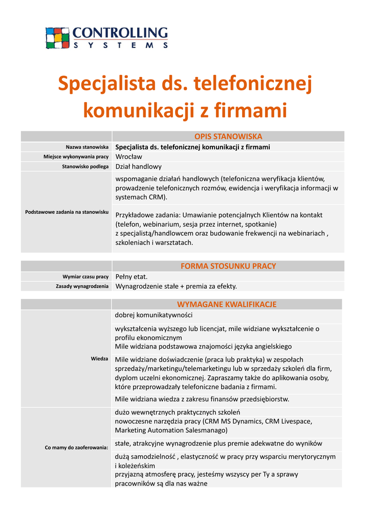 Specjalista ds. telefonicznej komunikacji z firmami OPIS STANOWISKA Nazwa stanowiska Miejsce wykonywania pracy Stanowisko podlega Specjalista ds. telefonicznej komunikacji z firmami Wrocław Dział handlowy wspomaganie działań handlowych (telefoniczna weryfikacja klientów, prowadzenie telefonicznych rozmów, ewidencja i weryfikacja informacji w systemach CRM). Podstawowe zadania na stanowisku Przykładowe zadania: Umawianie potencjalnych Klientów na kontakt (telefon, webinarium, sesja przez internet, spotkanie) z specjalistą/handlowcem oraz budowanie frekwencji na webinariach , szkoleniach i warsztatach. FORMA STOSUNKU PRACY Wymiar czasu pracy Zasady wynagrodzenia Pełny etat. Wynagrodzenie stałe + premia za efekty. WYMAGANE KWALIFIKACJE dobrej komunikatywności wykształcenia wyższego lub licencjat, mile widziane wykształcenie o profilu ekonomicznym Mile widziana podstawowa znajomości języka angielskiego Wiedza Mile widziane doświadczenie (praca lub praktyka) w zespołach sprzedaży/marketingu/telemarketingu lub w sprzedaży szkoleń dla firm, dyplom uczelni ekonomicznej. Zapraszamy także do aplikowania osoby, które przeprowadzały telefoniczne badania z firmami. Mile widziana wiedza z zakresu finansów przedsiębiorstw. dużo wewnętrznych praktycznych szkoleń nowoczesne narzędzia pracy (CRM MS Dynamics, CRM Livespace, Marketing Automation Salesmanago) Co mamy do zaoferowania: stałe, atrakcyjne wynagrodzenie plus premie adekwatne do wyników dużą samodzielność , elastyczność w pracy przy wsparciu merytorycznym i koleżeńskim przyjazną atmosferę pracy, jesteśmy wszyscy per Ty a sprawy pracowników są dla nas ważne Co mamy do zaoferowania: Praca stacjonarna w dogodnej lokalizacji Wrocławia, brak wyjazdów służbowych Laptop służbowy Możliwość zdobycia praktycznych umiejętności w dziedzinie sprzedaży produktów i usług profesjonalnych dla firm. W ramach awansu możliwość objęcia stanowiska specjalisty ds. sprzedaży - osoby, która prowadzi prezentację i negocjacje handlowe. Aplikację proszę przesyłać na adres e-mail: [email protected]