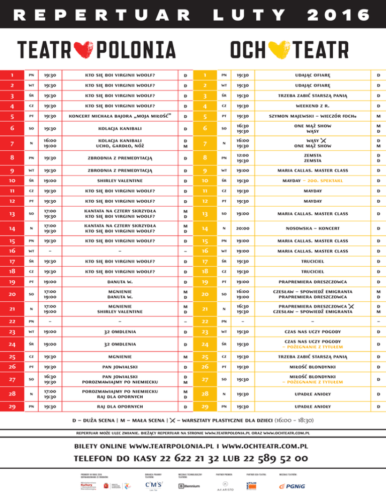 r e p e r t ua r 2016 l u t y 1 pn 19:30 kto się boi virginii woolf? d 1 pn 19:30 udając ofiarę d 2 wt 19:30 kto się boi virginii woolf? d 2 wt 19:30 udając ofiarę d 3 śr 19:30 kto się boi virginii woolf? d 3 śr 19:30 trzeba zabić starszą panią d 4 cz 19:30 kto się boi virginii woolf? d 4 cz 19:30 weekend z r. d 5 pt 19:30 koncert michała bajora „moja miłość” d 5 pt 19:30 szymon majewski – wieczór f ochu m 6 so 19:30 kolacja kanibali d 6 so 16:30 19:30 one mąż show wąsy m d 7 n 16:00 19:00 kolacja kanibali ucho, gardło, nóż d m 7 n 16:00 19:30 wąsy one mąż show d m 8 pn 19:30 zbrodnia z premedytacją d 8 pn 12:00 19:30 zemsta zemsta d d 9 wt 19:30 zbrodnia z premedytacją d 9 wt 19:00 maria callas. master class d 10 śr 19:00 shirley valentine d 10 śr 19:30 mayday – 200. spektakl d 11 cz 19:30 kto się boi virginii woolf? d 11 cz 19:30 mayday d 12 pt 19:30 kto się boi virginii woolf? d 12 pt 19:30 mayday d so 17:00 19:30 kantata na cztery skrzydła kto się boi virginii woolf? m d 13 so 19:00 maria callas. master class d 14 n 17:00 19:30 kantata na cztery skrzydła kto się boi virginii woolf? m d 14 n 20:00 nosowska – koncert d 15 pn 19:30 kto się boi virginii woolf? d 15 pn 19:00 maria callas. master class d 16 wt – – – 16 wt 19:00 maria callas. master class d 17 śr 19:30 kto się boi virginii woolf? d 17 śr 19:30 truciciel d 18 cz 19:30 kto się boi virginii woolf? d 18 cz 19:30 truciciel d 19 pt 19:00 danuta w. d 19 pt 19:00 prapremiera dreszczowca d 20 so 17:00 19:00 mgnienie danuta w. m d 20 so 16:00 19:00 czesław – spowiedź emigranta prapremiera dreszczowca m d 21 n 17:00 19:00 mgnienie shirley valentine m d 21 n 16:30 19:30 prapremiera dreszczowca czesław – spowiedź emigranta d m 22 pn – – – 22 pn – – – 23 wt 19:00 32 omdlenia d 23 wt 19:30 czas nas uczy pogody d 24 śr 19:00 32 omdlenia d 24 śr 19:30 czas nas uczy pogody – pożegnanie z tytułem d 25 cz 19:30 mgnienie m 25 cz 19:30 trzeba zabić starszą panią d 26 pt 19:30 pan jowialski d 26 pt 19:30 miłość blondynki d so 16:30 19:30 pan jowialski porozmawiajmy po niemiecku d m 27 so 19:30 miłość blondynki – pożegnanie z tytułem d 28 n 17:00 19:30 porozmawiajmy po niemiecku raj dla opornych m d 28 n 19:30 upadłe anioły d 29 pn 19:30 raj dla opornych d 29 pn 19:30 upadłe anioły d 13 27 d – duża scena | m – mała scena | – warsztaty plastyczne dla dzieci (16:00 - 18:30) repertuar może ulec zmianie. bieżący repertuar na stronie www.teatrpolonia.pl oraz www.ochteatr.com.pl bilety online www.teatrpolonia.pl i www.ochteatr.com.pl telefon do kasy 22 622 21 32 lub 22 589 52 00 PREMIERY W ROKU 2016 DOFINANSOWANO ZE ŚRODKÓW: DORADCA PRAWNY TEATRÓW: MECENAS TECHNOLOGICZNY TEATRÓW: PARTNER PREMIER: PARTNER OCH-TEATRU: MECENAS TEATRÓW: