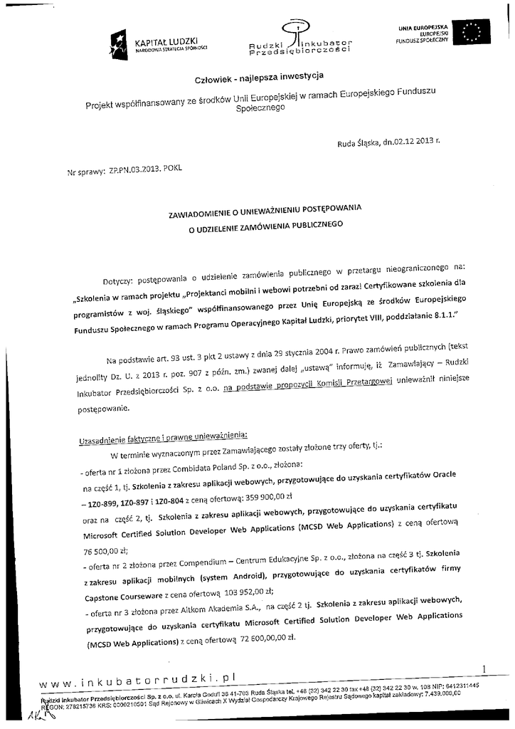 函螺“日豊鼠器 projektwsPdmanSOWanyZeSrodkOwUnLiEuroP輔WramaChEurOPeisklegOFunduszu SpolecznegO RudaSi挙ka,dn・02・122013r NrSPraWy:ZP・PN・032013・POKL 乙剛ADOMIENIEOUN−EWAiN酬UPOSTEPOWANIA DotyCZy:POStePOWaniaOudzLe−eniezam6wieniapubLicznegOWPrZetargunieOgraniczonegOna: ,,SzkoieniawramaChprojektuJ,roiektancimobiin=web。WipotrZebniodzara痢ikowaneSZkCleniadla programiStdwzwOj・51askiego′′wsp6rFinanScWanegOprZeZUniemOPejskaZeSrodkdwEuropejskiego FunduszuSpO−ecznegOWramaChProgramuOperaCYjnegoKapita咽′priorYtetV。l′POddziatanie8・1・1・’’ NapOdstawieartj3ust・3pkt2uStaWy油a29styCZnia2004rPraWOZamdwie岬CZnyChltekst _・÷ 7_、,、、?,、読っiRrV_Rudz南 jedn0日tv Dz U.Z2013「.POZ・907Z直Zm・)zwanejda−ejlJuStaW掴0rmujeJiiZamaWiajacy−Rudzki 工.〈」,ハ,..,TE,+∴Cn70.0.na哩坦遁世哩唖坦通LPl唾迎畦uniewain帥niejsze lnkubator PrzedsieblOrCZCScL Sp・ postePOWanは・ WterminiewyznaCZOnVm przezzamawiajacegOZOSta囲OZOnetrZVOfe両・: 一〇fertanrlztoionaPrZeZCombidataPoiandSpZO・0′Z十ozona: nacz幽・Szko−eniazzakresuapiikaciiwebowYCh′prZYgOtOWuiacedouzySkt面acehYdkatdwOraCie _lZ0−899,1Z0−897ilZ0−804zcen河e如Wa・359900′00zt 0raZnaCZe掴・Szk。一eniazzakresuap−ikacjiwebowYCh′prZygOtOWujacedouzYSkaniacertYfikatu McrosoftCertinedS。一utionDeve一〇perWebApP”atioru(MCSDWeb軸Cations)zcenaOfertowa _Ofertanr2zhzonaPrZeZComPendium−CentrumEdukacyineSpz〇・〇′Z一〇ZonanaCZe553ti・Szkolenia zzakresuap−ikacjim0時h{sYStemAn刷,prZY80tOWujacedouzYSkaniacertYnkatdwfirmy capstonecoursewarezcenaofertowalO3952′00zi _Ofertanr32IoionaprzeZA−tkomAkademiaS・A・′naCZq362tj・Szko−eniaZZakreSuaplikacjiwebowYChj przYgOtOWujacedouzYSkimiacedYtikatuMicrosoh〔高rtifiedSo−utionDevei。perWebAppiications (MCSDWebAppiicationS)zcenaOfertowa72600′00JOOれ wwwin ku batCrrudzkl Pi 函螺∼C日豊轟器 projektwspdJflnansoWanyZeSrodkdwUn岨ropejSkbjwramaChEurOP函egoFunduszu poniewaicenvWSZYS畑Ofertprzekraczaiakwot掴kaZamaWLaJaCVPOda吊ezp05rednIOPrZed emofertn Lp・ 1. areallzacJePrZ Numer CZeSCI Kwota言akaZamaWialaCypOda−bezpoSrednioprZedotwarCiemofert Cze琵1 105660,00 Z. Cze詑2 37120,00 3. Cze詑3 53760,00 zamawiajacyunieWain時ZedmiOtOWeP05tePOWanienaPOdstawieart・93ustlpkt・4uStaWV ̄Cena najkorzYSt…eISZe」OfertyprzewyZSZakwote,jakazamawiaJaCyZamierZaPrZeZnaCZYCnaSfinan50Wanie ZamOWienia. 1.WvkonawcaCornbidataPoiandSp・ZOO・niewykazalspehIaWarunk6wudziatuwpoStePOWa血 wzakresiewiedzvido5wiadczenlaWZakresieczefci2zamdwle…a・ZgodnLeZrOZdziatemXiipkt・2・2・1・ specvf圃istotnychWarunk6wZam6wienla(SIWZ)WvkonawcaubiegaIaO/5時OZamdwieniewzakresieczeSci Zmia十wkazae,iZwokresieostat…Chtrzech∼atprzedupNwemterm活uskladaniaofertJajeie okre5 prowadzeniadziata−noScijeStkr6tSZY−WtYmOkresie′Wykona川bwyko…jeluShgeobejmujacareaIiza(来 SZkoIeniaprowadzonegoprzezCenyfIkowanegotrenera′PrZygOtOWujacadoegzam血CertVf時acegoMCSD: webAppiications(MicrosoftCertified501utionDeve一〇perWebAppLications)・Napotwierdzeniespe仙enia powYZszegowarunkuWYkonawcazobowiazanyby恒dbZycwrazzofertawvkazwykonanvchgtdwnYChus†ugJ awprzypadkuSwiadczehokre50WyChiubc軸ChrdwnleZWykonYWanVChzpodaniemichprzedm(Ot両t wYkonaniaipodmiotdw narzeczktdrych us†ugizostaNwvkonane orazZahczeniemdowoddw potw−erdzaJaCVCh′CZVZOStarywykonanenalezycie・ wYkonawcaWPOZyC」inr3wYkazuus+ugwskazalwykonanieuStugil′M520480−PrQi’庇owonieop/ikodI webowychzapomocqHTML5/Jovo5cnptiCS53′′odpowiadajacawarunkowiopiSanemuPrZeZZamawiaJaCegO′ jednakniePrZedtoZYldowodupotwierdzajacegona−ezytejeJWYkonanieZamawiajacyn∼eWeZWa間YkonawcY douzupe油eniadokumentu′Okt6時mWYZe」mOWaZuWag…konieczno;Cuniewa症eniapostepoWania′CO odpowIadadvspozvcj−art・26uSt3uStaWV・ 2.WvkonawcaA−tkomAkademiaS・A・nieWykaza恒e柚awarunk6wudzia十uwpoStePOWaniuwzakreSie wiedzyidCgwiadczenia・ZgodniezrozdzlalemXiipkt2・2・1・SIWZWykonawcaubiegaJaCySIeOZamGwienie wzakresieczeSci2miatwykaza諦WOkresieoStatnichtrzech−atprzeduptYWemterm血Sktadaniaofert′ ajeze∼iOkresproWadzeniad謝一nogciJeStkrdtszv−WtVmOkresie′Wykona冊wYkonujelu5十ugeobeJmu舶 =nkubatCrrUdzk「Pi RudzkIinkubatorPrzedsiebiOrCZOSciSp・Z〇・〇 108NIP 6412311445 KarolaGoduli3641−703RudaSiaskate一十48(32)3422230fax+48(32)3422230wlOBNirCm、 ( .____,ノー((,(_(Do,0°,白くaHnwenokaoita†zakはdow7439000,00 目黒思想 描霜嵩 projektwspO臨ansoWanyZeSrodkbwU…EuropejskbjwramaChEuropeJSk−egOFu血SZu realizac」eSZkoieniaPrOWadzonegoprZeZCertyfIkowanegotrenera′PrZygOtOWu」aCadoegzaminucekyfikujacego MCSD:WebAppiiCations(MiCrO50ftCertifiedSo−utionDeVe一〇perWebAppticatlOnS)NapotWierdzenie spehieniapowviszegowarunkuWykonawcaZObowiiZa向直edbZycwraZZOfertawykazwvkonanYCh 的WnYChustug′aWPrZYPadkugwiadczehokre50WVCh−ubcra帥rdwnieiwvkonvwanyChzpodaniemiCh przedmiotu,datwYkonaniaIPOdmiot6W′narZeCZktdrychuShgizosta画konaneoraZZa匝niemdowod6w potwierdzajacych′CZVZOSta画konanenaleZycie・WvkonawcawSkazaluShJge〃ProgrOmminglnC#wiでh Micros和布uolSfudIO2012(M510266)/DeveIopingWIndowsCommunicofionFoundoでion50Ius/On5WIでh Micros卵座uoI5fudio2010(M5ユ026神tdranieodpowiadawarunkowiOPiSanemuPrZeZZamawiajacego′ atymSamVmniemoiel事0nabranapoduwagQPrZYOCeniespe柚awarunkdwudziahlWPOStePOWa血 zamawiajacyniewezwaNVkonawcVdouzupehleniaWYkazuus十ugonowaPOZYqeZuWagina konieCZnO56uniewaznieniapostepoWania/C00dpowiadadvspozvcjiart・26ust・3ustawy・ BrakwvkazaniaspehIaniaWa…kdwudzia′uwpostepOWaniuStanOW−POdstawedowYkiuczenia wykonawcyZPOStePOWaniaZgOdniezart24ust・2pkt4ustaWy・PonadtowoparciuOart・24ust・4ustaWV oferteWvkonawcywYk−uczonegOuZna」eSleZaOdrzucona・ 吐蓋嚢謹 pROKURENT 四囲病 Rozdz謝nik・ 一Wykonawcv′ktdrzvz†ozvliOferteノ ーtabIICaOgわSZehsiedz胡bieZamaWia庫ego′ _StrOnainternetOWa:http://www諏ubatorrudzk凪pinfo・PLノ ー aa. www.inkubatOrrudzkl