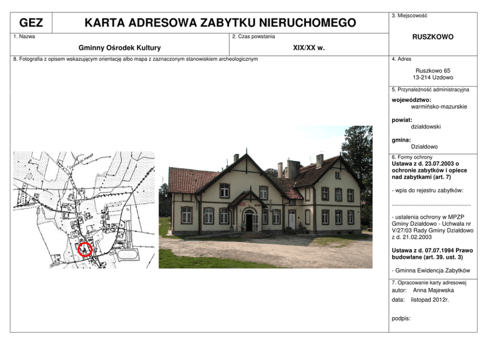 GEZ KARTA ADRESOWA ZABYTKU NIERUCHOMEGO 1. Nazwa 3. Miejscowość RUSZKOWO 2. Czas powstania Gminny Ośrodek Kultury 8. Fotografia z opisem wskazującym orientację albo mapa z zaznaczonym stanowiskiem archeologicznym XIX/XX w. 4. Adres Ruszkowo 65 13-214 Uzdowo 5. Przynależność administracyjna województwo: warmińsko-mazurskie powiat: działdowski gmina: Działdowo 6. Formy ochrony Ustawa z d. 23.07.2003 o ochronie zabytków i opiece nad zabytkami (art. 7) - wpis do rejestru zabytków: ................................................. - ustalenia ochrony w MPZP Gminy Działdowo - Uchwała nr V/27/03 Rady Gminy Działdowo z d. 21.02.2003 Ustawa z d. 07.07.1994 Prawo budowlane (art. 39. ust. 3) - Gminna Ewidencja Zabytków 7. Opracowanie karty adresowej autor: data: podpis: Anna Majewska listopad 2012r. 9. Fotografia dodatkowa 10. Opis architektoniczny Budynek wolnostojący, o rozczłonkowanej bryle, 1- i 2-kondygnacyjny z częściowo użytkowym poddaszem, część brył ze ścianką kolankową. Murowany, tynkowany. Opracowania otworów i detal architektoniczny z cegły ceramicznej, licowej. Dachy dwuspadowe, przenikające się, kryte dachówką ceramiczną, holenderką. Wysunięte okapy, dekoracyjnie opracowane ostatki belek i sterczyny. Otwory okienne o wykroju prostokątnym, zamknięte łukiem odcinkowym. Drzwiowy - pełnym. Okna PCV. Drzwi PCV. 11. Stan zachowania Zachowana bryła, materiał wykonania budynku. Wtórne tynki i stolarka otworowa oraz schody i podjazd. 12. Historia miejscowości lub obiektu 13. Uwagi Początki wsi Ruszkowo (Rauschken) sięgają średniowiecza i związane są z majątkiem ziemskim. Zlokalizowano ją na obszarze, który w 1321r. Zakon Krzyżacki przeznaczył pod kolonizację, istniało już w 1399r. Przed 1400r. doszło do podpisania testamentu na przeżycie między Albrechtem z Ruszkowa a Dietrichem von Döhlau. W 1433r. Wielki Mistrz Zakonu Paul von Russdorf nadał w lenno 30 włók ziemi w Ruszkowie i 10 włók ziemi w Lewałdzie Sanderowi von Roggenhausen. W 1861r. we wsi było 50 domów i 345 mieszkańców, funkcjonował wiatrak. W 1932r. majątek, już jako własność państwową, dzierżawił Heinrich Karl von Hell. Ze względu na wartości historyczno-kulturowe dokumentujące typ zabudowy regionalnej, obiekt należało ująć w wojewódzkiej ewidencji zabytków.