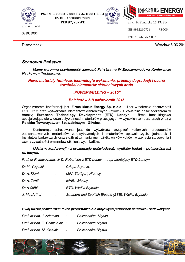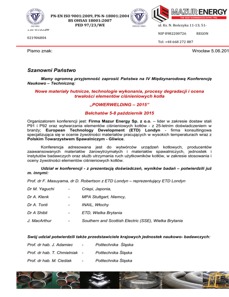PN-EN ISO 9001:2009, PN-N-18001:2004 BS OHSAS 18001:2007 PED 97/23/WE ul. Ks. N. Bończyka 11-13; 51- 138 Wrocław NIP 8982200726 REGON 021906804 Tel: +48 668 272 887 Pismo znak: Wrocław 5.06.201 Szanowni Państwo Mamy ogromną przyjemność zaprosić Państwa na IV Międzynarodową Konferencję Naukowo – Techniczną: Nowe materiały hutnicze, technologie wykonania, procesy degradacji i ocena trwałości elementów ciśnieniowych kotła „POWERWELDING – 2015” Bełchatów 5-8 październik 2015 Organizatorem konferencji jest: Firma Mazur Energy Sp. z o.o. – lider w zakresie dostaw stali P91 i P92 oraz wytwarzania elementów ciśnieniowych kotłów - z 25-letnim doświadczeniem w branży; European Technology Development (ETD) Londyn - firma konsultingowa specjalizująca się w ocenie żywotności materiałów pracujących w wysokich temperaturach wraz z Polskim Towarzystwem Spawalniczym - Gliwice. Konferencja adresowana jest do wytwórców urządzeń kotłowych, producentów zaawansowanych materiałów żarowytrzymałych i materiałów spawalniczych, jednostek i instytutów badawczych oraz służb utrzymania ruch użytkowników kotłów, w zakresie stosowania i oceny żywotności elementów ciśnieniowych kotłów. Udział w konferencji - z prezentacją doświadczeń, wyników badań – potwierdzili już m. innymi: Prof. dr F. Masuyama, dr D. Robertson z ETD Londyn – reprezentujący ETD Londyn Dr M. Yaguchi - Criepi, Japonia, Dr A. Klenk - MPA Stuttgart, Niemcy, Dr A. Tonti - INAIL, Włochy Dr A Shibli - ETD, Wielka Brytania J. MacArthur - Southern and Scottish Electric (SSE), Wielka Brytania Swój udział potwierdzili także przedstawiciele krajowych jednostek naukowo- badawczych: - Politechnika Śląska Prof. dr hab. T. Chmielniak - Politechnika Śląska Prof. dr hab. M. Cieślak Politechnika Śląska Prof. dr hab. J. Adamiec - PN-EN ISO 9001:2009, PN-N-18001:2004 BS OHSAS 18001:2007 PED 97/23/WE ul. Ks. N. Bończyka 11-13; 51- 138 Wrocław NIP 8982200726 REGON 021906804 Tel: +48 668 272 887 Prof. dr hab. G. Golański - Politechnika Częstochowska Prof. dr hab. A. Hernas - Politechnika Śląska Prof. dr hab. J. Dobrzański - Instytut Metalurgii Żelaza Prof. dr hab. T. Łagoda - Politechnika Opolska Prof. dr hab. G. Moskal - Politechnika Śląska Prof. dr hab. R. Kuziak - Instytut Metalurgii Żelaza Prof. dr hab. M. Pronobis - Politechnika Śląska Prof. dr hab. J. Słania - Politechnika Częstochowska Konferencja zaplanowana została jako kontynuacja dotychczasowego cyklu konferencji w zakresie rozwoju krajowej energetyki z uwzględnieniem doskonalenia procesów wytwarzania i badań nowych żarowytrzymałych stali kotłowych przeznaczonych dla bloków o nadkrytycznych parametrach pracy oraz oceny własności elementów ciśnieniowych kotłów w procesie ich eksploatacji. Szczegóły dotyczące konferencji znajdziecie Państwo w załączonym folderze (wraz z formularzem zgłoszenia) oraz na stronie www.mazurenergy.pl oraz www.pts-spawalnicy.pl Za organizatorów: