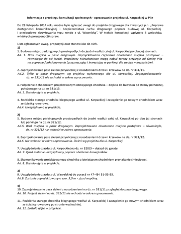 Informacja z przebiegu konsultacji społecznych - opracowanie projektu ul. Karpackiej w Pile Do 28 listopada 2014 roku można było zgłaszać uwagi do projektu drogowego dla inwestycji p.n. „Poprawa dostępności komunikacyjnej i bezpieczeństwa ruchu drogowego poprzez budowę ul. Karpackiej i przebudowę skrzyżowania typu rondo z ul. Wawelską”. W trakcie konsultacji wpłynęło 8 wniosków, w których poruszono 26 spraw. Lista zgłoszonych uwag, propozycji oraz stanowisko do nich. 1) 1. Budowa miejsc parkingowych prostopadłych do jezdni wzdłuż całej ul. Karpackiej po obu jej stronach. Ad. 1. Brak miejsca w pasie drogowym. Zaprojektowano częściowo obustronne miejsca postojowe – równoległe do osi jezdni. Wspólnoty Mieszkaniowe mogą nabyć tereny przyległe od Gminy Piła na poprawę funkcjonowania (przeznaczając i inwestując w parkingi dla swoich mieszkańców). 2. Zaprojektowanie pasa zieleni przyulicznej z nasadzeniami drzew i krzewów na dz. nr 331/11. Ad.2. Tylko w pasie drogowym wg projektu wykonanego dla ul. Karpackiej. Zagospodarowanie dz. nr 331/11 nie wchodzi w zakres opracowania. 3. Połączenie z chodnikiem projektowanym istniejącego chodnika – dojścia do budynku od strony północnej, położonego na dz. nr 331/13. Ad. 3. Zostało ujęte w projekcie. 4. Rozbiórka starego chodnika biegnącego wzdłuż ul. Karpackiej i zastąpienie go nowym chodnikiem wraz ze ścieżką rowerową. Ad.4. Uwzględniono w projekcie. 2) 5. Budowa miejsc parkingowych prostopadłych do jezdni wzdłuż całej ul. Karpackiej po obu jej stronach lub parkingu na dz. nr 321/12. Ad.5. Brak miejsca w pasie drogowym. Zaprojektowano obustronne miejsca postojowe – równoległe, dz. nr 321/12 nie wchodzi w zakres opracowania. 6. Zaprojektowanie pasa zieleni przyulicznej z nasadzeniami drzew i krzewów na dz. nr 321/12. Ad.6. Nie wchodzi w zakres opracowania. Zieleń wg projektu dla ul. Karpackiej. 7. Uwzględnienie zjazdu z ul. Karpackiej na dz. nr 320/3 – dojazd do garaży. Ad. 7. Zjazd zostanie uwzględniony poprzez obniżenie krawężników. 8. Skomunikowanie projektowanego chodnika z istniejącym chodnikiem przy altanie śmieciowej. Ad. 8. Zostało ujęte w projekcie. 3) 9. Uwzględnienie zjazdu z ul. Wawelskiej do posesji nr 47-49 i 51-53-55. Ad.9. Zostanie zaprojektowany o szer. 5,0 m - zjazd wspólny. 4) 10. Zaprojektowanie pasa zieleni z nasadzeniami na dz. nr 331/11 przyległej do pasa drogowego. Ad. 10. Projekt zieleni na dz. 331/11 nie wchodzi w zakres opracowania. 11. Rozbiórka starego chodnika biegnącego wzdłuż ul. Karpackiej i zastąpienie go nowym chodnikiem wraz ze ścieżką rowerową po stronie wschodniej. Ad. 11. Zostało ujęte w projekcie. 12. Połączenia chodnika projektowanego z dwoma dojściami (od str. południowej i północnej) do budynku 2,4,6,8. Ad. 12. Zostało uwzględnione w projekcie. 13. Wyznaczenie miejsc parkingowych wzdłuż całej ul. Karpackiej po obu jej stronach. Ad. 13. Brak miejsca w pasie drogowym. Zaprojektowano częściowo obustronne, równoległe miejsca postojowe. 5) 14. Odpowiednie oznakowanie parkingu budowanego wzdłuż bloku nr 2-4-6-8. Ad. 14. Budowa parkingu przy bloku nr 2-4-6-8 nie wchodzi w zakres opracowania. 6) 15. Połączenie projektowanej drogi rowerowej jako czwarty wlot z częścią ul. Karpackiej. Ad. 15. Uwzględniono połączenie drogi rowerowej przy przejściu dla pieszych. 16. Połączenie projektowanej drogi rowerowej w istniejący układ drogowy jako dodatkowy wlot na rondzie ul. Wawelskiej i Tucholskiej. Ad. 16. Połączenie ścieżki rowerowej z rondem zostanie uwzględnione w projekcie. 17. Zachowanie ciągłości nawierzchni drogi dla rowerów na zjazdach. Ad. 17. Uwzględniono to już w projekcie. 18. Korekta przebiegu drogi dla rowerów i chodnika w celu uzyskania przestrzeni na ustawienie znaków drogowych, podpórek dla rowerzystów i obszarów akumulacji. Ad. 18. Zostanie uwzględnione w projekcie bez obszarów akumulacji. 19. Korekta przebiegu chodnika po str. zachodniej ul. Karpackiej- wg załącznika graficznego. Ad. 19. Zostanie uwzględniona. 20. Skrócenie zatok postojowych, tak, aby zaparkowane samochody nie ograniczały widoczności na przejściu dla pieszych. Ad. 20. Zostanie ujęte w projekcie. 21. Na przejściach dla pieszych zastosować płytki perforowane dla osób niewidomych i słabo widzących. Ad. 21. Zostaną zaprojektowane. 22. Zastosować specjalne podpórki dla rowerzystów oczekujących na wjazd na skrzyżowanie. Ad. 22. Zostaną zastosowane. 7) 23. Dokonać korekty lokalizacji ronda poprzez przesunięcie w kierunku północno-wschodnim o ok. 6 m. Ad. 23. Zmiana lokalizacji ronda jest nieuzasadniona ekonomicznie ze względu na występującą podziemną infrastrukturę techniczną. 24. Negatywna ocena lokalizacji miejsc postojowych ze względu na ich bliskie odległości względem siebie i układ naprzeciwległy – zagrożenie bezpieczeństwa i płynności ruchu. Ad. 24. Miejsca postojowe zostały zaprojektowane jako równoległe do krawędzi jezdni przez co nie będą stwarzały zagrożenia dla bezpieczeństwa ruchu. 8) 25. Wątpliwości co do wielkości promieni wjazdowych na rondo umożliwiających przejazd samochodów ciężarowych oraz wykonania manewru ruchu okrężnego na rondzie. Ad. 25. Zaprojektowane rondo jest rondem z wyspą przejazdową. W celu poprawy skrętu w prawo z ul. Wawelskiej w ul. Karpacką będzie wykonany „zabruk” o szer. w najszerszym miejscu 2,0 m co zwiększy promień skrętu. 26. Wykreślenie torów jazdy przez rondo dla pojazdów ciężarowych. Ad. 26. Ze względu na ograniczenie terenu oraz przyjęte rozwiązanie nie ma możliwości wykreślenia (wydzielenia) torów jazdy dla samochodów ciężarowych. Piła, 17 grudnia 2014 r.
