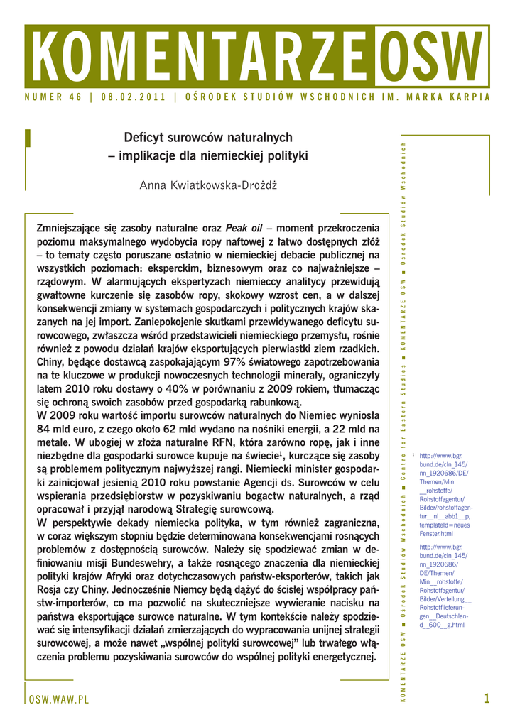 Komentarze osw O S W. W A W. P L O ś r o d e k S t u d i ó w OSW K OMENTARZE S t u d i e s E a s t e r n f o r C e n t r e Ws c h o d n i c h S t u d i ó w O ś r o d e k Zmniejszające się zasoby naturalne oraz Peak oil – moment przekroczenia poziomu maksymalnego wydobycia ropy naftowej z łatwo dostępnych złóż – to tematy często poruszane ostatnio w niemieckiej debacie publicznej na wszystkich poziomach: eksperckim, biznesowym oraz co najważniejsze – rządowym. W alarmujących ekspertyzach niemieccy analitycy przewidują gwałtowne kurczenie się zasobów ropy, skokowy wzrost cen, a w dalszej konsekwencji zmiany w systemach gospodarczych i politycznych krajów skazanych na jej import. Zaniepokojenie skutkami przewidywanego deficytu surowcowego, zwłaszcza wśród przedstawicieli niemieckiego przemysłu, rośnie również z powodu działań krajów eksportujących pierwiastki ziem rzadkich. Chiny, będące dostawcą zaspokajającym 97% światowego zapotrzebowania na te kluczowe w produkcji nowoczesnych technologii minerały, ograniczyły latem 2010 roku dostawy o 40% w porównaniu z 2009 rokiem, tłumacząc się ochroną swoich zasobów przed gospodarką rabunkową. W 2009 roku wartość importu surowców naturalnych do Niemiec wyniosła 84 mld euro, z czego około 62 mld wydano na nośniki energii, a 22 mld na metale. W ubogiej w złoża naturalne RFN, która zarówno ropę, jak i inne niezbędne dla gospodarki surowce kupuje na świecie1, kurczące się zasoby są problemem politycznym najwyższej rangi. Niemiecki minister gospodarki zainicjował jesienią 2010 roku powstanie Agencji ds. Surowców w celu wspierania przedsiębiorstw w pozyskiwaniu bogactw naturalnych, a rząd opracował i przyjął narodową Strategię surowcową. W perspektywie dekady niemiecka polityka, w tym również zagraniczna, w coraz większym stopniu będzie determinowana konsekwencjami rosnących problemów z dostępnością surowców. Należy się spodziewać zmian w definiowaniu misji Bundeswehry, a także rosnącego znaczenia dla niemieckiej polityki krajów Afryki oraz dotychczasowych państw-eksporterów, takich jak Rosja czy Chiny. Jednocześnie Niemcy będą dążyć do ścisłej współpracy państw-importerów, co ma pozwolić na skuteczniejsze wywieranie nacisku na państwa eksportujące surowce naturalne. W tym kontekście należy spodziewać się intensyfikacji działań zmierzających do wypracowania unijnej strategii surowcowej, a może nawet „wspólnej polityki surowcowej” lub trwałego włączenia problemu pozyskiwania surowców do wspólnej polityki energetycznej. http://www.bgr. bund.de/cln_145/ nn_1920686/DE/ Themen/Min __rohstoffe/ Rohstoffagentur/ Bilder/rohstoffagentur__nl__abb1__p, templateId=neues Fenster.html 1 http://www.bgr. bund.de/cln_145/ nn_1920686/ DE/Themen/ Min__rohstoffe/ Rohstoffagentur/ Bilder/Verteilung__ Rohstofflieferungen__Deutschland__600__g.html OSW Anna Kwiatkowska-Drożdż K OMENTARZE Deficyt surowców naturalnych – implikacje dla niemieckiej polityki Ws c h o d n i c h numer 46 | 08.02.2011 | ośrodek studiów wschodnich im. marka karpia 1 Komentarze osw n u m e r 4 6 | 0 8 . 0 2 . 2 0 1 1 | o ś r o d e k s t u d i ó w w s c h o d n i c h i m . m a r ka ka r p i a Niemieccy eksperci o kończących się zasobach naturalnych Deficyt surowców i jego konsekwencje dla światowej oraz w szczególności niemieckiej gospodarki i polityki są przedmiotem badań i analiz najważniejszych instytucji badawczych i think tanków w RFN. Problemem tym zajmuje się zarówno najważniejsza niemiecka instytucja doradcza rządu i parlamentu w kwestiach polityki zagranicznej i bezpieczeństwa Fundacja Nauka i Polityka (SWP)2, jak i think tank Ministerstwa Obrony – Centrum Transformacji Bundeswehry3 (CTB). Na temat kurczących się zasobów surowców naturalnych, zwłaszcza ropy oraz pierwiastków ziem rzadkich (takich jak cer, cyrkon, dysproz, europ, itr, lantan – niezbędnych w procesie tworzenia nowoczesnych technologii, w tym związanych z energetyką odnawialną) wypowiada się również wielu ekspertów z innych niemieckich instytucji badawczych i analitycznych, np. Wirtschaftsforschung und Beratungsunternehmen AG w Berlinie czy Zentrum für Europäische Wirtschaftsforschung (ZEW) w Mannheim. Z analizy większości ekspertyz i publikaZ analizy większości ekspertyz cji, jakie ukazały się ostatnio na ten temat w RFN, wynika, że już teraz niezbędne i publikacji, jakie ukazały się ostatnio jest przygotowanie instytucji państwa na ten temat w RFN, wynika, że już tei gospodarki do sytuacji niedoboru surowraz niezbędne jest przygotowanie instyców naturalnych, przy czym szczególną tucji państwa i gospodarki do sytuacji uwagę zwraca się na krótki czas, jaki poniedoboru surowców naturalnych. został do podjęcia odpowiednich decyzji. Zasadnicze różnice w diagnozie poszczególnych ekspertów dotyczą natomiast definiowania konsekwencji zarówno krótko- jak i długoterminowych dla niemieckiej polityki wewnętrznej i zagranicznej. Najbardziej alarmująca jest diagnoza analityków Bundeswehry z CTB4. Uważają oni, że istnieje duże prawdopodobieństwo, że Peak oil zostanie osiągnięty około roku 2010, co doprowadzi do trwałego i nieodwracalnego spadku podaży ropy naftowej, w wyniku którego początkowo gwałtownie wzrośnie cena surowca, a następnie w dłuższym okresie (w perspektywie 15–30 lat) może dojść nawet do wybuchu globalnych konfliktów. Konflikty te, zdaniem ekspertów, zagrożą bezpośrednio istnieniu obecnych systemów politycznych i gospodarczych, szczególnie w krajach importujących ropę, których pozycja międzynarodowa będzie wciąż słabnąć przy jednoczesnym wzroście roli eksporterów ropy. Eksperci CTB uważają, że choć dywersyfikacja źródeł energii jest pożądana, to możliwa jest jedynie w ograniczonym stopniu z uwagi na geograficzną koncentrację złóż ropy. Deficyt ropy, która jest klucz
