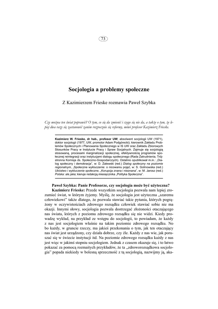 73 Socjologia a problemy społeczne Z Kazimierzem Frieske rozmawia Paweł Szybka Czy można ten świat poprawić? O tym, co się da zmienić i czego się nie da, a także o tym, że lepiej dwa razy się zastanowić zanim rozpocznie się reformy, mówi profesor Kazimierz Frieske. Kazimierz W. Frieske, dr hab., profesor UW; absolwent socjologii UW (1971), doktor socjologii (1977, UW, promotor Adam Podgórecki); kierownik Zakładu Problemów Społecznych i Planowania Społecznego w IS UW oraz Zakładu Zbiorowych Stosunków Pracy w Instytucie Pracy i Spraw Socjalnych. Zajmuje się socjologią stosowaną, procesami marginalizacji społecznej, efektywnością programów społecznej reintegracji oraz instytucjami dialogu społecznego (Rada Zatrudnienia, Trójstronna Komisja ds. Społeczno-Gospodarczych). Ostatnio opublikował m.in.: „Dialog społeczny i demokracja”, w: D. Zalewski (red.) Dialog społeczny na poziomie regionalnym, „Społeczne wykluczenie: o nicowaniu pojęć, w: S. Golinowska (red.) Ubóstwo i wykluczenie społeczne, „Korupcja znana i nieznana”, w: M. Jarosz (red.) Polska: ale jaka; kieruje redakcją miesięcznika „Polityka Społeczna”. Paweł Szybka: Panie Profesorze, czy socjologia może być użyteczna? Kazimierz Frieske: Przede wszystkim socjologia pozwala nam lepiej zrozumieć świat, w którym żyjemy. Myślę, że socjologia jest użyteczna „szaremu człowiekowi” także dlatego, że pozwala stawiać takie pytania, których pogrążony w oczywistościach zdrowego rozsądku człowiek stawiać sobie nie ma okazji. Innymi słowy, socjologia pozwala dostrzegać złożoności otaczającego nas świata, których z poziomu zdrowego rozsądku się nie widzi. Kiedy prowadzę wykład, na przykład ze wstępu do socjologii, to powiadam, że każdy z nas jest socjologiem właśnie na takim poziomie zdrowego rozsądku. No bo każdy, w gruncie rzeczy, ma jakieś przekonania o tym, jak ten otaczający nas świat jest urządzony, czy działa dobrze, czy źle. Każdy z nas wie, jak poruszać się w świecie instytucji itd. Na poziomie zdrowego rozsądku każdy z nas jest więc w jakimś stopniu socjologiem. Jednak z czasem okazuje się, i to łatwo pokazać za pomocą rozmaitych przykładów, że ta „zdroworozsądkowa socjologia” popada niekiedy w bolesną sprzeczność z tą socjologią, nazwijmy ją, aka- 74 Socjologia a problemy społeczne demicką. Zdrowy rozsądek podpowiada, że jak na jakiś kraj nałożyć sankcje gospodarcze, to obywatele tego kraju, wkurzeni do niemożliwości trudnościami codziennego życia, zaczną się awanturować i obalą dyktatora – przykład Iraku. A tymczasem okazuje się, i to w ramach akademickiej socjologii można znakomicie zrozumieć, że ludzie się integrują wokół tego dyktatora. Zdrowy rozsądek tego nie dyktuje. To dyktuje wiedza już z innego poziomu. Co więcej, socjologia, ta socjologia akademicka, podrzuca nam szereg fascynujących pytań, których z poziomu zdrowego rozsądku nie dostrzegamy. Pozwala nam zrozumieć, w jakiej mierze nasze myślenie jest kształtowane przez świat, który nas otacza. Jeżeli tak, to pozwala nam zdobyć się też na jakąś indywidualną autonomię. To znaczy pozwala dostrzec, co we mnie jest „moje własne”, a co zostało mi jakoś narzucone przez społeczny kontekst, w którym przyszło mi żyć. Pozwala mi śledzić to, jak próbuje się mną manipulować, czy jak próbuje się mnie kształtować. Tak rozumiana socjologia w tym sensie jest właśnie użyteczna, że pozwala lepiej orientować się człowiekowi w świecie, który go otacza. Chciałbym jednak zapytać o taką instrumentalną przydatność socjologii, do realizacji celowej zmiany społecznej. Cała kultura mentalna, z której wyrosłem, środowisko, które mnie ukształtowało, czyli krótko mówiąc, grupa ludzi zorganizowanych wokół Adama Podgóreckiego zwykła uważać, że tak – da się pokazać taki pożytek z socjologii dla realizacji planowej zmiany społecznej. Wyrazem tego myślenia jest koncepcja socjotechniki Adama Podgóreckiego. Oczywiście nie jest ona specjalnie oryginalna. Jeżeli dobrze „poskrobać”, to okaże się, że każda idea ma swoich prekursorów. Ale tak naprawdę z biegiem czasu staję się coraz bardziej sceptyczny w stosunku do tej idei. Na jakich przesłankach jest budowany ten sceptycyzm? Może po kolei. Po pierwsze, gdy wracam do starych, jeszcze dziewiętnastowiecznych sporów o charakter nauk społecznych, to coraz częściej przychodzi mi do głowy myśl, że socjologia nie jest jednak nauką nomotetyczną. Krótko mówiąc, coraz bardziej robię się sceptyczny wobec idei praw społecznych rozumianych jako prawa nauki. Dlaczego? Odpowiedź jest prosta. Taka mianowicie, że – z pominięciem całej złożonej debaty filozoficznej dotyczącej przyczynowości – wydaje mi się, iż w naukach społecznych niesłychanie trudno jest ustalać związki przyczynowo-skutkowe. Bardzo trudno jest, posługując się warsztatem socjologii empirycznej – czy jest to socjologia sondażowa, czy niesondażowa – pokazać, mówiąc najkrócej, że coś jest warunkiem koniecznym i wystarczającym czegoś innego. W boleśnie prostych schematach analitycznych mówimy, że A jest przyczyną B, ale zazwyczaj jest przecież tak, że A jest tylko jedynym ze składników Z Kazimierzem Frieske rozmawia Paweł Szybka 75 warunku koniecznego B. Jeżeli tego nie umiemy porządnie pokazać, jeżeli tak naprawdę pokazujemy tylko warunki sprzyjające zajściu czegoś, pokazujemy okoliczności, które zwiększają prawdopodobieństwo tego, że coś innego się zdarzy, to obietnica zawarta w socjologii jest dość miękka. Niech Pan sobie wyobrazi, że idzie Pan do praktyka – polityka, administratora – i mówi Pan tak: „Słuchaj Maniek, jeżeli zrobisz to czy tamto, to masz duże szanse, ale w gruncie rzeczy ja nie wiem, jakie, że uda ci się osiągnąć to, o co tak bardzo zabiegasz”. No to wi