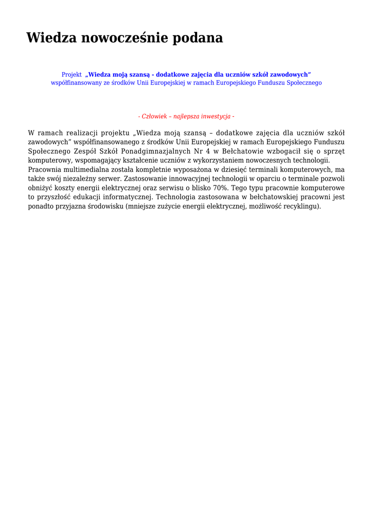 Wiedza nowocześnie podana Projekt „Wiedza moją szansą - dodatkowe zajęcia dla uczniów szkół zawodowych” współfinansowany ze środków Unii Europejskiej w ramach Europejskiego Funduszu Społecznego - Człowiek – najlepsza inwestycja - W ramach realizacji projektu „Wiedza moją szansą – dodatkowe zajęcia dla uczniów szkół zawodowych” współfinansowanego z środków Unii Europejskiej w ramach Europejskiego Funduszu Społecznego Zespół Szkół Ponadgimnazjalnych Nr 4 w Bełchatowie wzbogacił się o sprzęt komputerowy, wspomagający kształcenie uczniów z wykorzystaniem nowoczesnych technologii. Pracownia multimedialna została kompletnie wyposażona w dziesięć terminali komputerowych, ma także swój niezależny serwer. Zastosowanie innowacyjnej technologii w oparciu o terminale pozwoli obniżyć koszty energii elektrycznej oraz serwisu o blisko 70%. Tego typu pracownie komputerowe to przyszłość edukacji informatycznej. Technologia zastosowana w bełchatowskiej pracowni jest ponadto przyjazna środowisku (mniejsze zużycie energii elektrycznej, możliwość recyklingu).