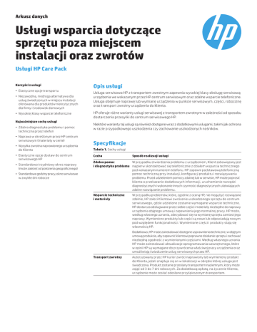 Arkusz danych Usługi wsparcia dotyczące sprzętu poza miejscem instalacji oraz zwrotów Usługi HP Care Pack Korzyści z usługi • Elastyczne opcje transportu • Niezawodna, niedroga alternatywa dla usług świadczonych w miejscu instalacji oferowana dla produktów niekrytycznych dla firmy i środowisk domowych • Wysokiej klasy wsparcie telefoniczne Najważniejsze cechy usługi • Zdalna diagnostyka problemu i pomoc techniczna przez telefon • Naprawa w określonym przez HP centrum serwisowym (materiały w cenie) • Wysyłka zwrotna naprawionego urządzenia do Klienta • Elastyczne opcje dostaw do centrum serwisowego HP • Standardowo trzydniowy okres naprawy (może zależeć od położenia geograficznego) • Standardowe godziny pracy, okno serwisowe w zwykłe dni robocze Opis usługi Usługa serwisowa HP z transportem zwrotnym zapewnia wysokiej klasy obsługę serwisową urządzenia we wskazanym przez HP centrum serwisowym oraz zdalne wsparcie telefoniczne. Usługa obejmuje naprawę lub wymianę urządzenia w punkcie serwisowym, części, robociznę oraz transport zwrotny urządzenia do klienta. HP oferuje różne warianty usługi serwisowej z transportem zwrotnym w zależności od sposobu dostarczenia przesyłki do centrum serwisowego HP. Niektóre warianty tej usługi są również dostępne wraz z dodatkowymi usługami, takimi jak ochrona w razie przypadkowego uszkodzenia czy zachowanie uszkodzonych nośników. Specyfikacje Tabela 1. Cechy usługi Cecha Sposób realizacji usługi Zdalna pomoc W przypadku stwierdzenia problemu z urządzeniem, Klient zobowiązany jest i diagnostyka problemu najpierw skontaktować się telefonicznie z działem wsparcia technicznego pod wskazanym numerem telefonu. HP zapewni podstawową telefoniczną pomoc techniczną przy instalacji, konfiguracji produktu i rozwiązywaniu problemu. Przed udzieleniem pomocy zdalnej lub w serwisie, HP może poprosić klienta o przekazanie dodatkowych informacji, uruchomienie narzędzi diagnostycznych i wykonanie innych czynności diagnostycznych ułatwiających zdalne rozwiązanie problemu. Wsparcie techniczne i materiały W przypadku problemów, które, zgodnie z oceną HP, nie mogą być rozwiązane zdalnie, HP zaleci Klientowi zwrócenie uszkodzonego sprzętu do centrum serwisowego, gdzie udzielone zostanie wymagane wsparcie techniczne. HP dostarcza obsługiwane przez siebie części i materiały niezbędne do naprawy urządzenia objętego umową i zapewnienia jego normalnej pracy. HP może, według własnego uznania, zdecydować się na wymianę sprzętu zamiast jego naprawy. Wymienione produkty lub części są nowe lub odpowiadają nowym pod względem funkcjonalności. Wymienione części i produkty stają się własnością HP. Dodatkowo, HP może zainstalować dostępne usprawnienia techniczne, w objętym umową produkcie, aby zapewnić klientowi poprawne działanie sprzętu i zachować niezbędną zgodność z wymienionymi częściami. Według własnego uznania HP może zainstalować aktualizacje oprogramowania wewnętrznego, które w opinii HP są wymagane do przywrócenia właściwej pracy urządzenia oraz umożliwiają świadczenie usług serwisowych przez HP. Transport zwrotny Autoryzowany przez HP kurier zwróci naprawiony lub wymieniony produkt do Klienta, jeżeli znajduje się on w lokalizacji w obrębie której usługa jest świadczona. Produkt zostanie przesłany transportem naziemnym, który może zająć od 3 do 7 dni roboczych. Za dodatkową opłatą, na życzenie Klienta, urządzenie może zostać odesłane przyśpieszonym transportem. Arkusz danych | Usługi wsparcia dotyczące sprzętu poza miejscem instalacji oraz zwrotów Tabela 1. Cechy usługi (ciąg dalszy) Cecha Sposób realizacji usługi Dostarczenie urządzenia W zależności od wykupionego poziomu usługi, HP oferuje różne opcje transportu do wskazanego centrum uszkodzonego produktu do wskazanego centrum serwisowego HP: serwisowego HP •Przesłanie urządzenia do serwisu przez Klienta: w przypadku tej opcji, Klient jest zobowiązany do przesłania uszkodzonego produktu do wskazanego centrum serwisowego HP. Do obowiązków Klienta należy prawidłowe zapakowanie produktu w zależności od wybranego sposobu dostawy. Klient może dostarczyć urządzenie osobiście lub za pośrednictwem dostępnych lokalnie usług kurierskich. •Odbiór urządzenia przez HP: Autoryzowany przez HP kurier odbierze uszkodzony produkt od Klienta, jeżeli znajduje się on w lokalizacji, w rejonie której usługa jest świadczona i dostarczy produkt do centrum serwisowego HP. Do obowiązków Klienta należy prawidłowe zapakowanie produktu i przygotowanie go do odebrania przez kuriera. Aby odbiór urządzenia nastąpił tego samego dnia, zgłoszenie musi zostać przyjęte przed godziną 12:00 czasu lokalnego (zależy od warunków lokalnych). W przypadku zgłoszeń serwisowych przyjętych po godzinie 12:00 czasu lokalnego termin odebrania urządzenia zostanie wyznaczony w następnym dniu roboczym. Czas realizacji usługi Czas realizacji usługi wynosi pięć dni roboczych w wybranych lokalizacjach, poza przypadkami, w których sporadyczne problemy i brak części spowoduje wydłużenie czasu naprawy. Całkowity czas realizacji usługi jest liczony w dniach roboczych od momentu dostarczenia produktu do HP, do momentu przygotowania naprawionego produktu do wysyłki do Klienta. Dostarczenie do HP oznacza (w zależności od wybranej opcji dostawy): •Odebranie przesyłki od Klienta przez autoryzowanego kuriera HP •Dostarczone do centrum serwisowego HP w czasie godzin pracy centrum, jeżeli przesyłkę dostarcza lub wysyła sam Klient Pięciodniowy czas realizacji usługi może nie być dostępny we wszystkich lokalizacjach i może się wydłużyć z dala od obszarów miejskich. Okno serwisowe Okno serwisowe oznacza czas, w którym opisane usługi świadczone są zdalnie lub poza centrum serwisowym. Usługa jest dostępna od 8:00 do 17:00, od poniedzia