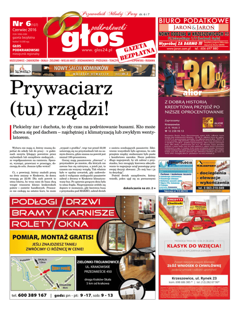 Przewodnik Młodej Pary str. 6 i 7 Nr 6(107) Czerwiec 2016 podkrakowski ISSN 1898-438X gazeta bezpłatna Nakład 10.000 egz. ta e z ga tna miesięcznik regionalny a ł zp e b KRZESZOWICE • ZABIERZÓW • SKAŁA • ZIELONKI • WIELKA WIEŚ • JERZMANOWICE • PRZEGINIA • TENCZYNEK • WOLA FILIPOWSKA • RUDAWA GŁOS PODKRAKOWSKI www. glos24.pl Prywaciarz (tu) rządzi! alior Piekielny żar i duchota, to zły czas na podróżowanie busami. Kto może chowa się pod dachem – najchętniej z klimatyzacją lub zwykłym wentylatorem. Wyboru nie mają ci, którzy muszą dojechać do szkoły lub do pracy - w godzinach szczytu łykający powietrze przez szyberdach lub szczęśliwie siedzących… ze współpasażerem na ramieniu. Spoceni, wymięci, przewiani w przeciągu, docierają do celu. Jeszcze tylko wrócić! Ci, z prowincji, którzy znaleźli pracę na dwie zmiany w Krakowie, do domu wracają po 22.00. Dla nich powrót to istna loteria, bo wraz nimi do busa chcą wsiąść wieczorni klienci krakowskich pubów i centrów handlowych. Przezorni nie czekają na ostatni kurs, bo może „wypaść z grafiku”, więc tuż przed 22,00 ustawiają się na przystankach lub na samym dworcu, gdzie szansa na powrót jest niemal 100-procentowa. Gorzej mają pasażerowie „zbierani” z przystanków po mieście, dla których nie zawsze bus się zatrzyma, a jeżeli już, to czasem nie wszyscy wsiądą. Tak właśnie było w upalny czwartek, gdy zadowolonych (i wyłącznie siedzących) pasażerów zabrał z dworca w Krakowie klimatyzowany bus. Po upiornie gorącym dniu była to istna frajda. Nieprzyjemnie zrobiło się dopiero w momencie, gdy kierowca busa z przystanku pod MAKRO, zabrał dwóch z sześciu oczekujących pasażerów. Zdziwienie wszystkich było ogromne, bo całe przejście między siedzeniami było puste i komfortowo szerokie. Nocni podróżni długo negocjowali, by ich zabrać z przystanku, lecz nieugięty kierowca zdecydowanie te negocjacje uciął pozostając przy swojej decyzji słowami: „To mój bus i ja tu decyduję”. Pośród dwóch szczęśliwców, którzy wsiedli, jeden ujął się za porzuconymi dokończenie na str. 2 » 2 Czerwiec 2016 • Nr 6 Prywaciarz (tu) rządzi! » dokończenie ze str. 1 pasażerami, pytając kierowcę dlaczego to zrobił, gdy w busie jest jeszcze dużo miejsca. Za nim odezwali się inni, przypominając kierowcy, że o tej porze ludzie wracają po pracy i kolejnego busa mogą nie doczekać gdy ostatni wypadnie z kursu lub będzie przepeł- ogłoszenia drobne niony. Zdumienie wszystkich było ogromne gdy wreszcie kierowca uzasadnił swoją decyzję stojącemu w przejściu pasażerowi: „W tym busie miejsc stojących nie ma, a pana zabrałem, bo pana znam”. Gdy taka argumentacja nie zadowoliła pozostałych pasażerów, kierowca zaczął bronić się perspektywą 100-złotowego mandatu od każdego nadliczbowego pasażera. www.glos24.pl INFORMACJE Nieprzyjemna dyskusja trwała do czasu aż solidarny pasażer wysiadł, a kim był, mieli szansę dowiedzieć się wszyscy: „Często ze mną jeździ, czasem brakuje mu pieniędzy i biorę go na kredyt, żal mi go, bo…” – zakończył dyskusję kierowca z akcentem na ułomność pasażera. Nie oszczędził też innego (który wspomniał, że od nowego roku krakowskie MPK uruchomi własny transport na linii Kraków-Olkusz) nazywając go smarkaczem – gdy pasażer już wysiadł. Notabene, duży był ten „smarkacz”. Sięgał sufitu! Szczęśliwie dowiezieni pa- sażerowie zapłacili… przy wysiadaniu. Wszyscy. Tak zdecydował kierowca. Ciekawe co by się stało gdyby bus po drodze miał wypadek? W jaki sposób udowodniłabym ubezpieczycielowi, że nim jechałam? I czy w ogóle kierowca może nie wydać biletu? Bo nie wydał nikomu. Bardzo często jeżdżę busami na tej trasie, ale wciąż nie mogę się przyzwyczaić także do tego, że przez pół drogi (a bywa, że i całą) kierowca rozmawia przez telefon lub CB. Zwykle niemiłosiernie przedłużając rozmowę o… niczym - żeby zabić czas. Nieraz się zastanawiam: może się nudzi? czy na pewno wie co na drodze się dzieje? co się stanie gdy coś/ktoś mu wyskoczy na drogę w momencie gdy myślami jest u kolegi w garażu? Bardzo się wtedy boję. Ale podobno tak mogą! Gdy na początku roku gruchnęła wieść, że MPK już planuje wprowadzić swój tabor na trasę Kraków-Olkusz, prywatni przewoźnicy podnieśli alarm, że podpisując umowę z samorządem wzięli samochody w leasing i muszą PRACA • Opiekunki osób starszych do Niemiec do 1500 euro na rękę wymagany niemiecki komunikatywny legalnie od zaraz dużo ofert, darmowy transport 799301177 lub 792970732 Codziennie - gry, puzzle, quizy, chińczyk, domino, mini football i inne. Przyjdź, zobacz, zagraj, oglądnij… • Praca dla elektrykow w Niemczech i Austrii od zaraz! Warunek: niemiecki komunikatywny. Tel. 601-671-290 lub 0049-172-1044062. W każdą sobotę od godz. 10.30 - kino familijne w bibliotece • Skup aut, złomowanie. Tel. 796 675 046 KUPIĘ • Kupię motocykle i samochody PRLu, meble przedwojenne. Tel.: 603154411. eN Wakacje w bibliotece Biblioteka w Krzeszowicach zaprasza na Wakacje w Bibliotece USŁUGI je spłacić. Na szczęście umowy kiedyś się kończą... Kto dba, ten ma. Kto to będzie? Na pewno lepszy i tańszy. Śmiem przypuszczać, że krakowskie MPK, które gwarantuje ulgi taryfowe, jeden bilet na jazdę po Krakowie i poza nim (np. do Olkusza) oraz Miejską Kartę Aglomeracyjną także ze smartfona - co ucieszy nie tylko… „smarkacza”. Mówi się też o Szybkiej Kolei Aglomeracyjnej, ale na nią poczekamy znacznie dłużej. lipiec: 9.07.2016 - Dzieci z Bullerbyn. Cz. 1 16.07.2016 - Niekończąca się opowieść 23.07.2016 - Kubuś i Hefalumpy 30.07.2016 - Pippi Långstrump sierpień: 6.08.2016 - Dzieci z Bullerbyn. Cz. 2. Nowe przygody 13.08.2016 - Mustang z Dzikiej Doliny 20.05.2016 - Epoka lodowcowa 2. Odwilż 27.08.2016 - E.T. Zapraszamy i